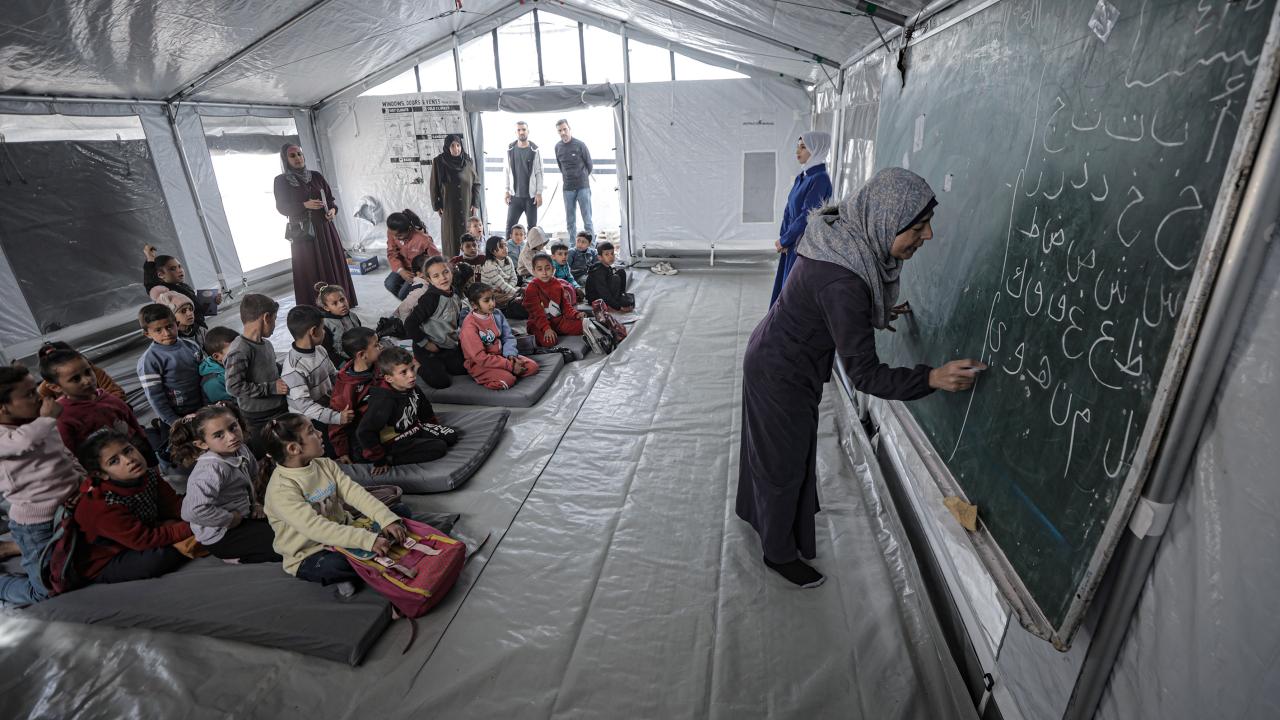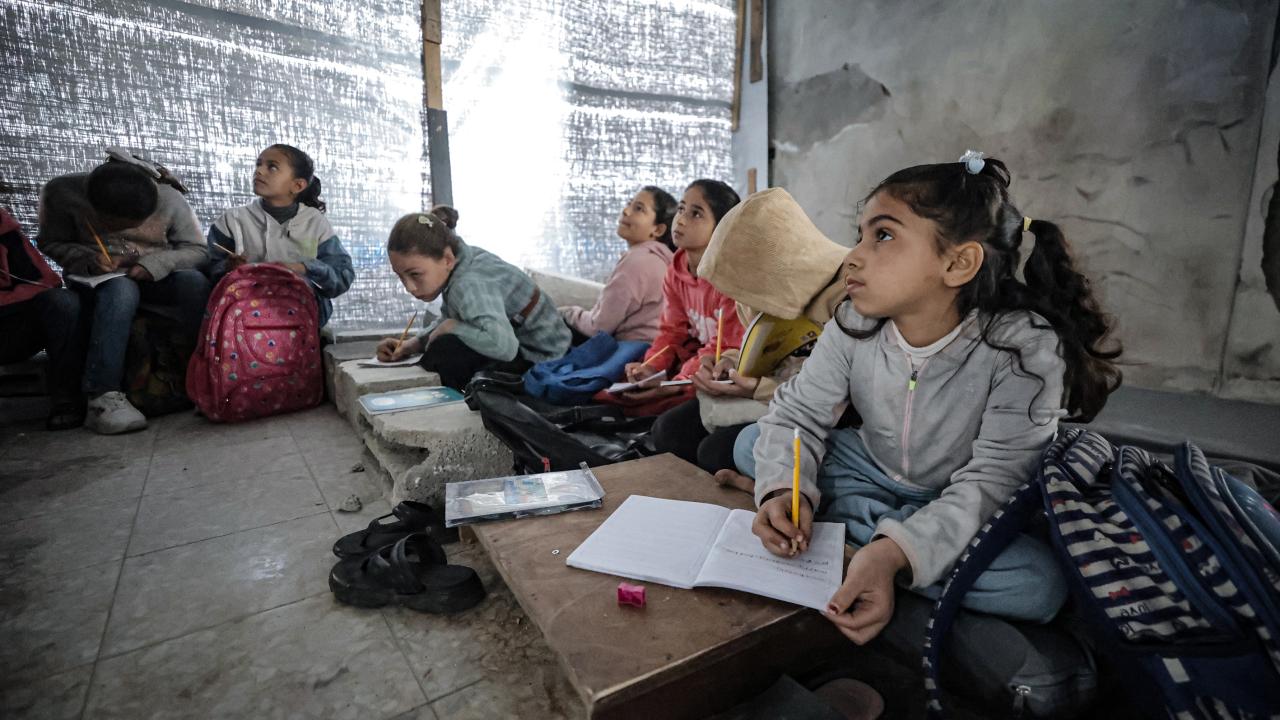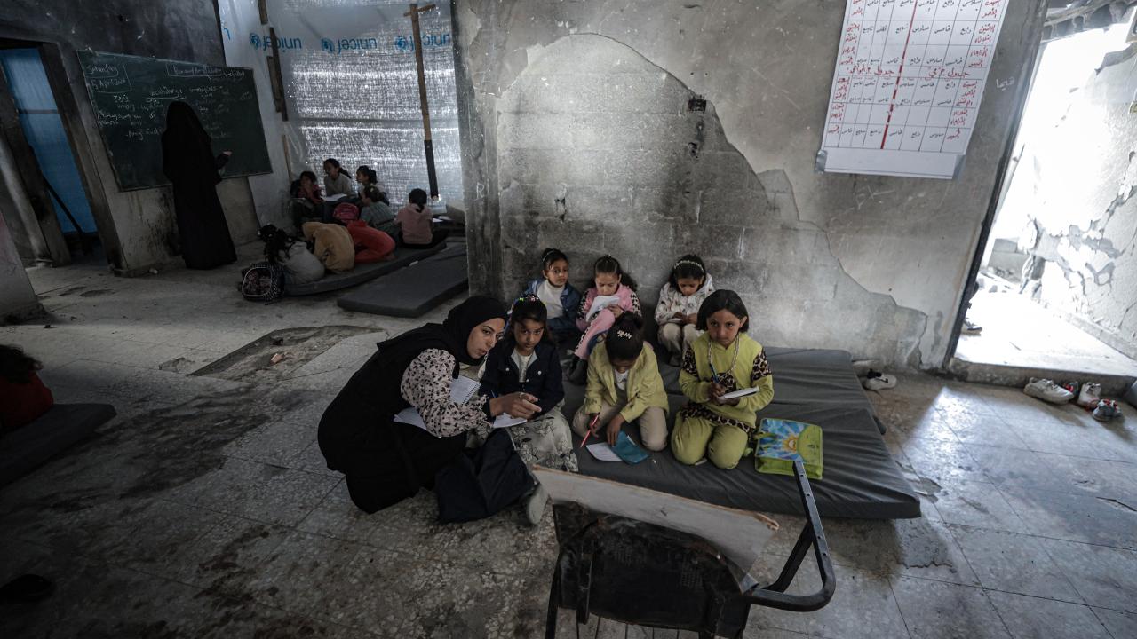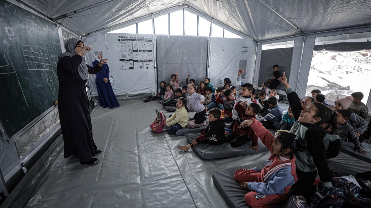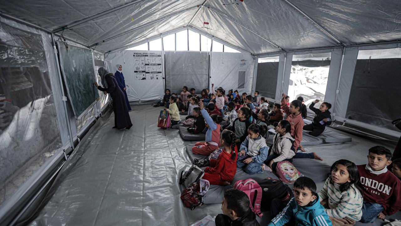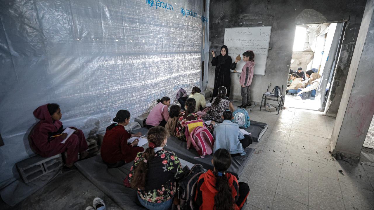 Gazze Şeridi’nin kuzeyinde, Cibaliye Mülteci Kampı’nda gönüllüler tarafından verilen ücretsiz temel eğitim kapsamında, ağır hasar görmüş bir okulun sınıflarının duvarları çadırlarla kapatılan ve sınıf malzemelerinden yoksun öğrenciler, soğuk hava koşullarına rağmen zemine oturarak derslerini sürdürüyor.
