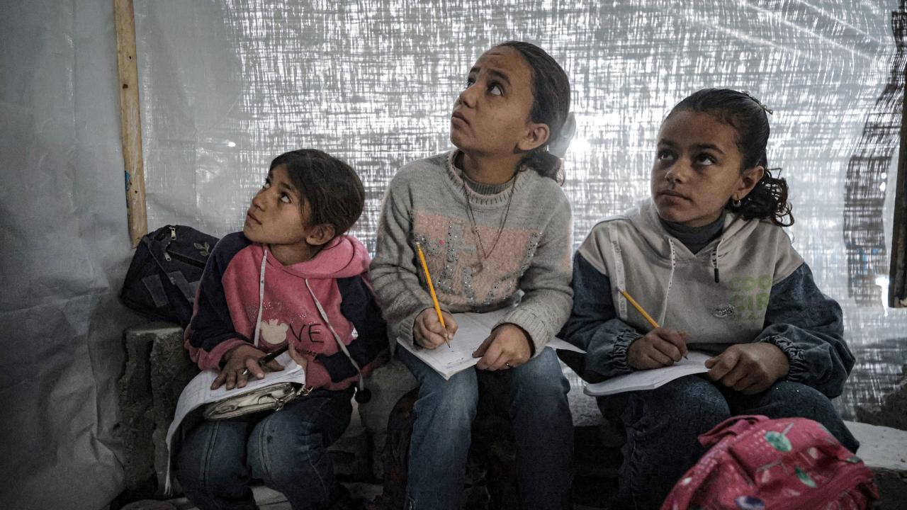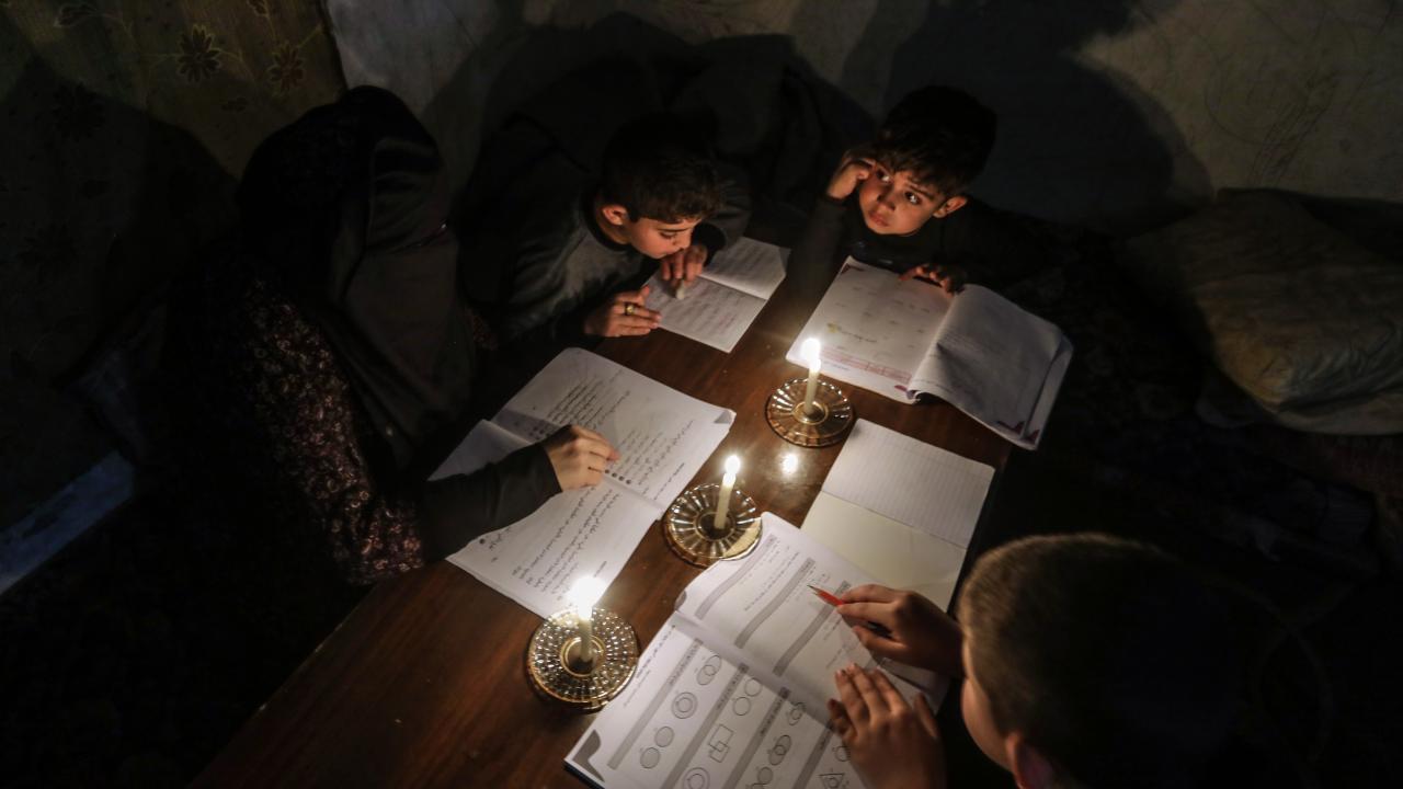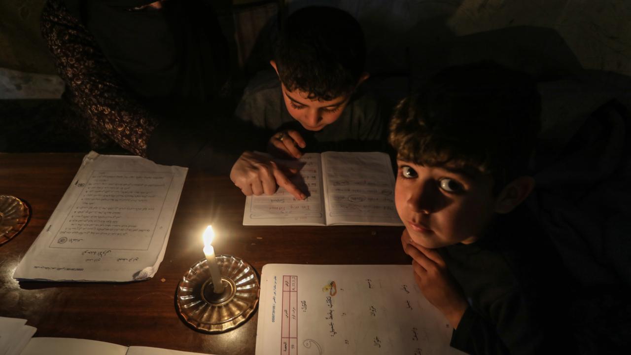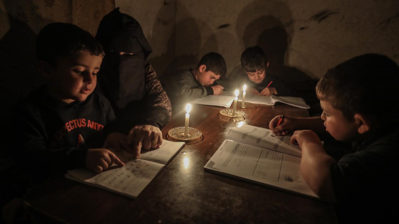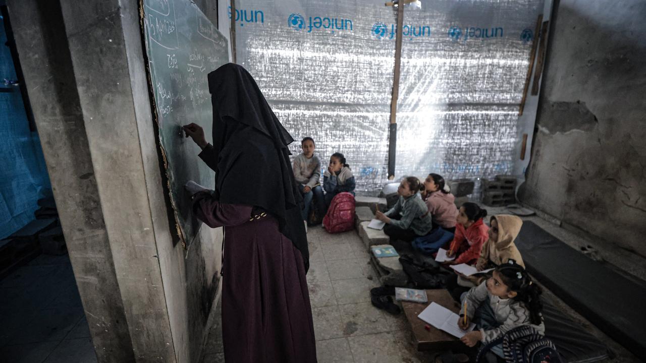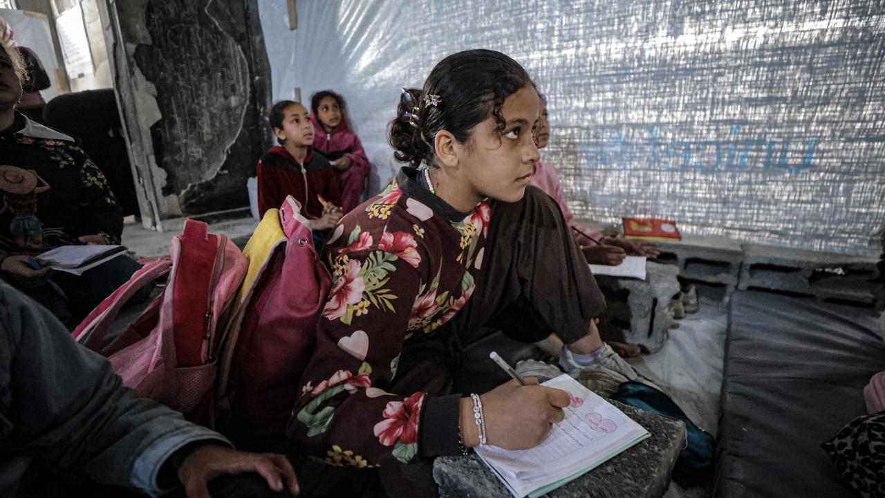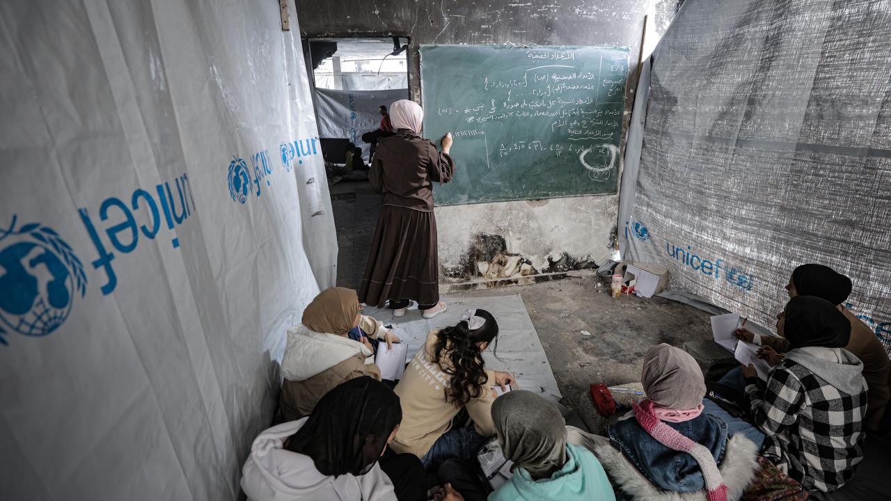 Gazze Şeridi’nin kuzeyinde, Cibaliye Mülteci Kampı’nda gönüllüler tarafından verilen ücretsiz temel eğitim kapsamında, ağır hasar görmüş bir okulun sınıflarının duvarları çadırlarla kapatılan ve sınıf malzemelerinden yoksun öğrenciler, soğuk hava koşullarına rağmen zemine oturarak derslerini sürdürüyor.