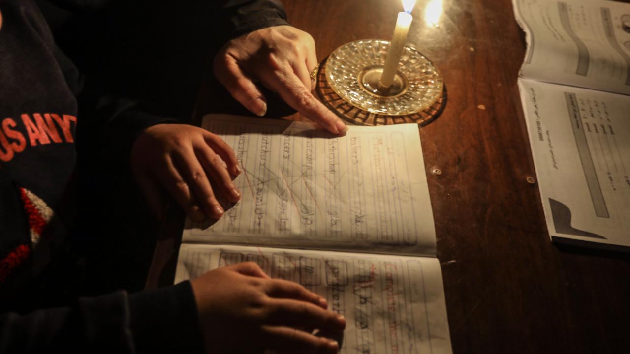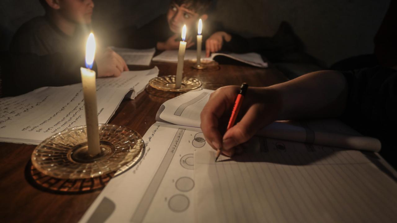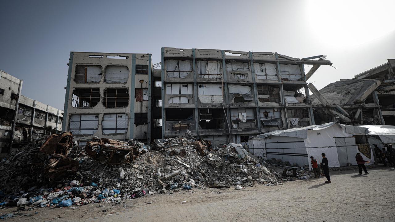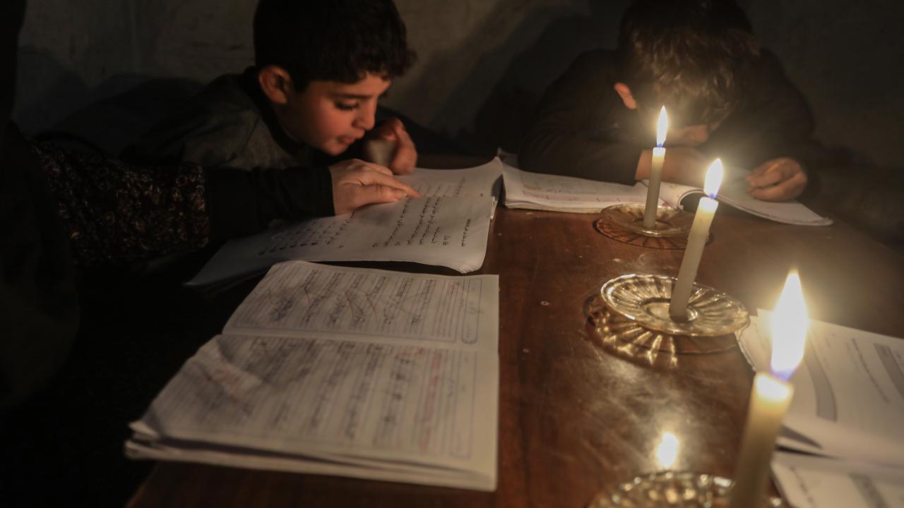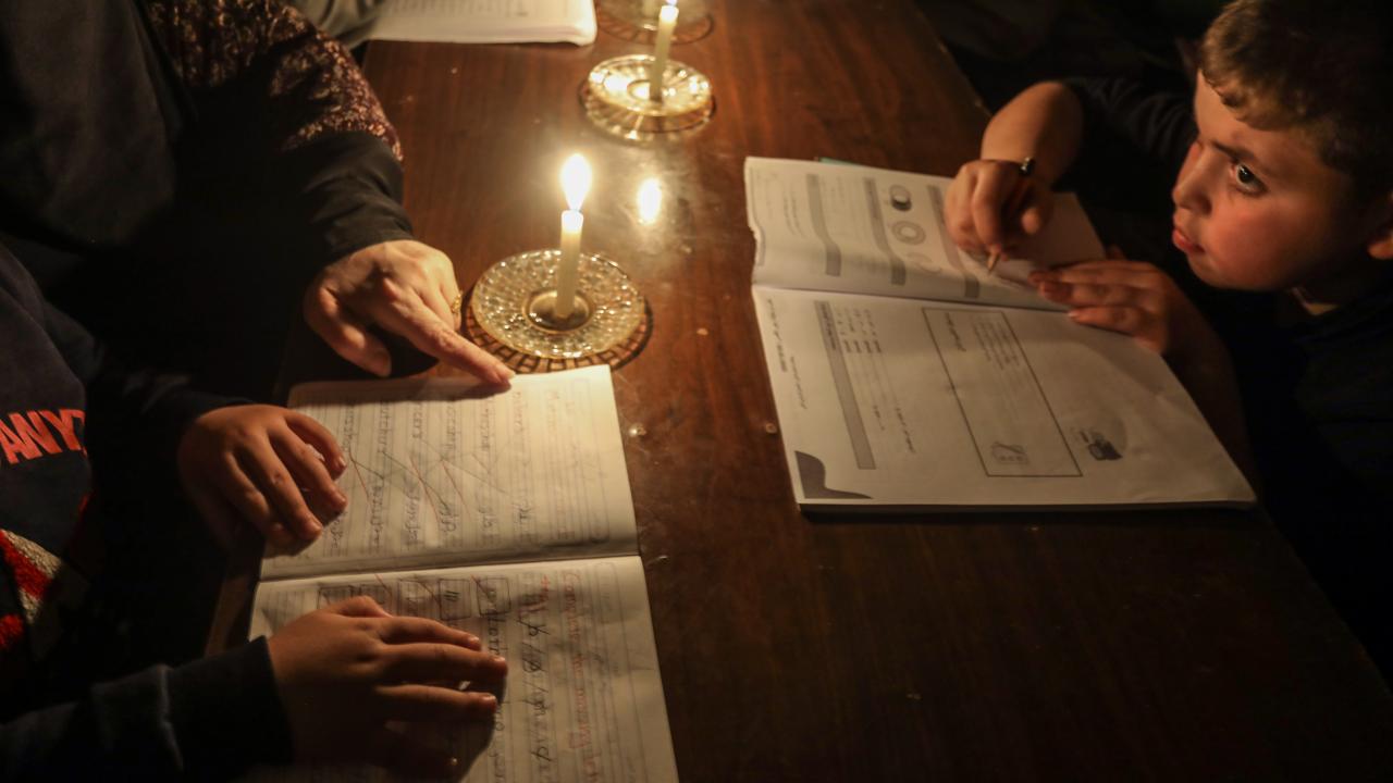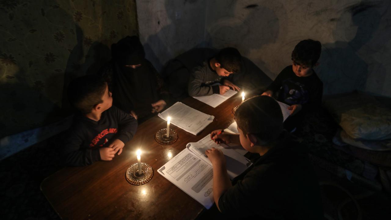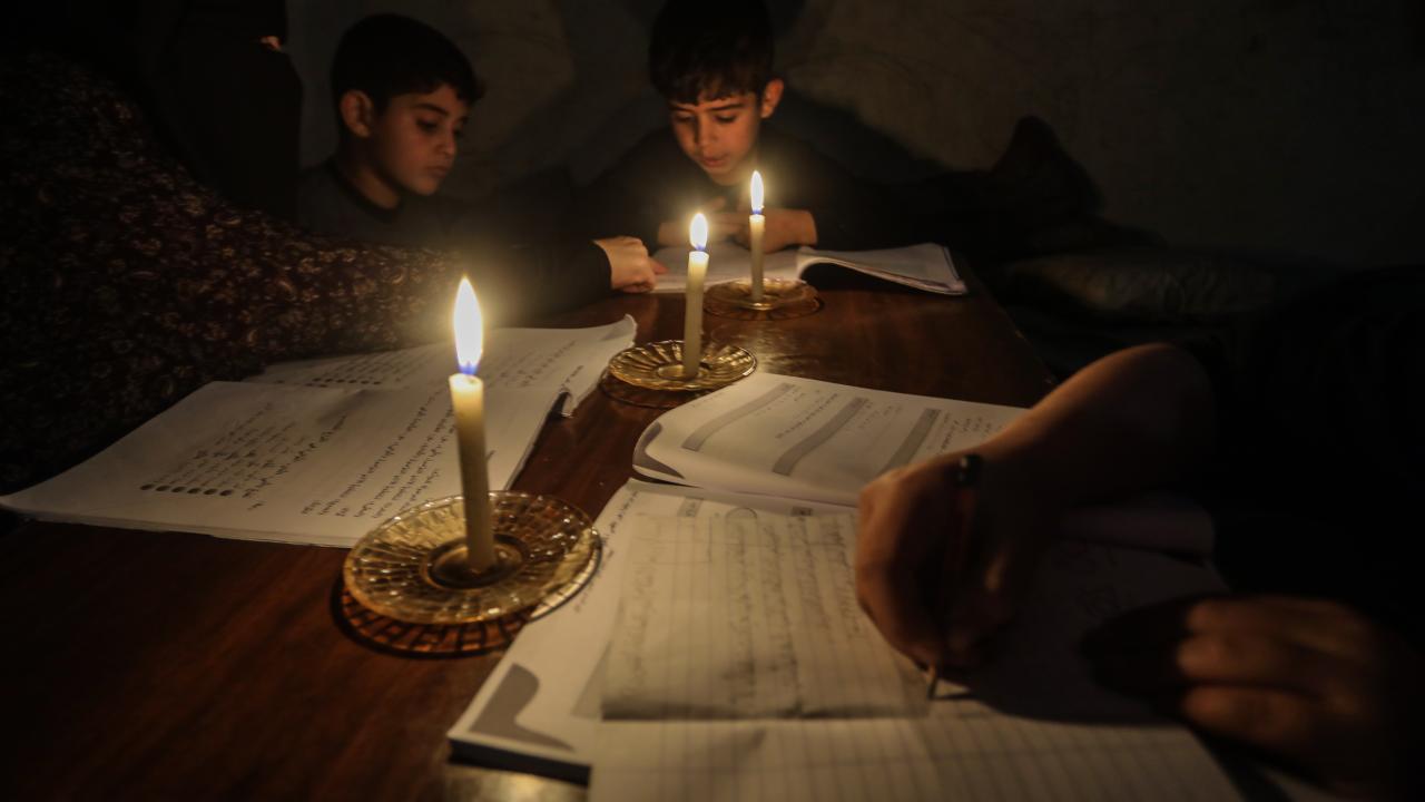 Gazze Şeridi’nin kuzeyinde, Cibaliye Mülteci Kampı’nda gönüllüler tarafından verilen ücretsiz temel eğitim kapsamında, ağır hasar görmüş bir okulun sınıflarının duvarları çadırlarla kapatılan ve sınıf malzemelerinden yoksun öğrenciler, soğuk hava koşullarına rağmen zemine oturarak derslerini sürdürüyor.