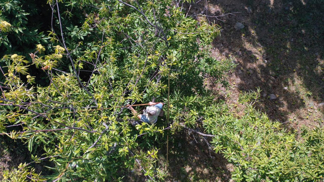 Yüksek ağaçların üzerinde adeta cambaz gibi çalışan sırıkçılardan Sadettin Oğuz da "Yüksek olduğu için riskli. Kestanelerin dikeni gözlerimize, bedenimize denk gelebiliyor. Düşme tehlikesi de var. Biraz ustalık istiyor bu iş." ifadelerini kullandı.