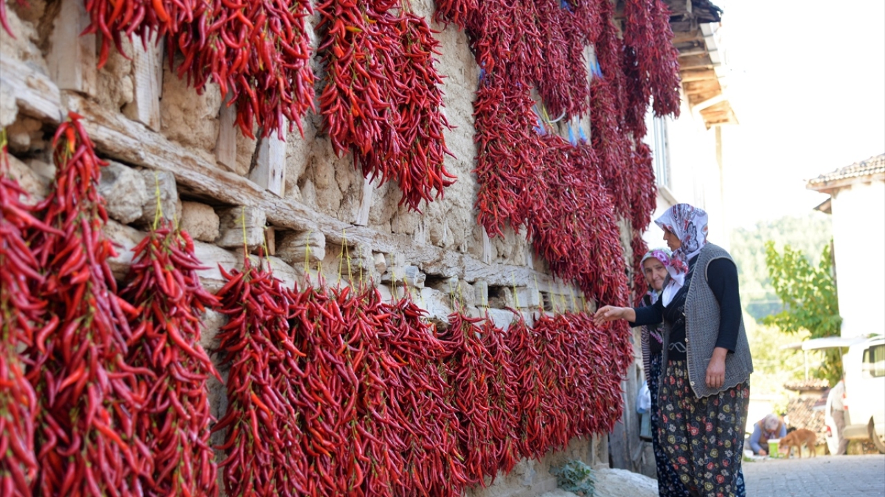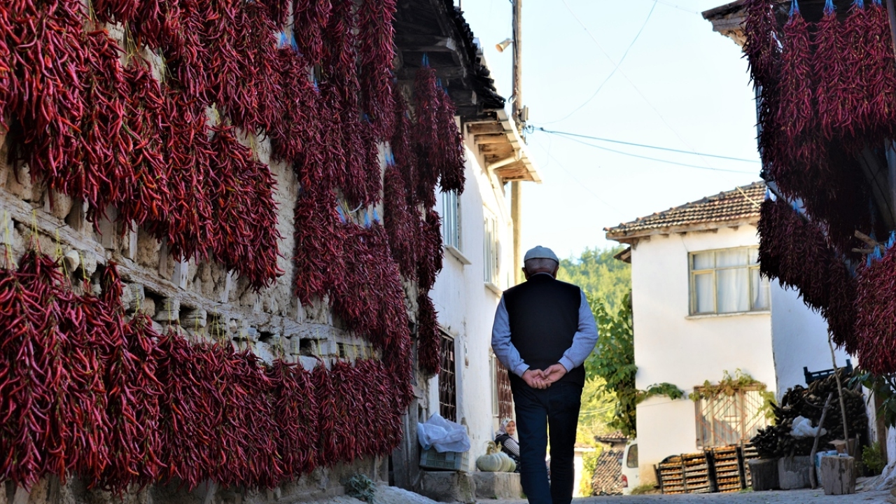 Bilecik merkeze bağlı Çukurören köyünde 150 yıldır yetiştirilen ve Türk Patent ve Marka Kurumunca coğrafi işaret belgesiyle tescillenen kırmızı biber, köylüler tarafından kendilerine özgü yöntemlerle kurutuluyor.