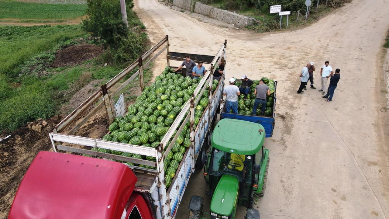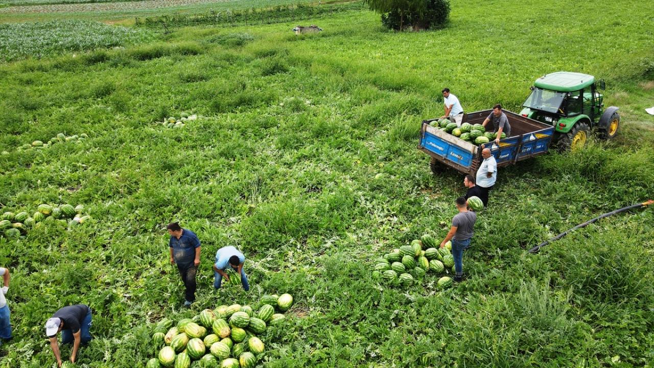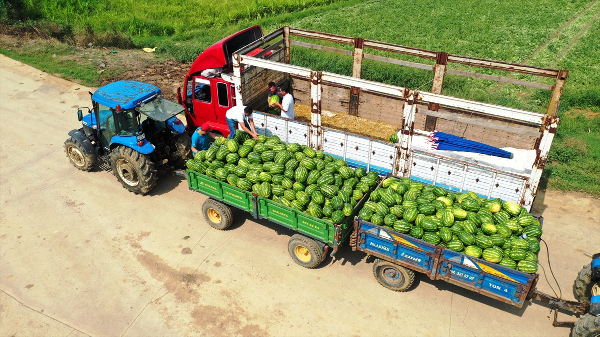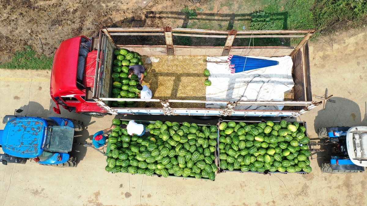Yeterli olgunluğa ulaşan karpuzlar, elle hasat edilerek satış noktalarına gönderiliyor.