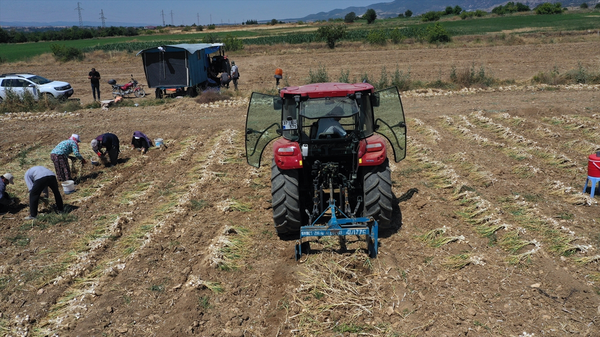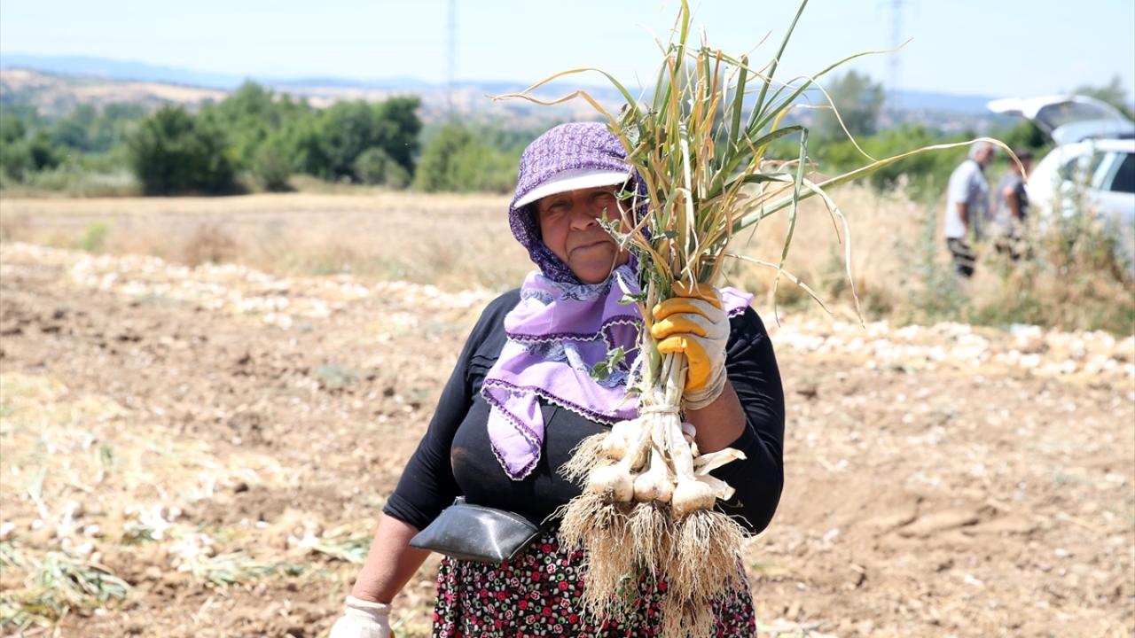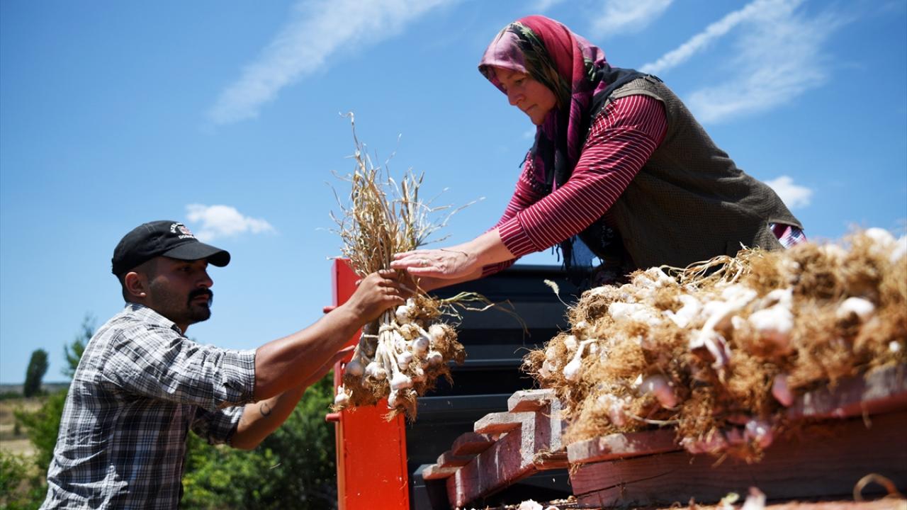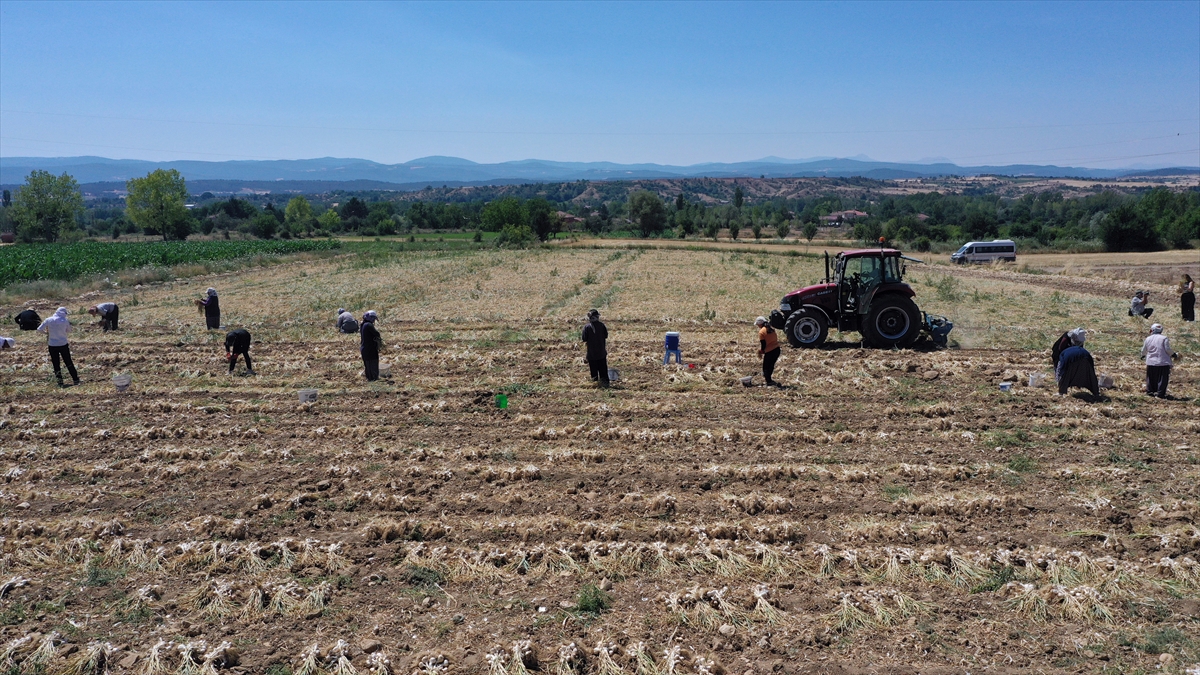 Coğrafi işaretli Taşköprü sarımsağının hasadı kavurucu sıcakta yapılıyor