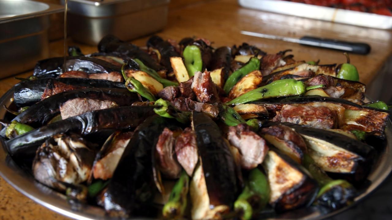Fırında asılarak pişirilen sebzeler ve et, fırının altından toplanan yağın üzerlerine gezdirilmesinin ardından tepsiyle servis ediliyor.