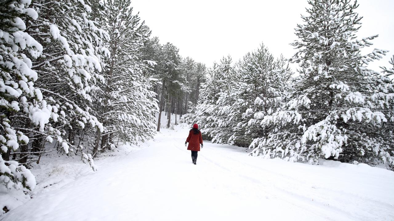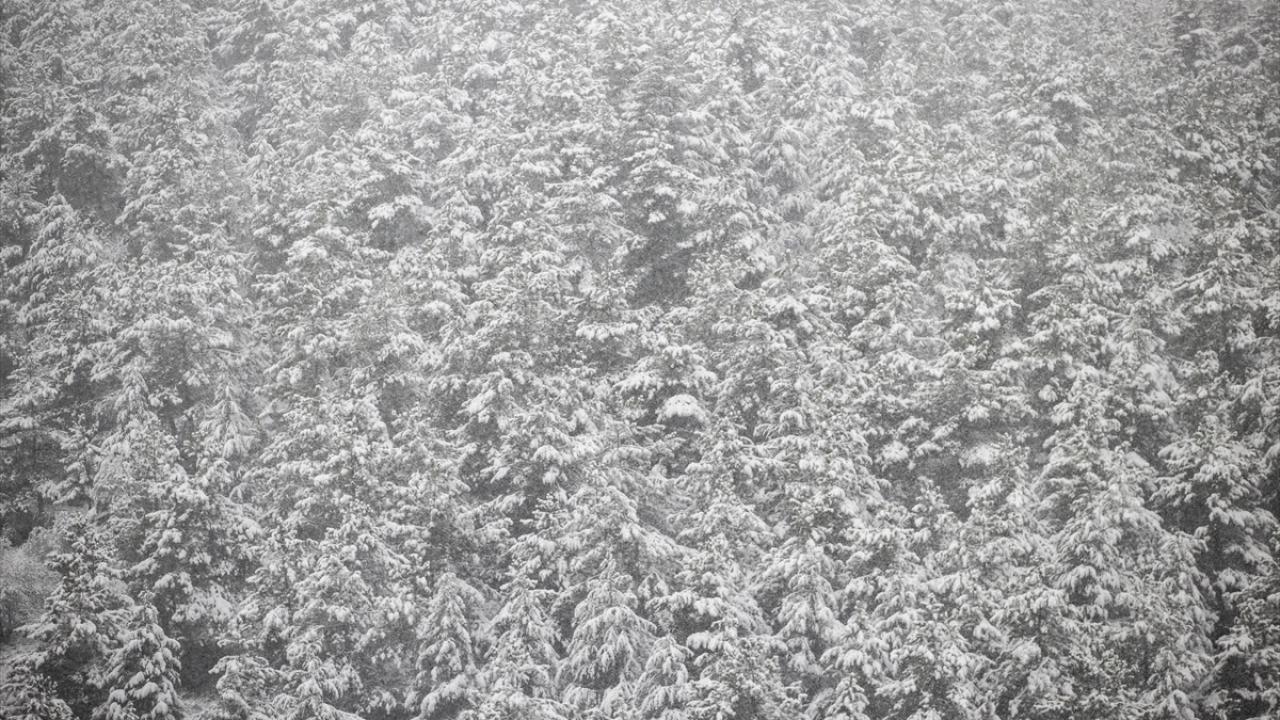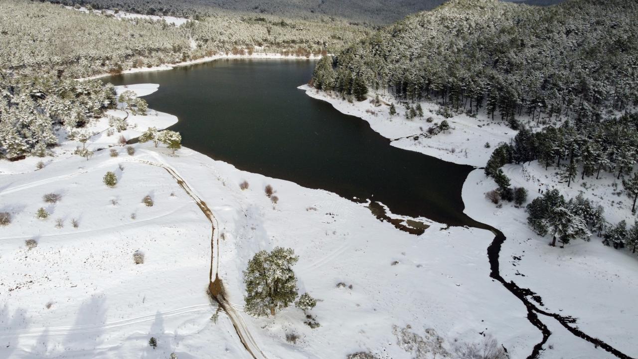 Uşak`ın Banaz ilçesi sınırlarında yer alan yaklaşık 1200 metre yükseklikteki Baltalı Göleti çevresini saran çam ağaçları, kar yağışının ardından beyaza büründü.
