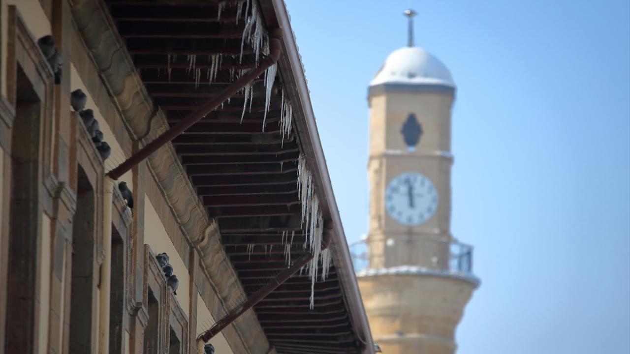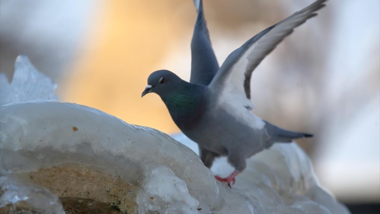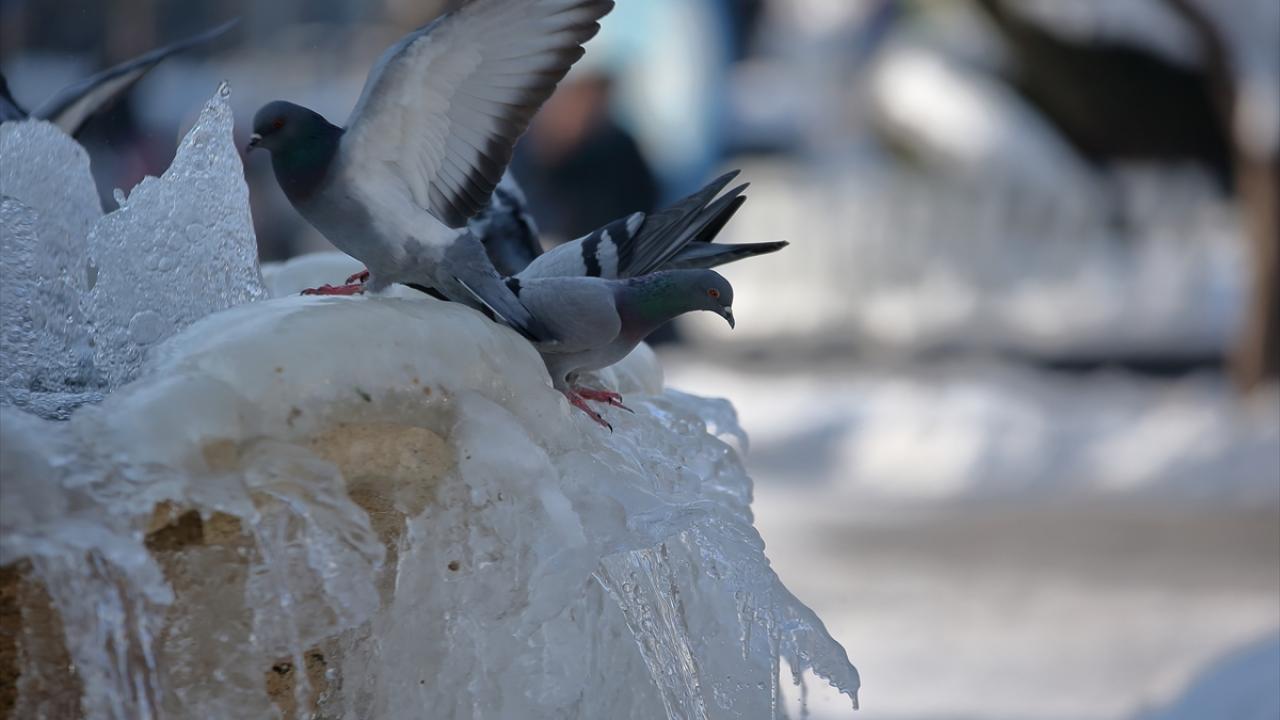 Yüzlerce güvercine ev sahipliği yapan Hürriyet Meydanı`ndaki süs havuzu da buzla kaplandı. Havuzdaki buz sarkıtları, güvercinlerle güzel görüntüler oluşturdu.