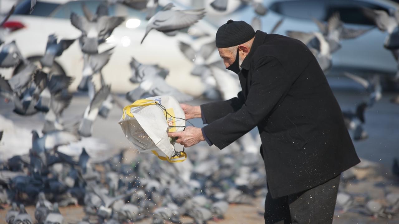 Vatandaşlar, olumsuz hava şartları nedeniyle yiyecek bulmakta zorlanan güvercinler için havuz çevresine yem bıraktı.
