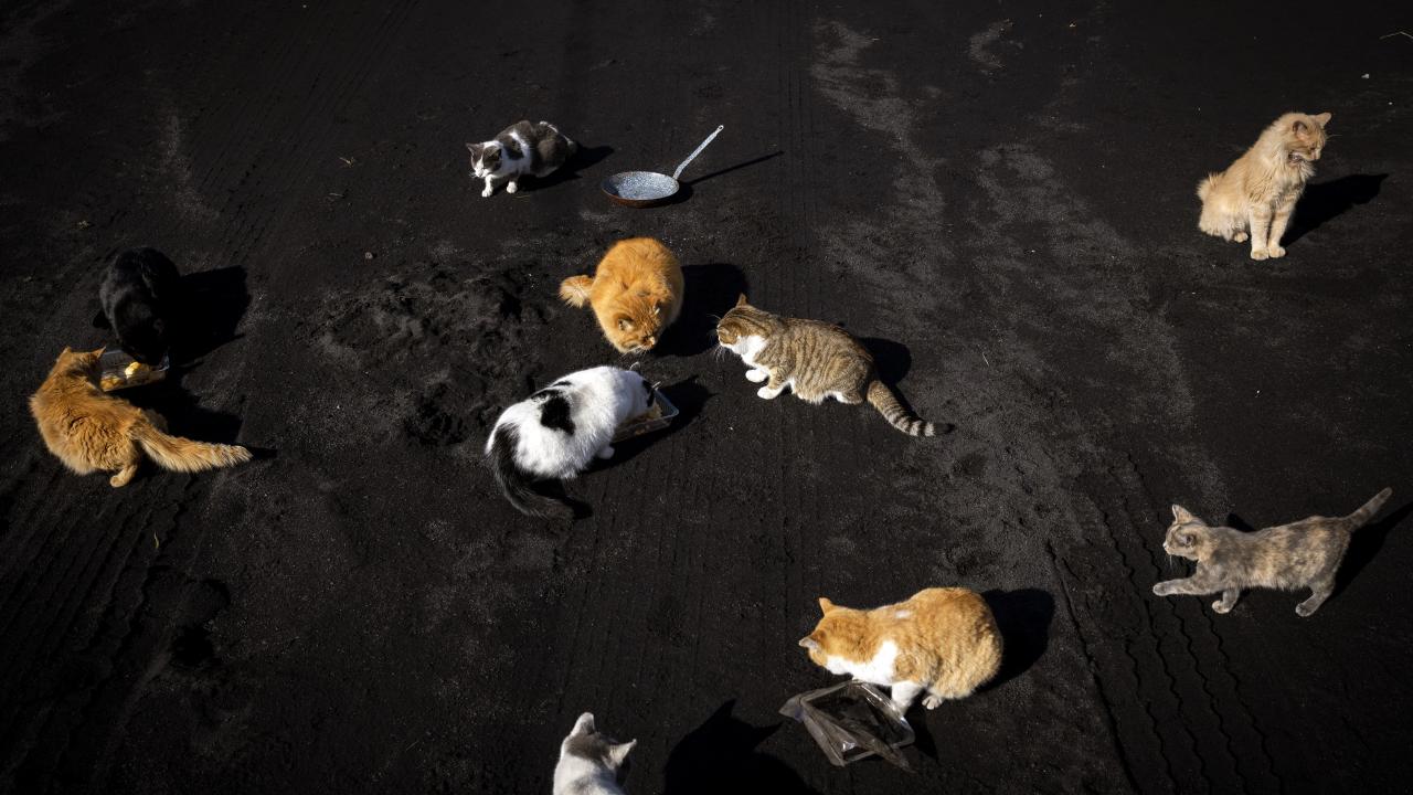 İspanya'da, 19 Eylül'den bu yana aktif olan Cumbre Vieja Yanardağı ardında küller bıraktı. Evler, halı sahalar, yollar, her yer kül altında kaldı. Yetkililer bir yandan külleri temizlerken, yanardağ diğer taraftan lav püskürtmeye devam ediyor. Kediler de küllerin arasında yemek arıyor.