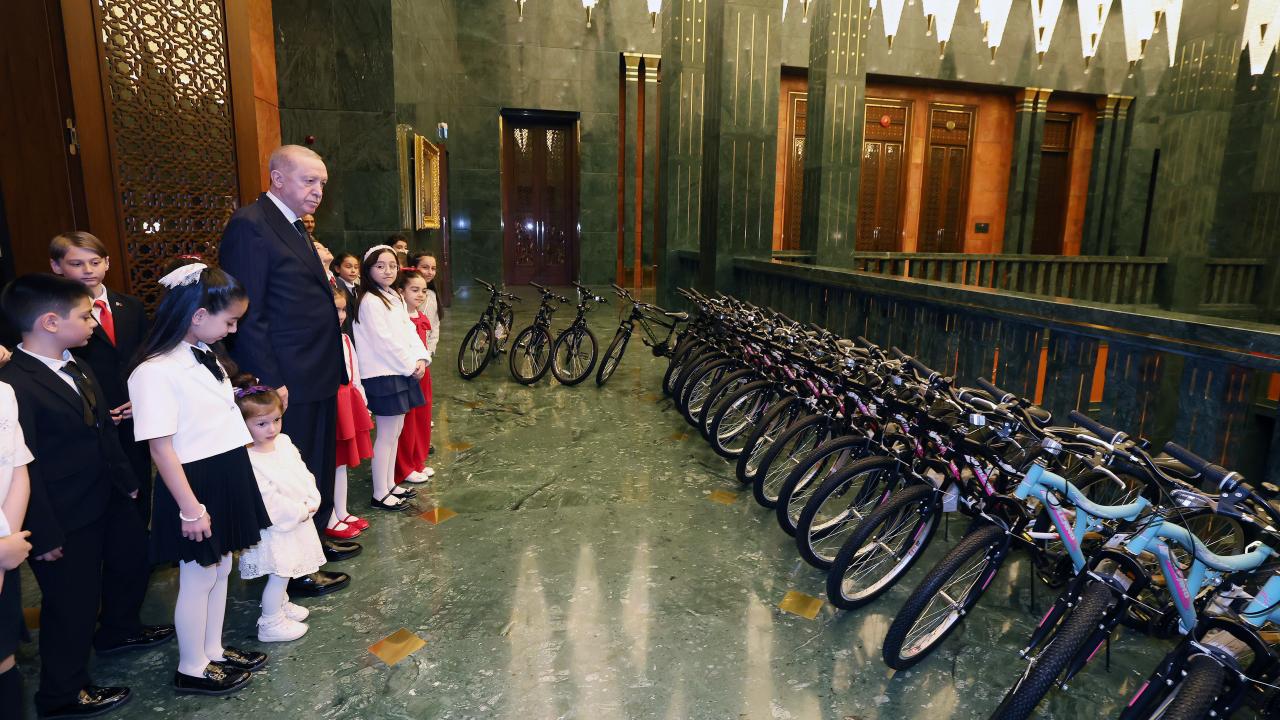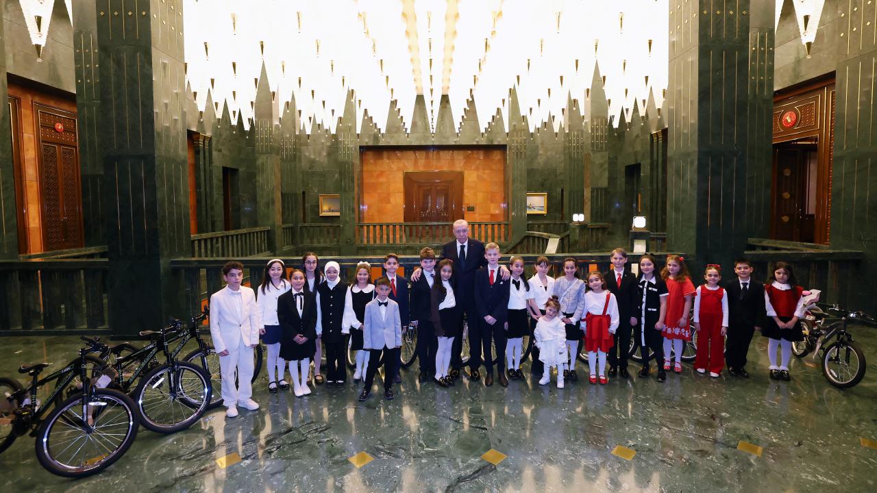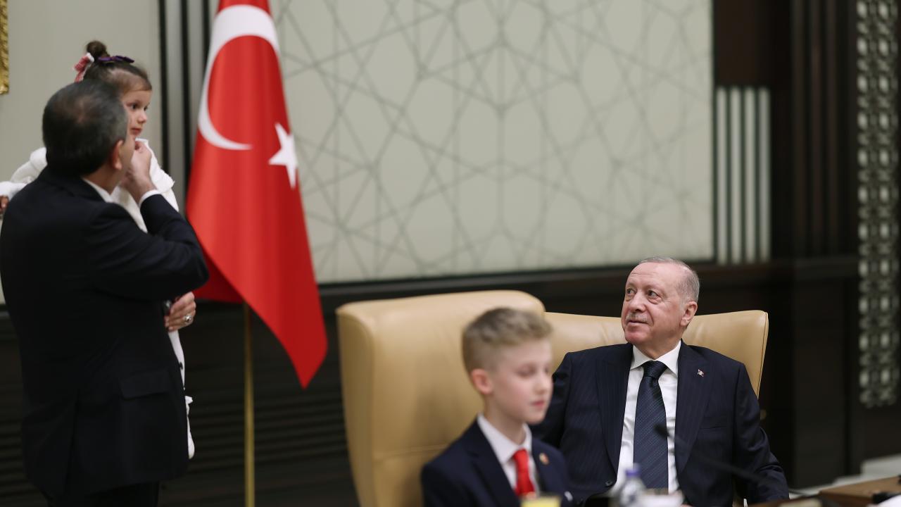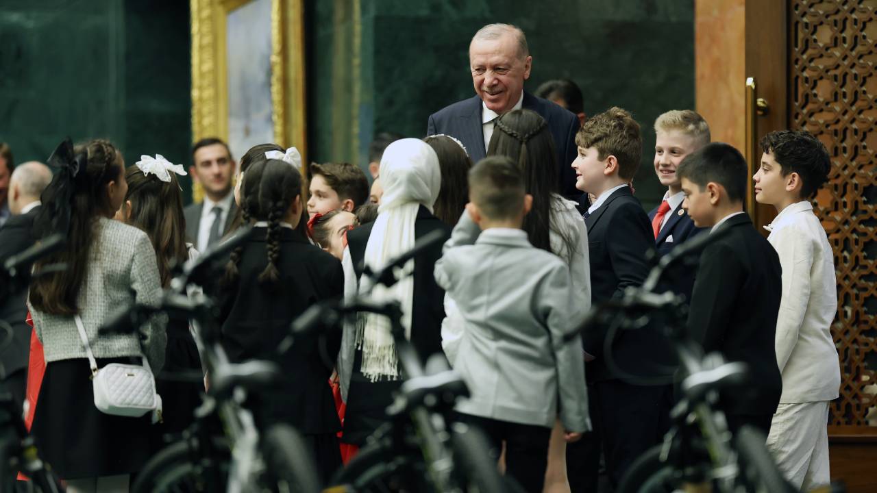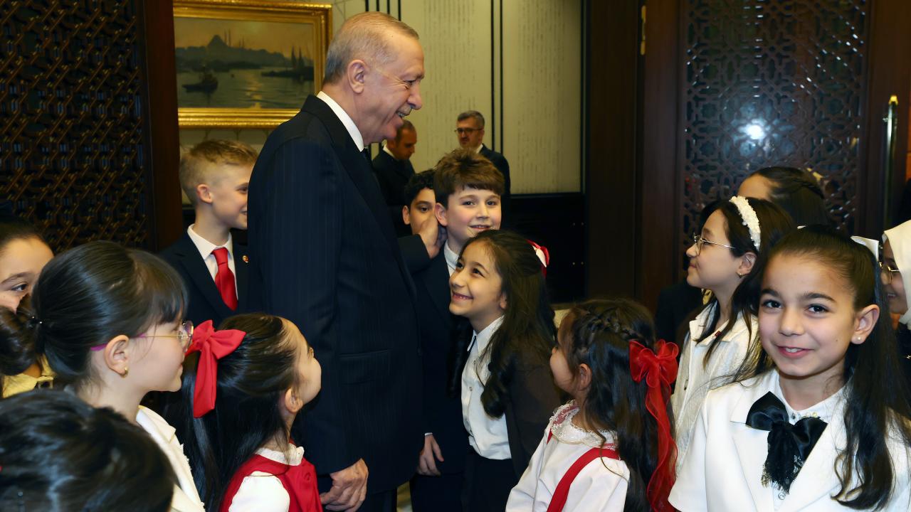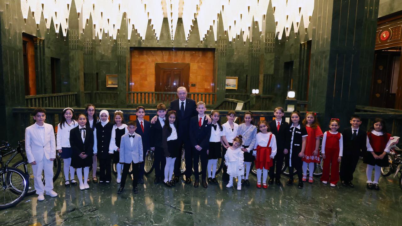 Cumhurbaşkanı Recep Tayyip Erdoğan, 23 Nisan Ulusal Egemenlik ve Çocuk Bayramı ile TBMM'nin 106. açılış yıl dönümü dolayısıyla Cumhurbaşkanlığı Külliyesi'nde Milli Eğitim Bakanı Yusuf Tekin ve beraberindeki çocukları kabul etti.