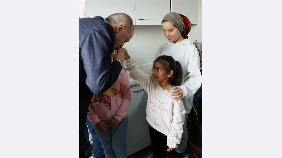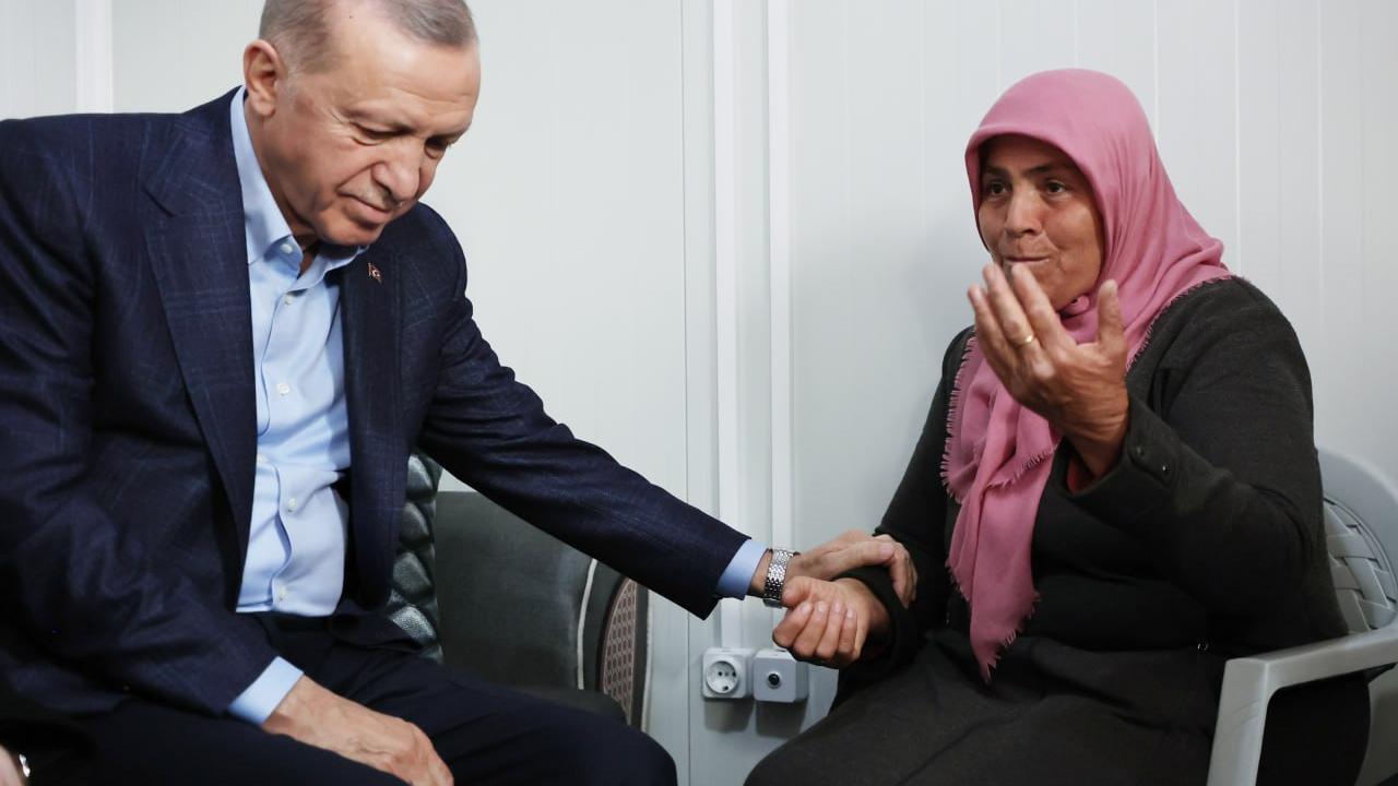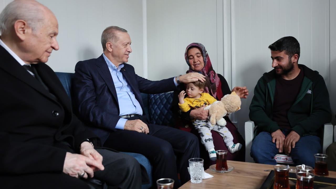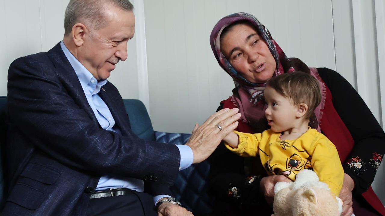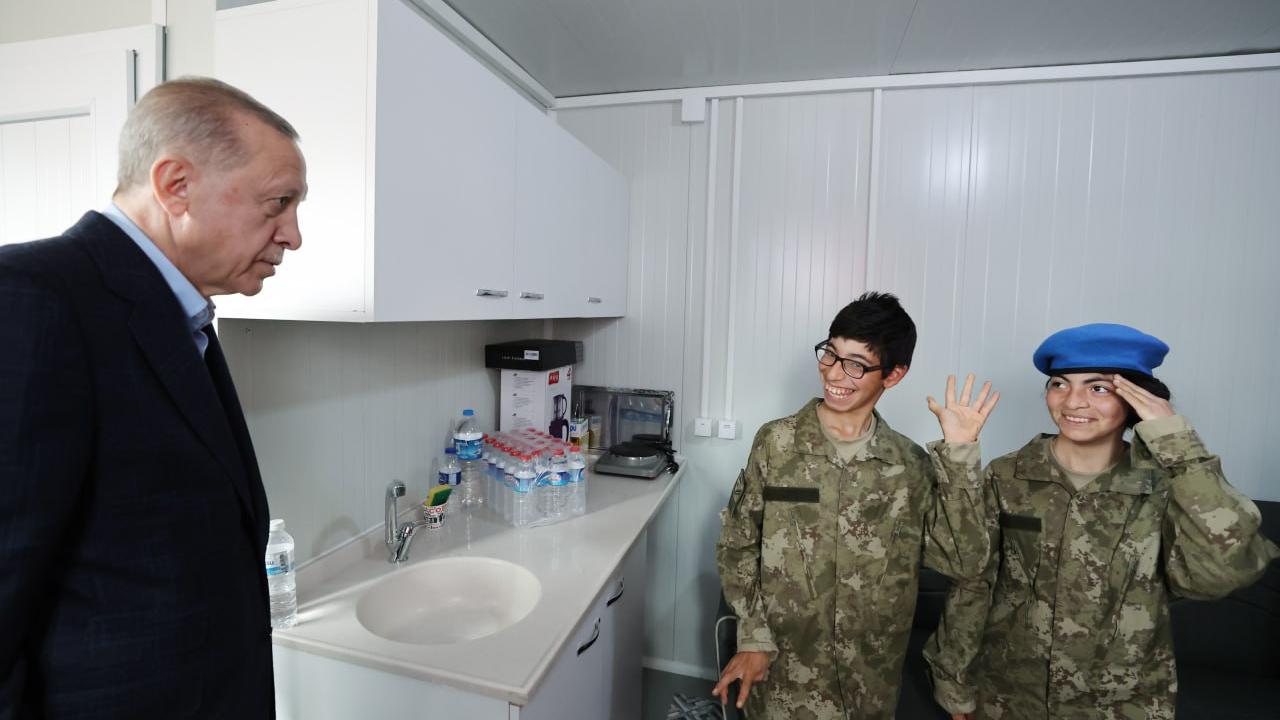 Erdoğan, konteynerlere yerleştirilen ailelerle sohbet etti, depremzedelerin yeni yaşam alanlarını inceledi.
