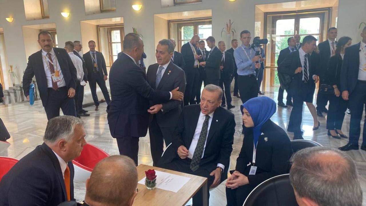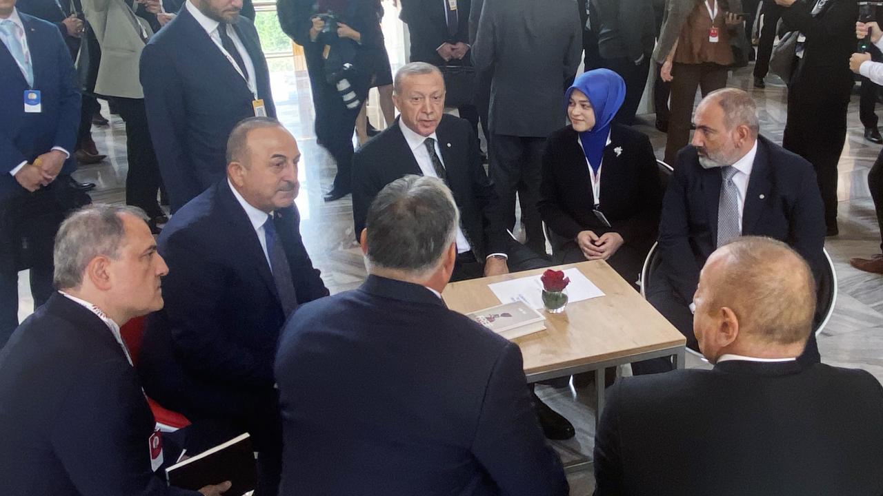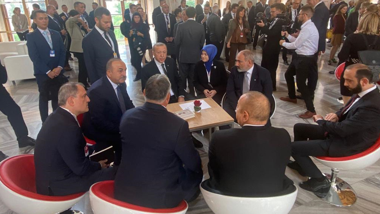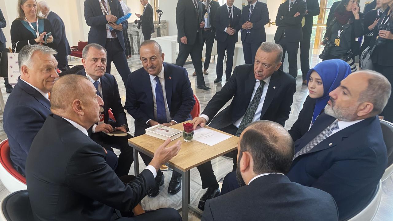 Toplantının yapılacağı Prag Kalesi`ne gelen Cumhurbaşkanı Erdoğan, fuaye alanında Azerbaycan Cumhurbaşkanı İlham Aliyev ve Ermenistan Başbakanı Nikol Paşinyan ile bir süre sohbet etti.