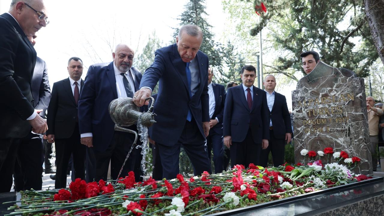 Erdoğan, merhum Alparslan Türkeş`in oğlu, AK Parti Ankara Milletvekili Yıldırım Tuğrul Türkeş ile geldiği anıt mezarda dua okudu.