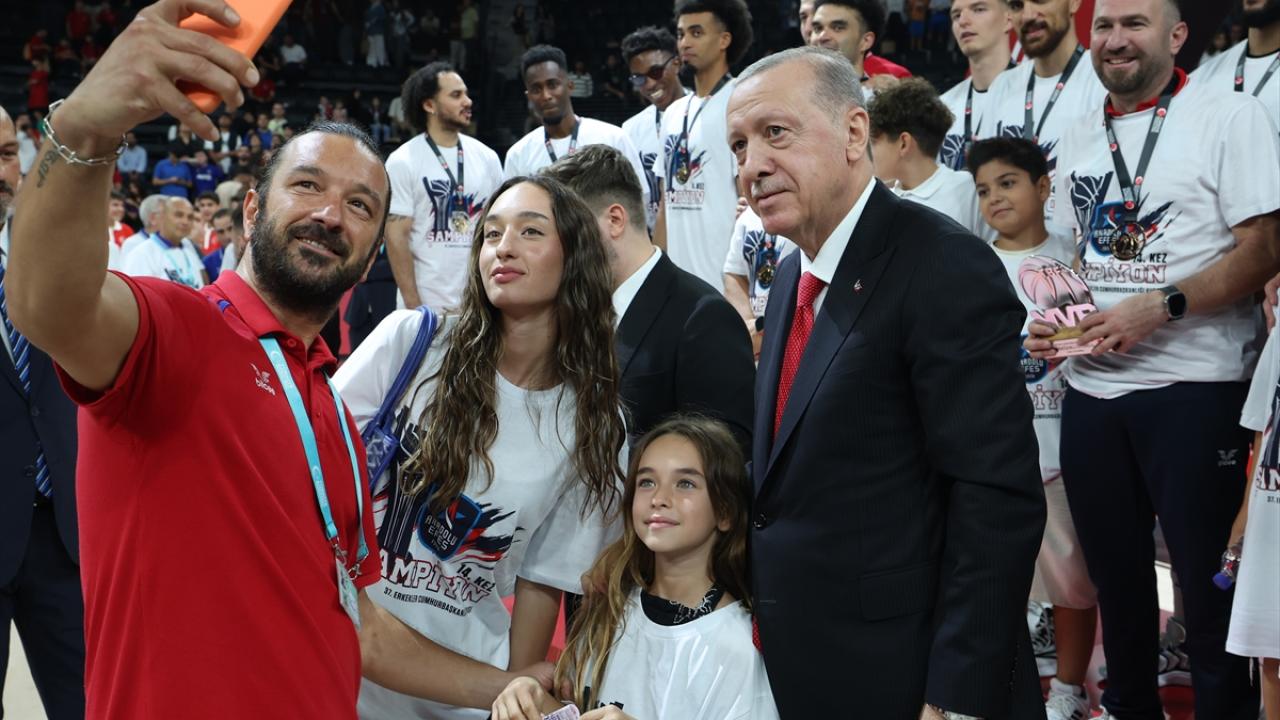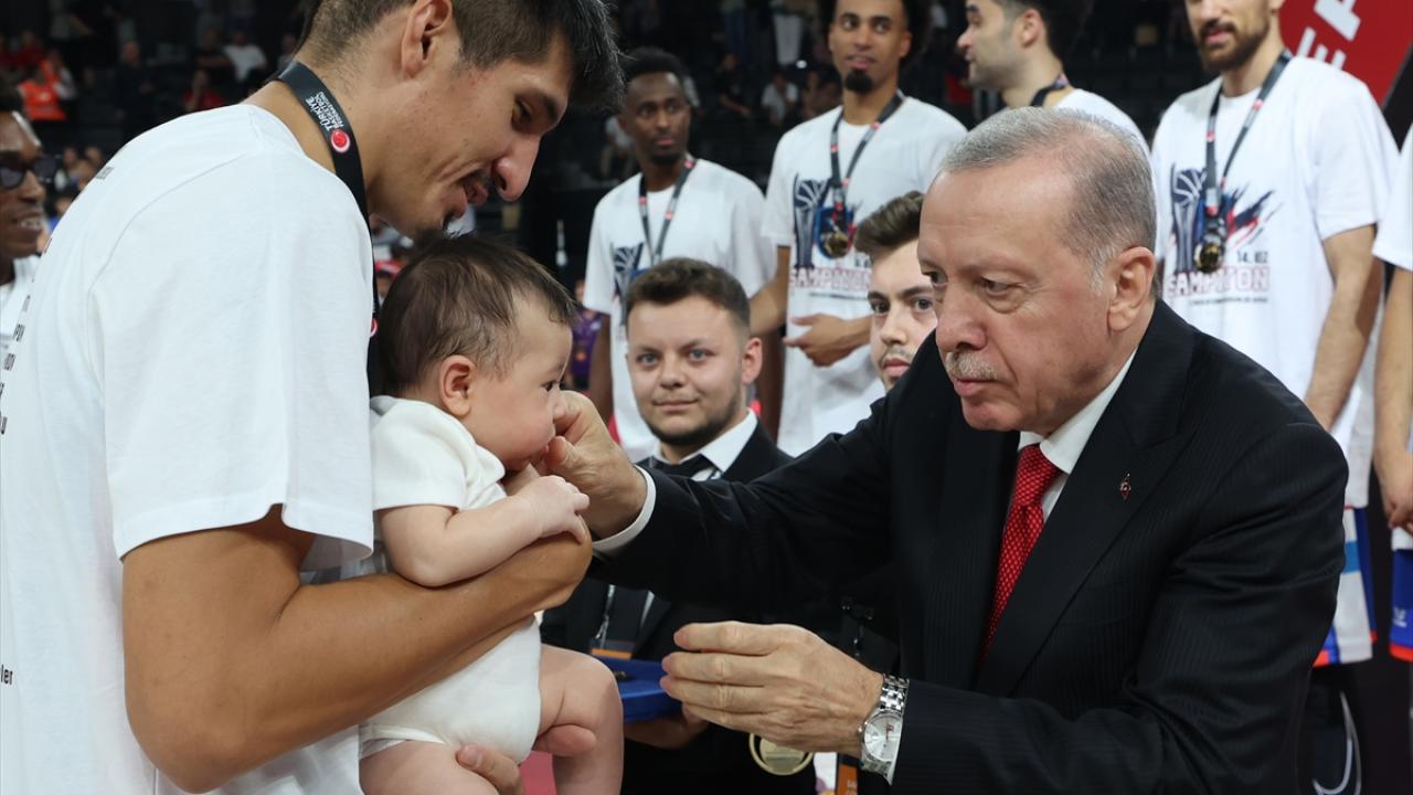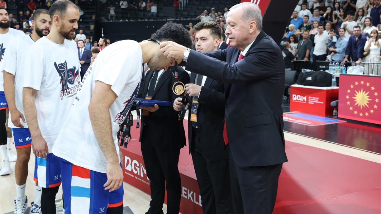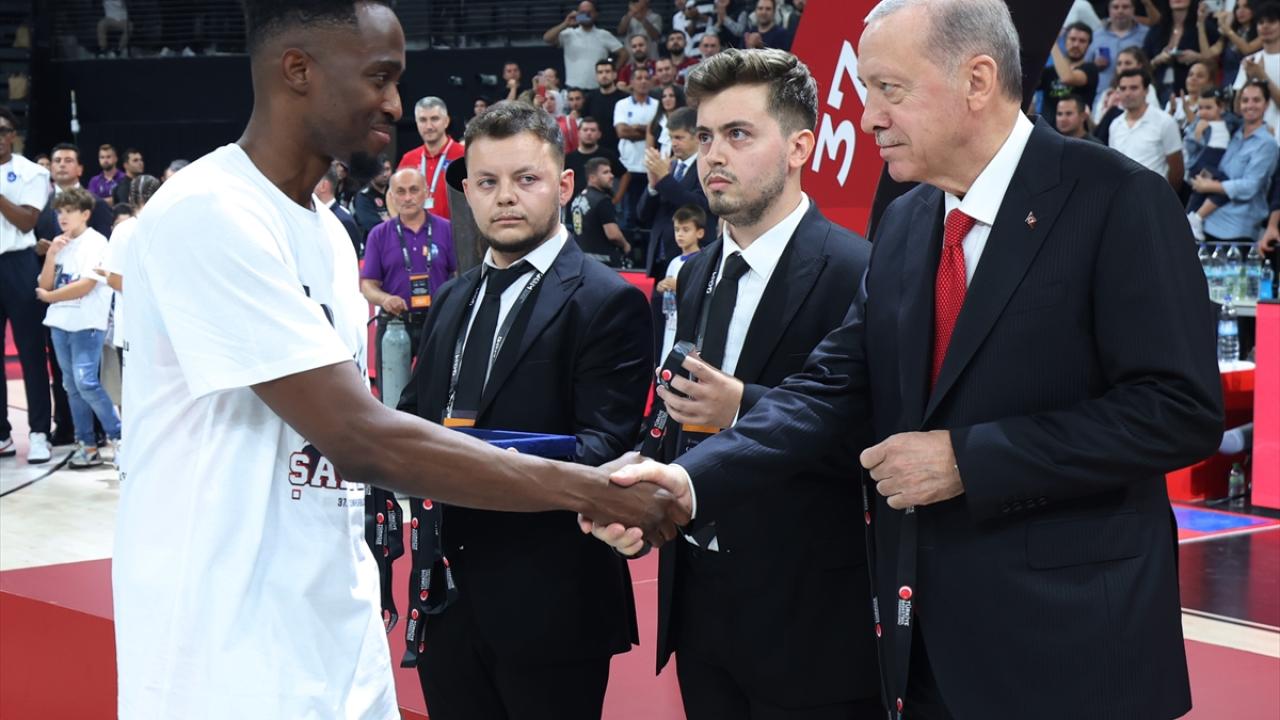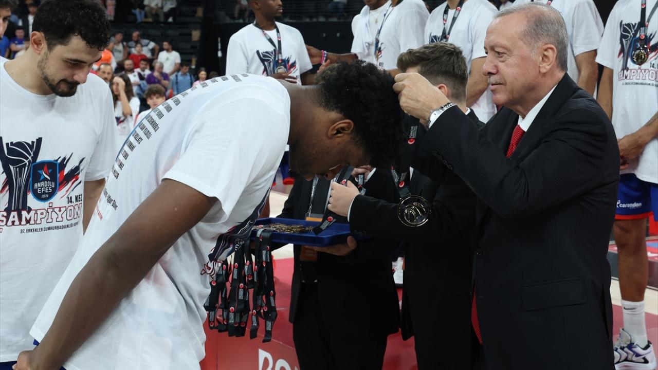 Sporculara madalyalarını takan Erdoğan, kupayı Anadolu Efes takım kaptanı Shane Larkin`e takdim etti.