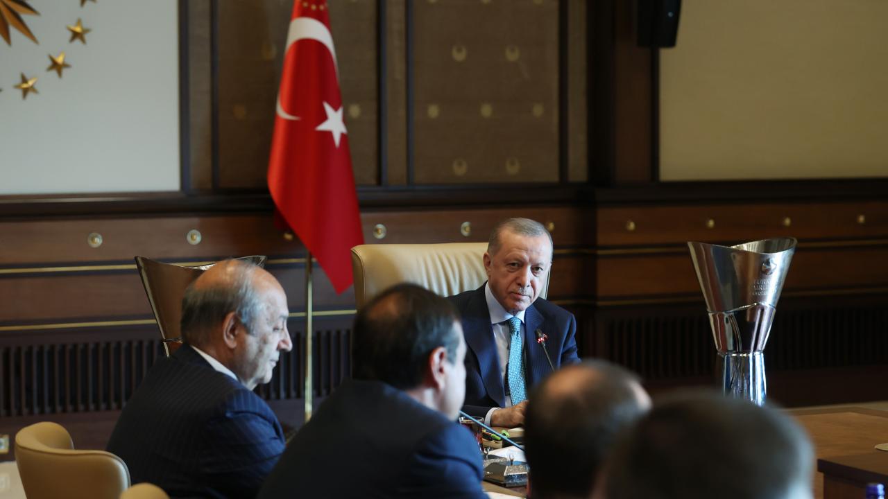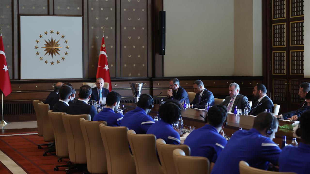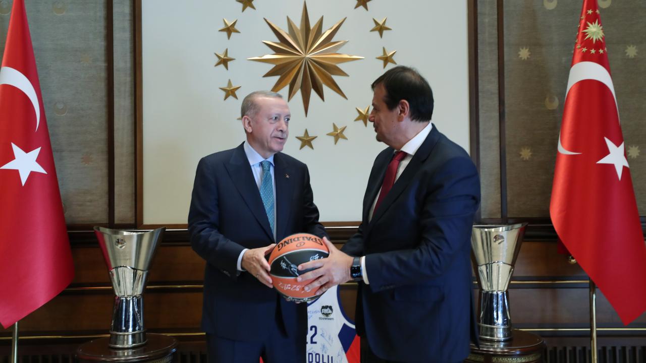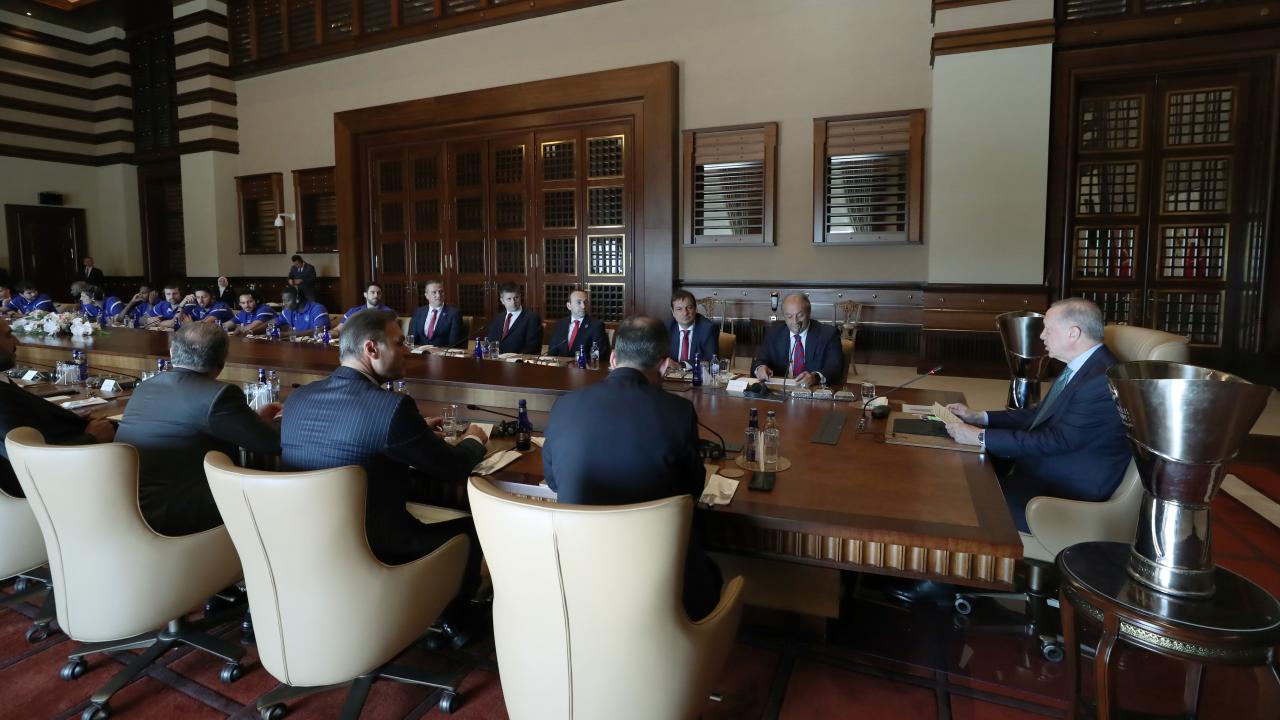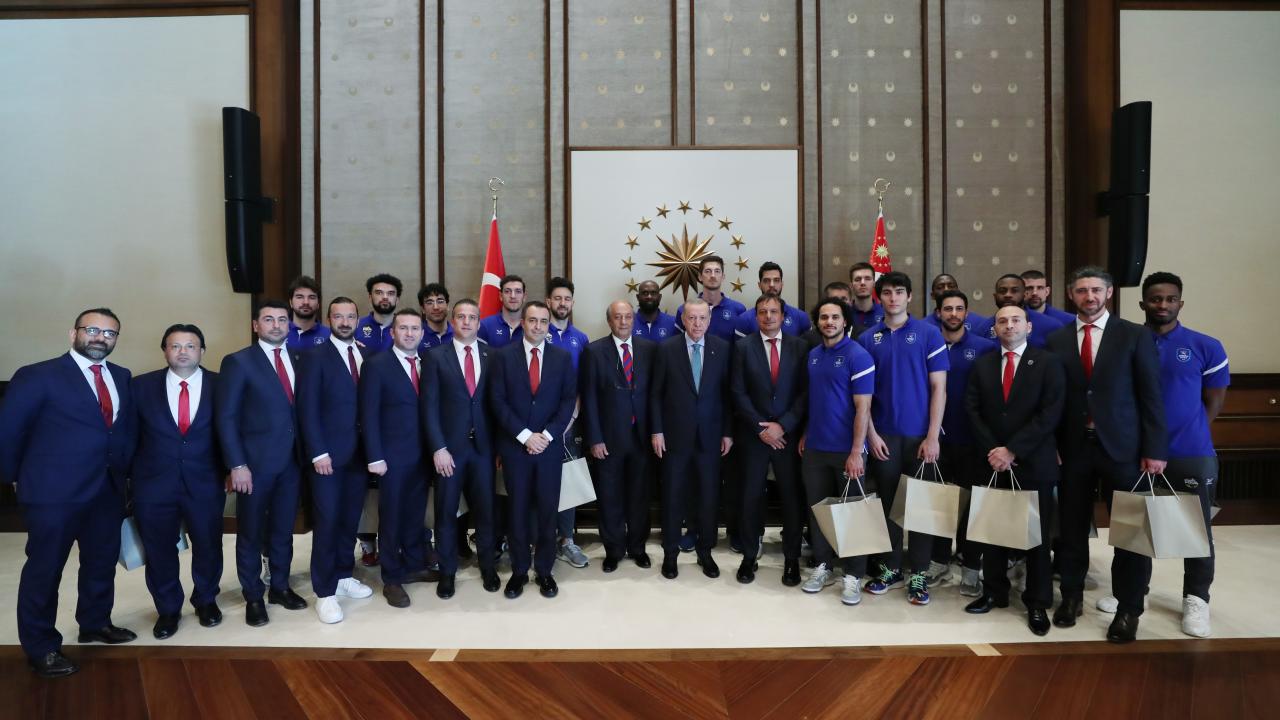Cumhurbaşkanı Recep Tayyip Erdoğan, THY Avrupa Ligi'nde üst üste ikinci kez şampiyon olan Anadolu Efes Spor Kulübü'nün yönetici, teknik heyet ve sporcularını kabul etti.
