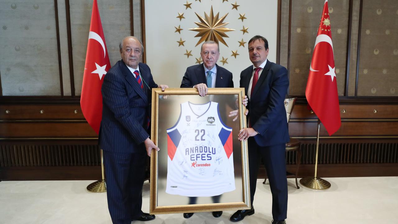 Kabulde, Anadolu Efes Spor Kulübü Başkanı Tuncay Özilhan ve Anadolu Efes Basketbol Takımı Başantrenörü Ergin Ataman, Cumhurbaşkanı Erdoğan`a hediye takdim etti.