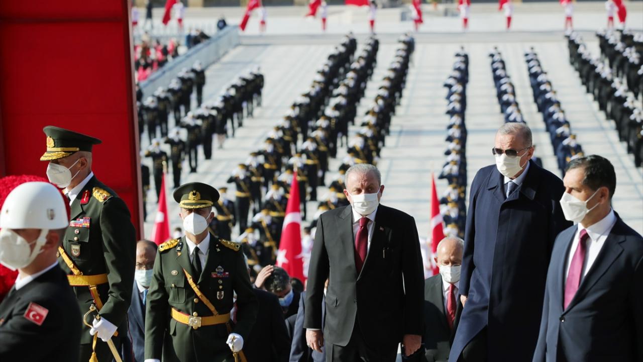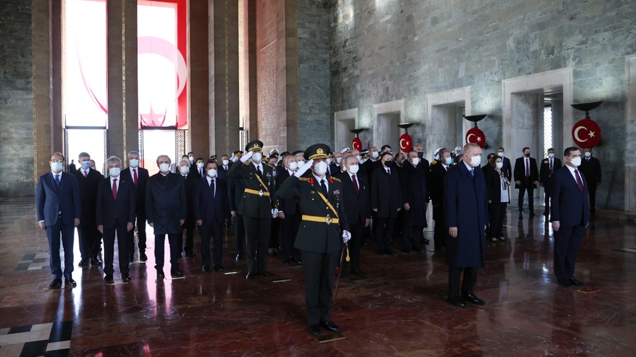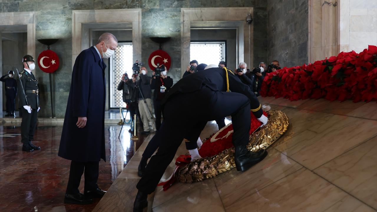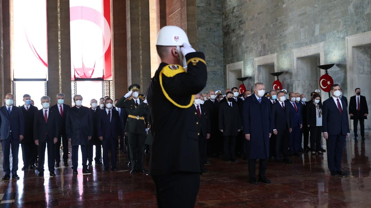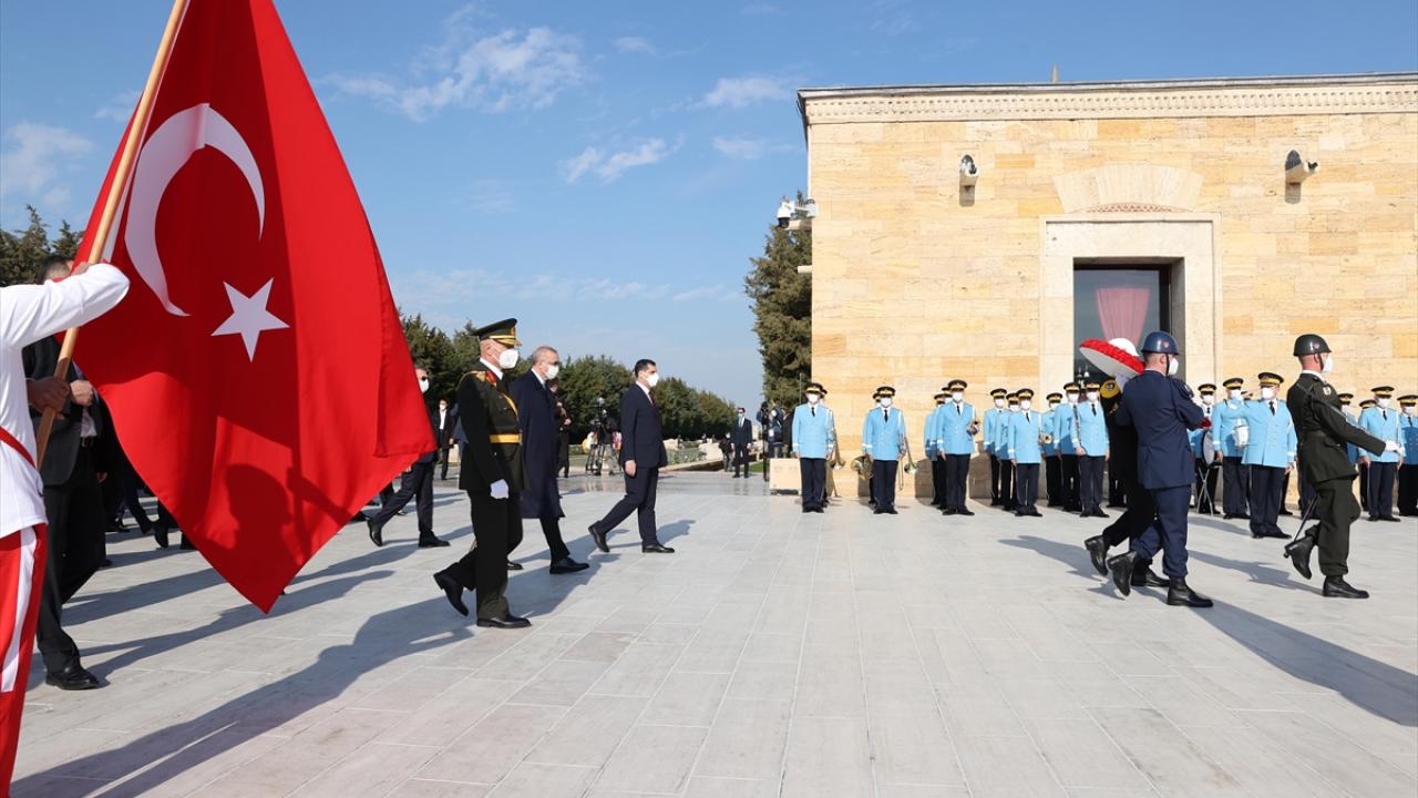 Erdoğan`ın, üzerinde ay yıldız bulunan çelengi Atatürk`ün mozolesine bırakmasının ardından, saygı duruşunda bulunuldu ve İstiklal Marşı okundu.