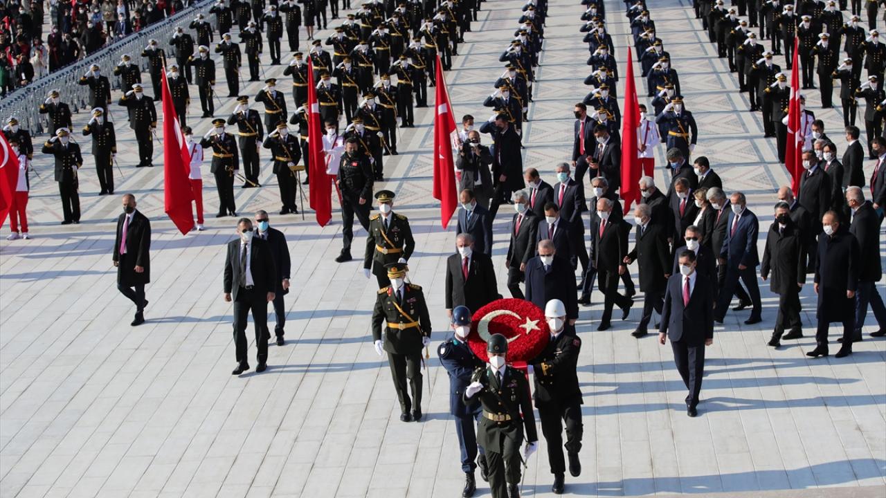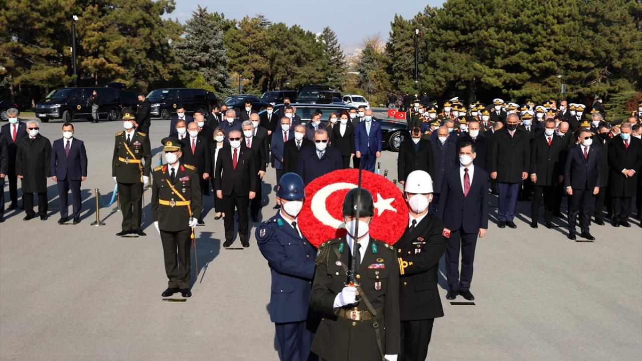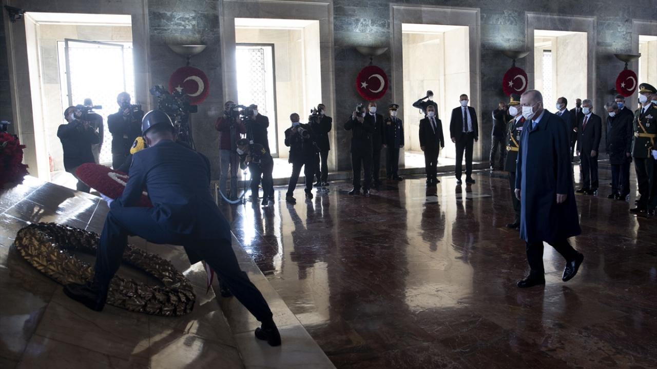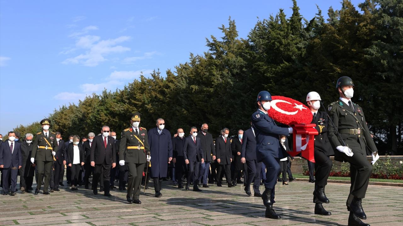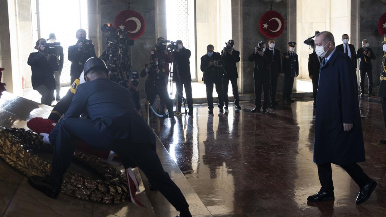 Erdoğan`ın, üzerinde ay yıldız bulunan çelengi Atatürk`ün mozolesine bırakmasının ardından, saygı duruşunda bulunuldu ve İstiklal Marşı okundu.