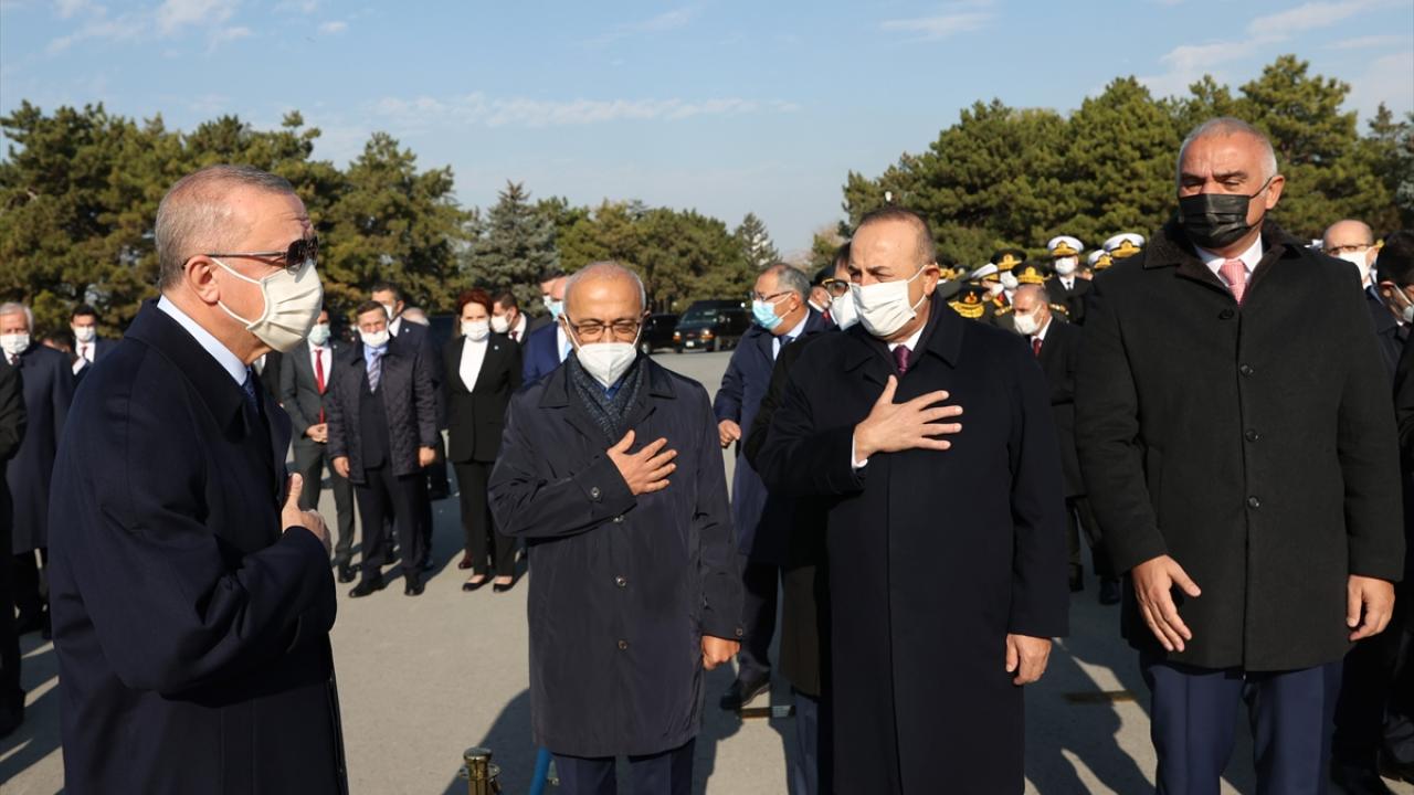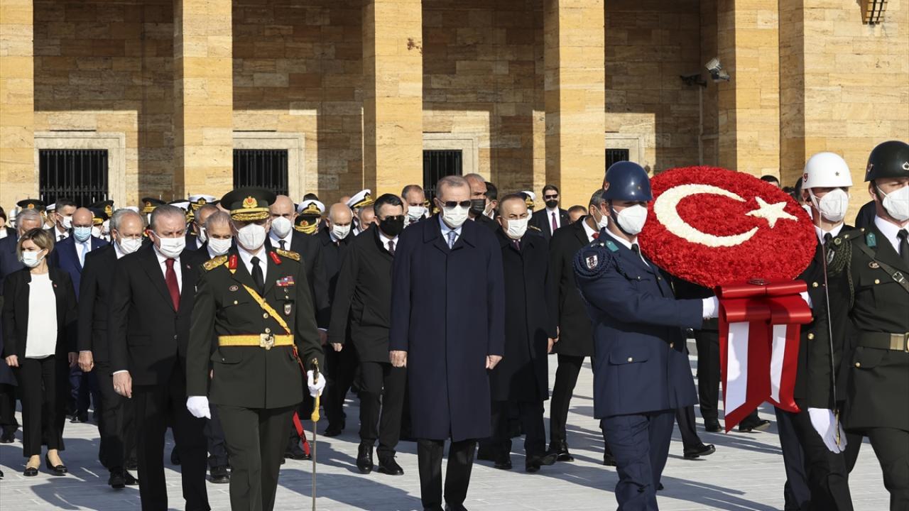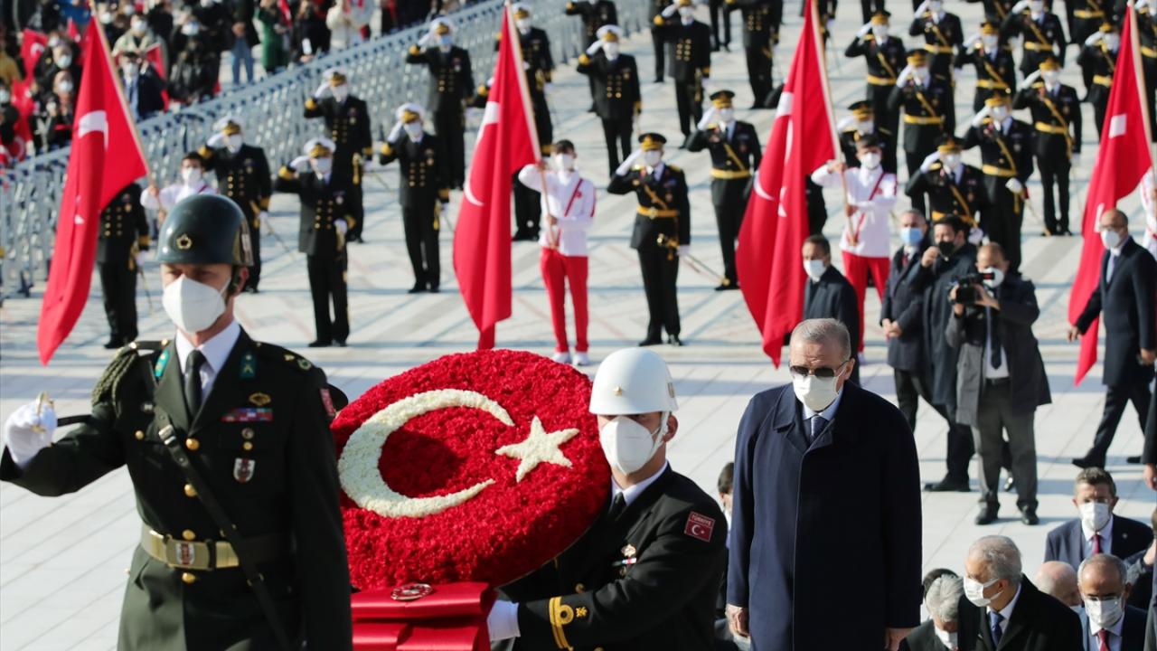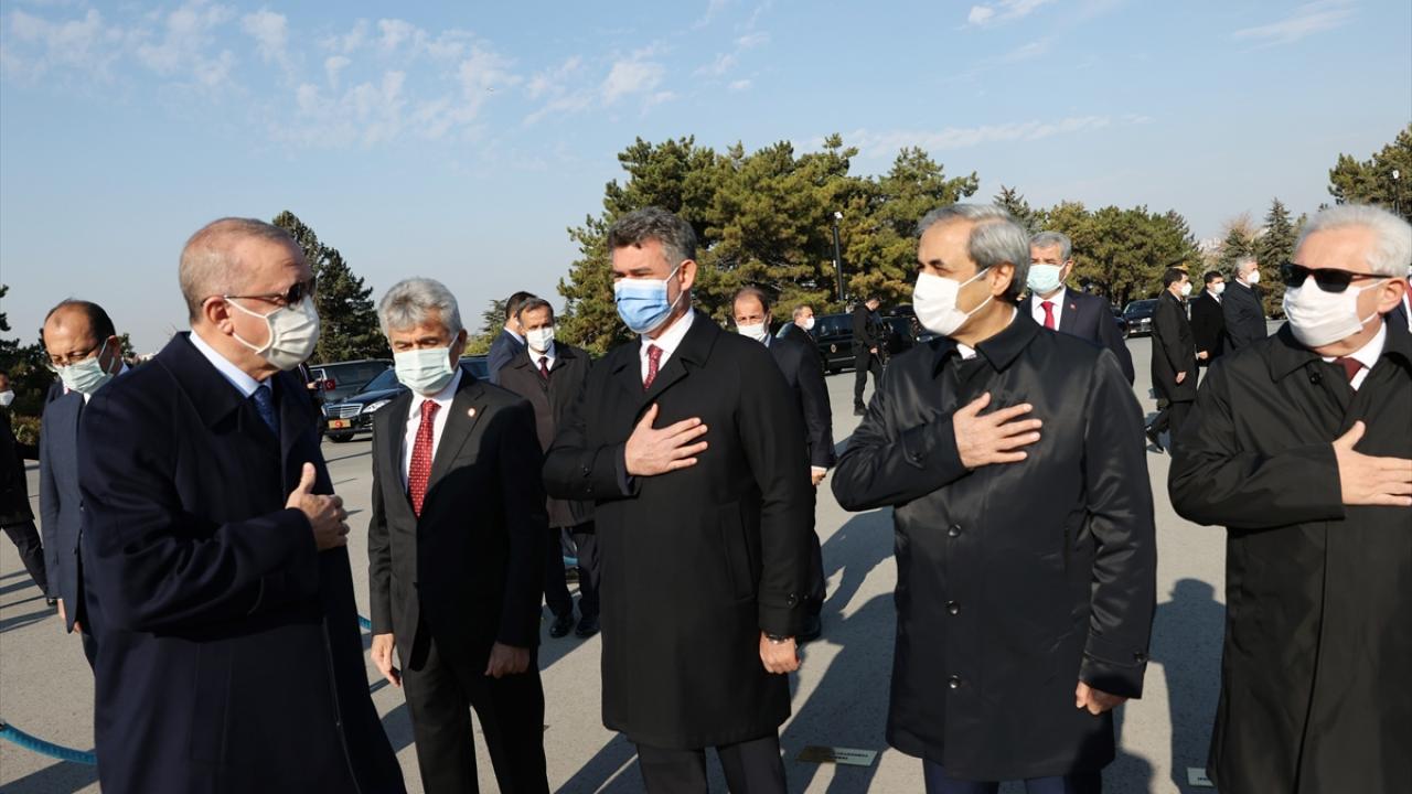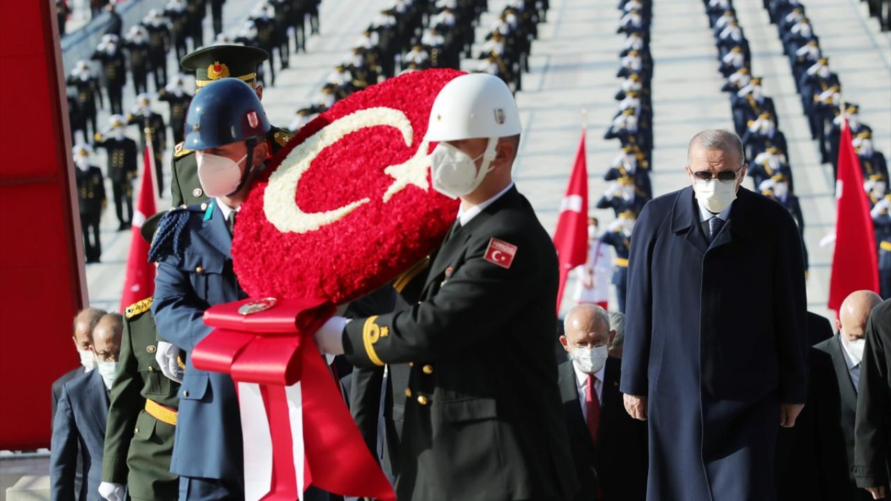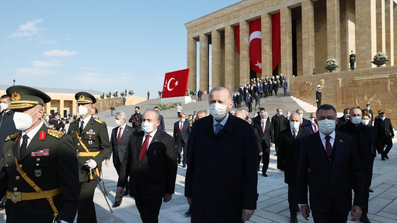 Erdoğan`ın, üzerinde ay yıldız bulunan çelengi Atatürk`ün mozolesine bırakmasının ardından, saygı duruşunda bulunuldu ve İstiklal Marşı okundu.