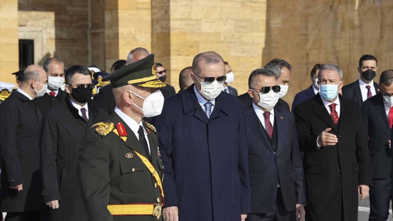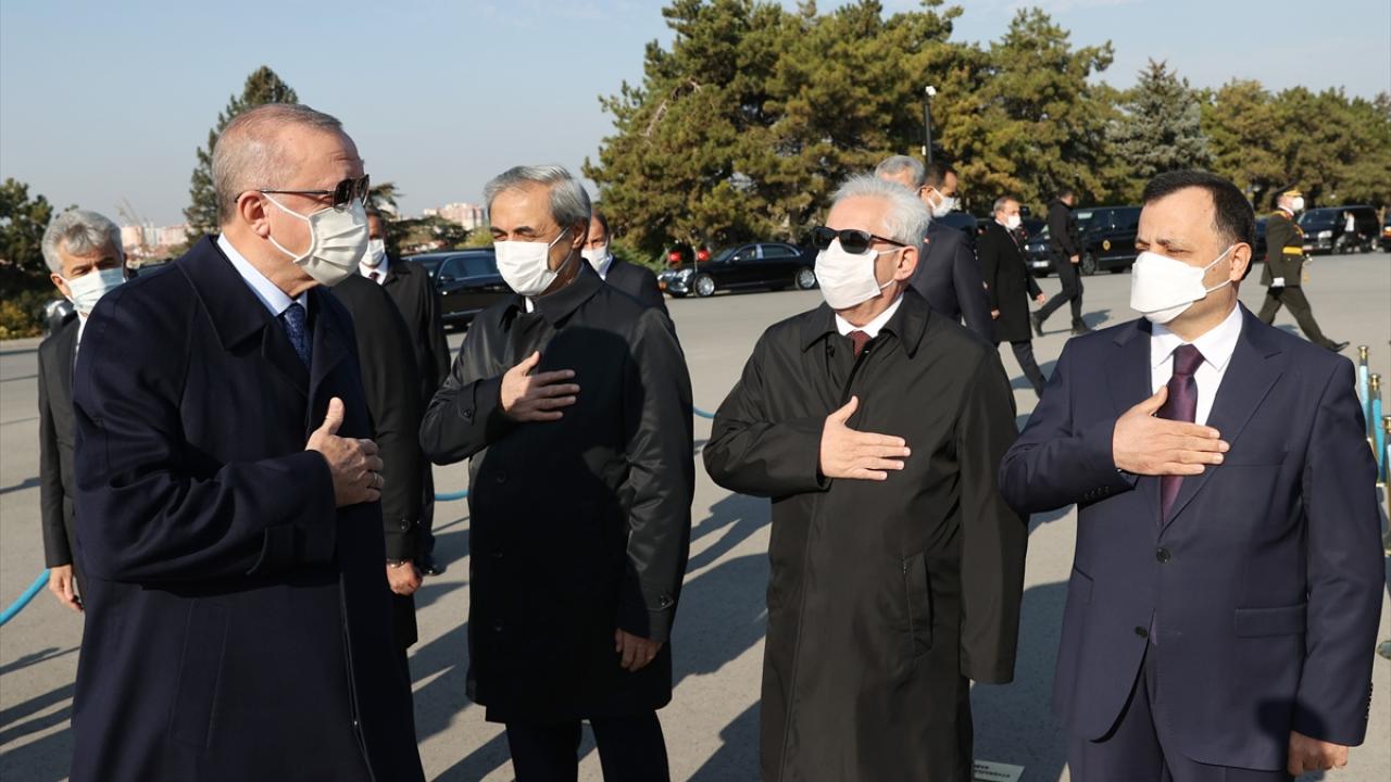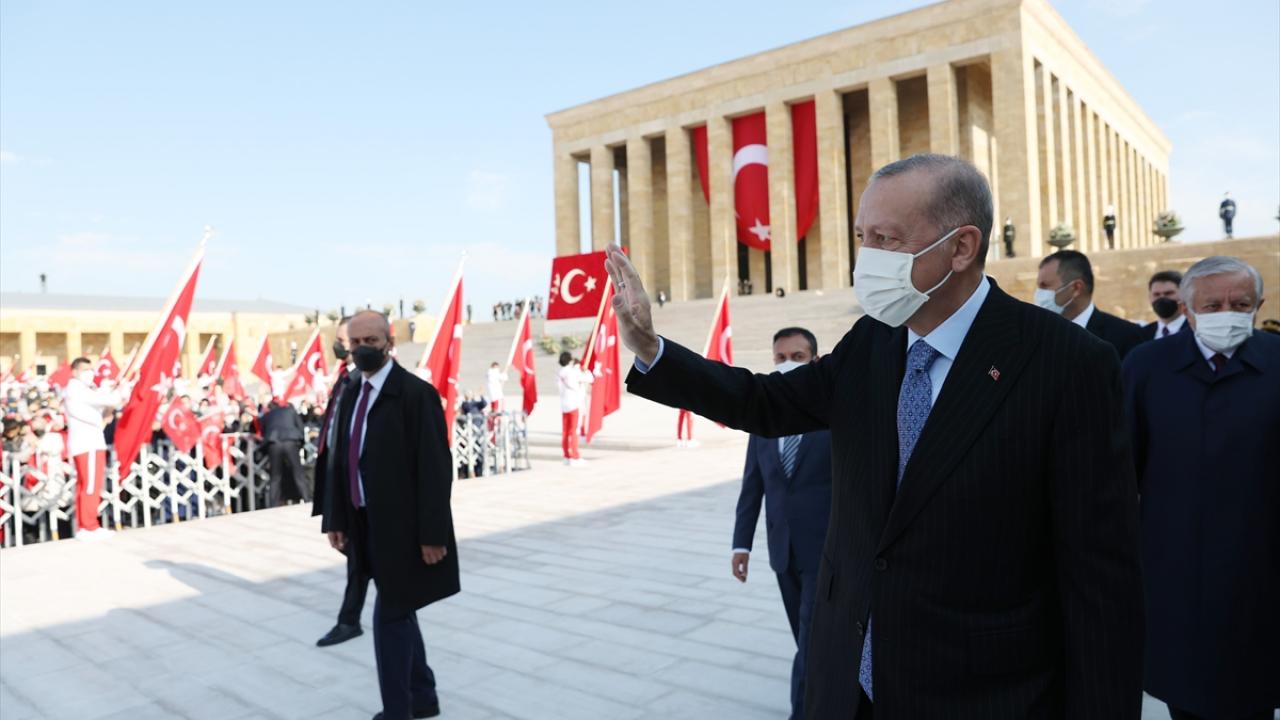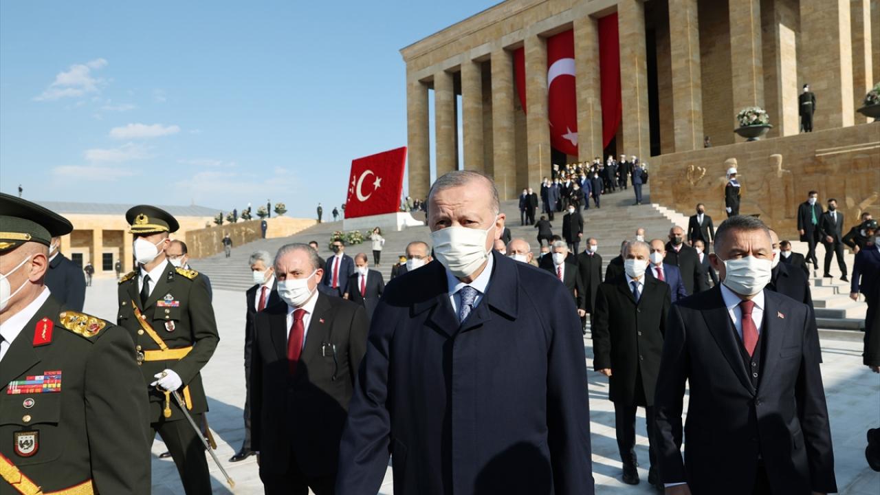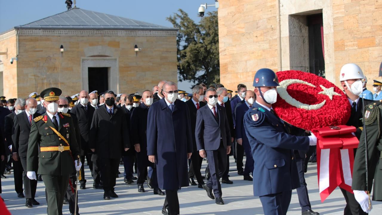 Erdoğan`ın, üzerinde ay yıldız bulunan çelengi Atatürk`ün mozolesine bırakmasının ardından, saygı duruşunda bulunuldu ve İstiklal Marşı okundu.