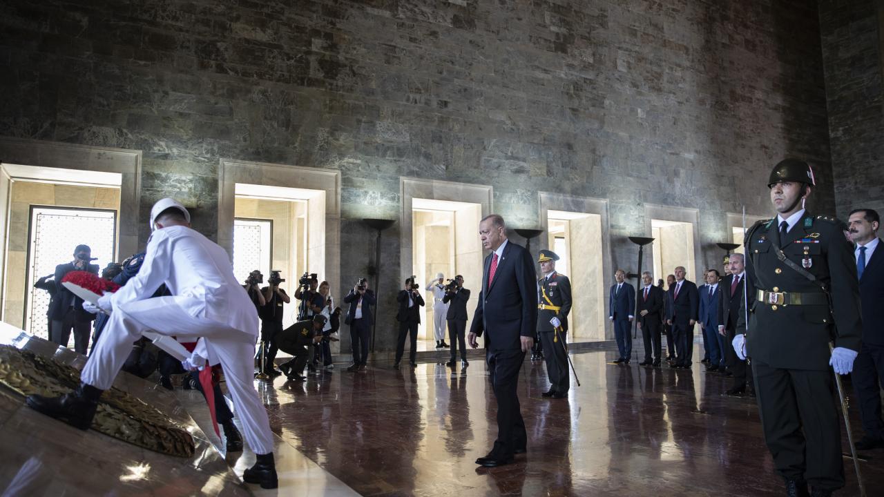 Erdoğan, Atatürk`ün mozolesine ay yıldız motifli çelengi bıraktı. Saygı duruşunun ardından İstiklal Marşı okundu.