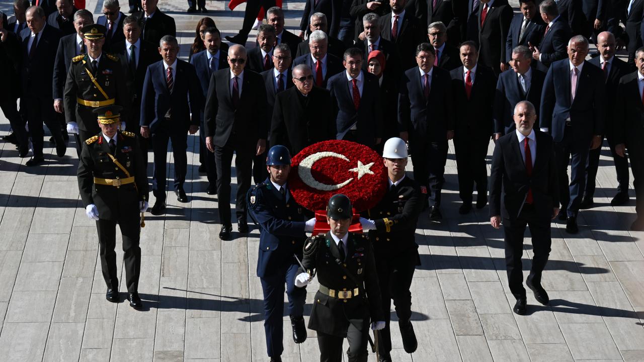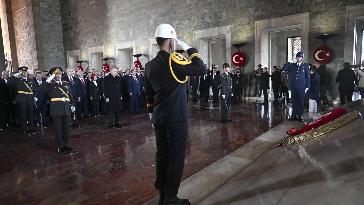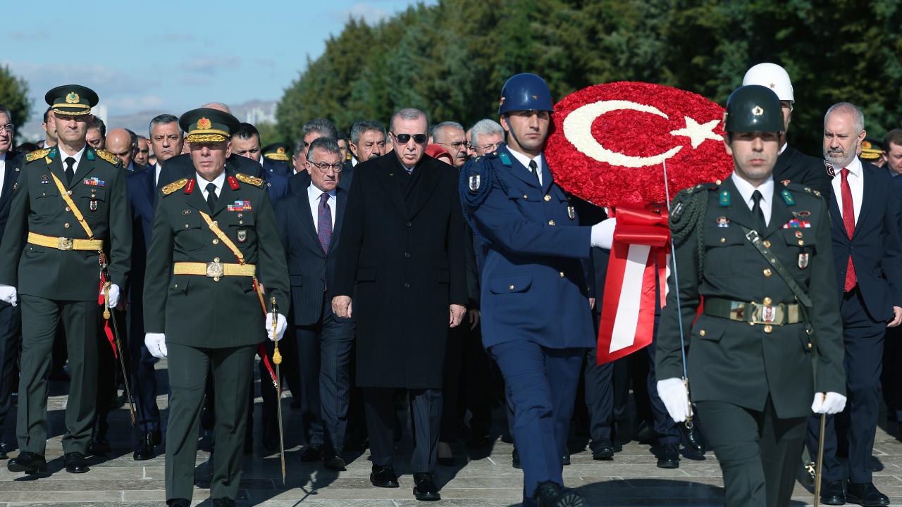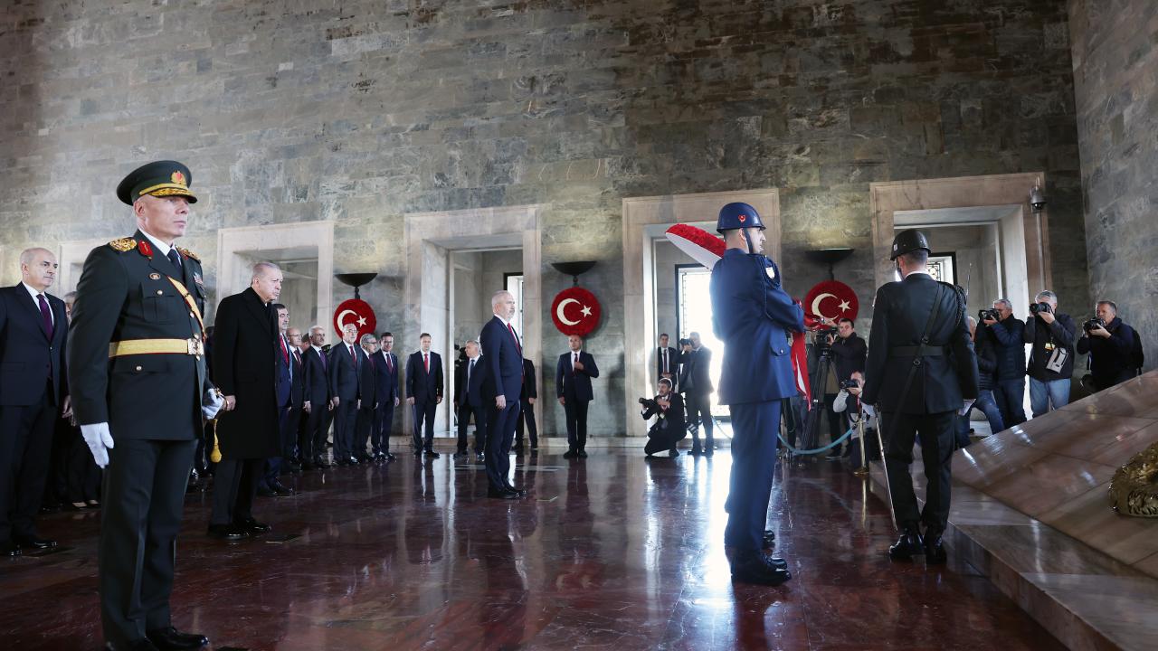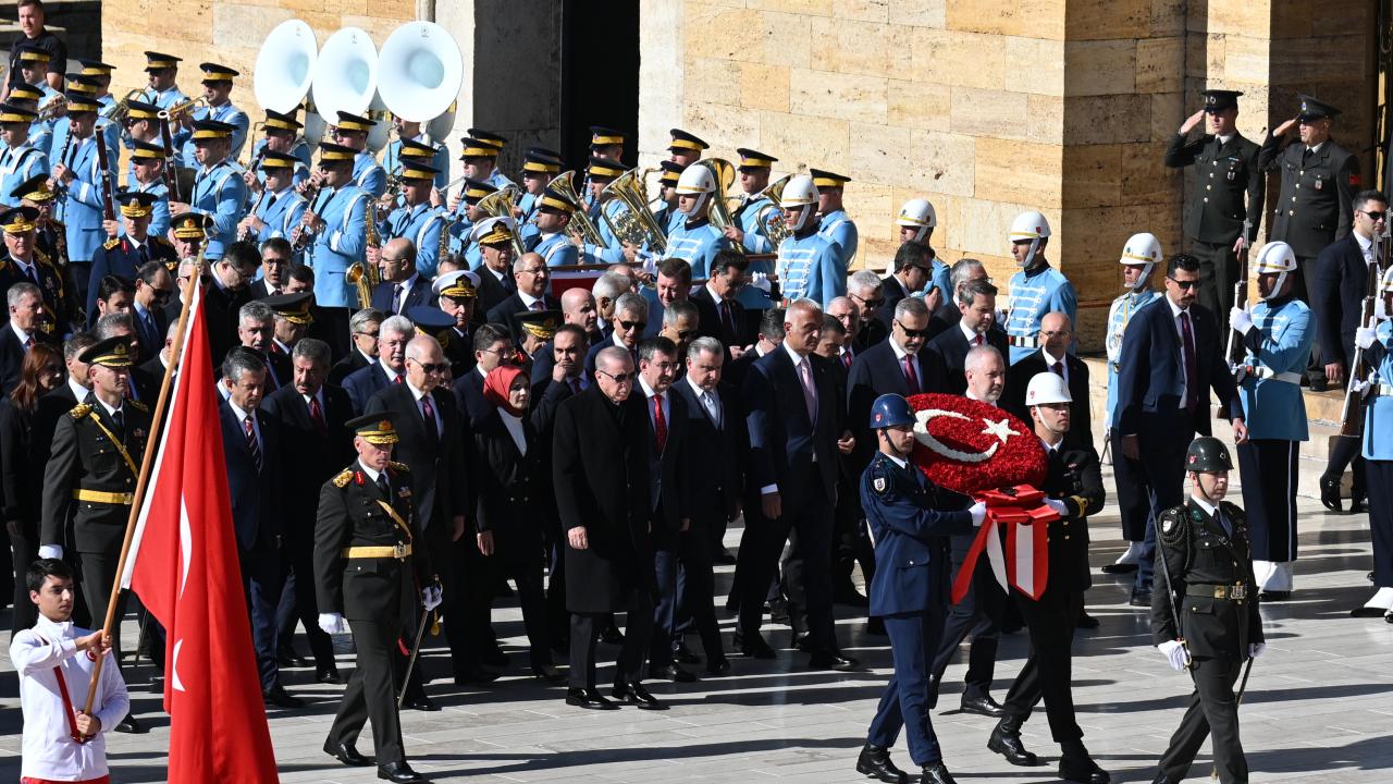 Cumhurbaşkanı Erdoğan`ın, üzerinde ay yıldız bulunan çelengi Atatürk`ün mozolesine bırakmasının ardından saygı duruşunda bulunuldu ve İstiklal Marşı okundu.