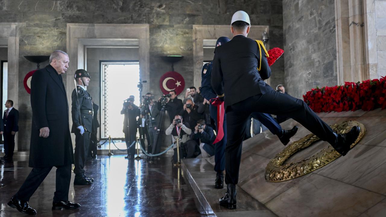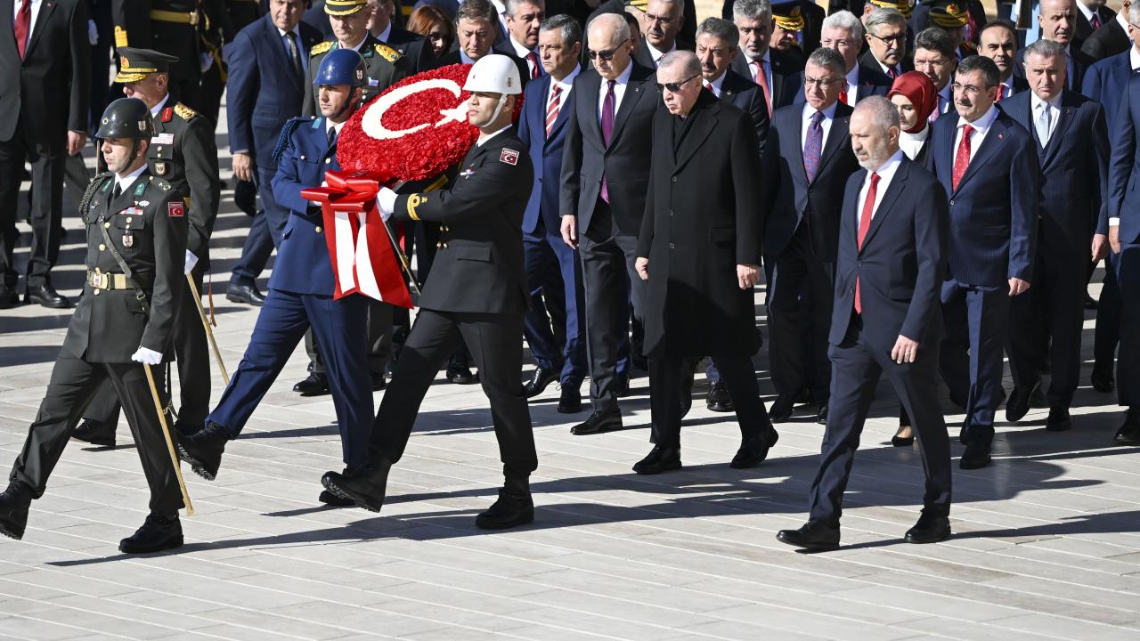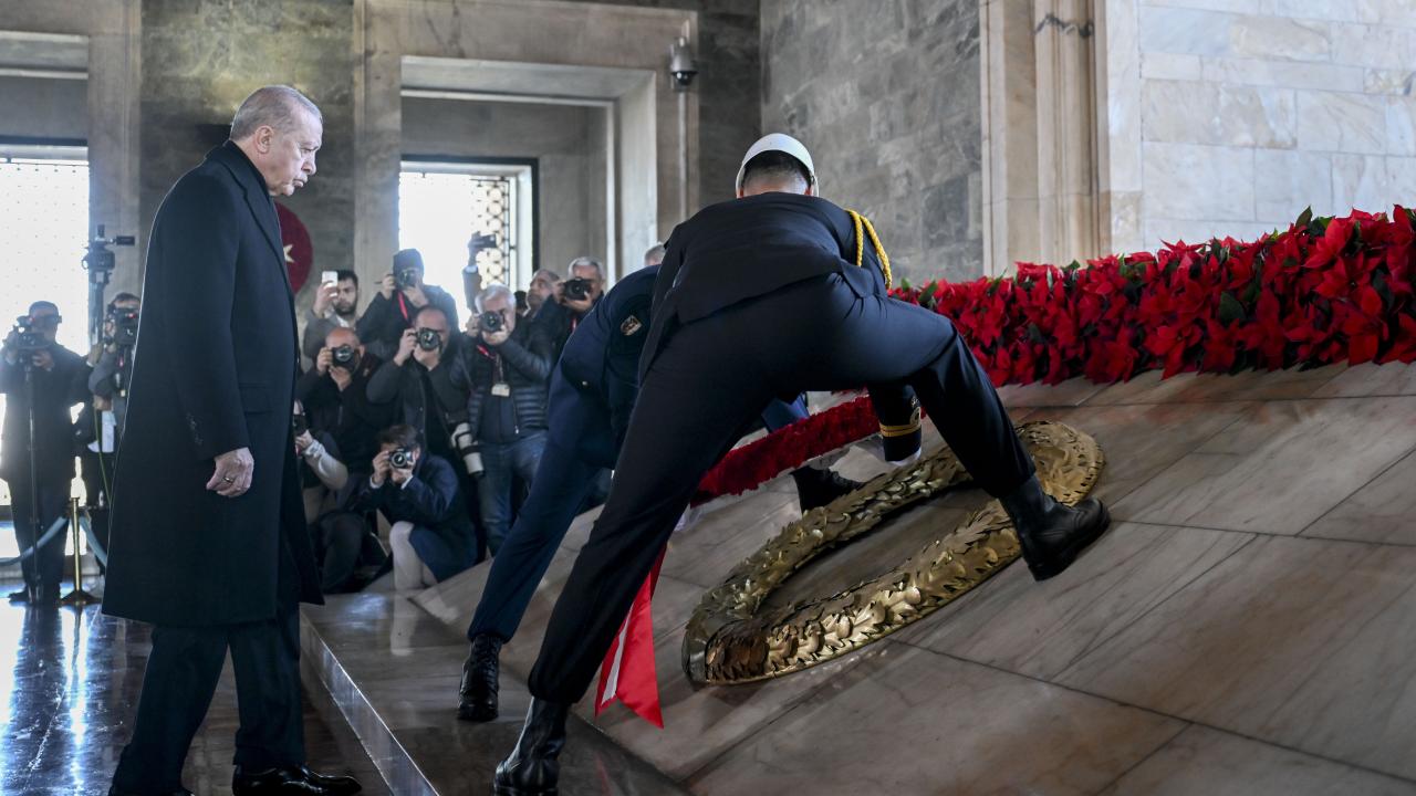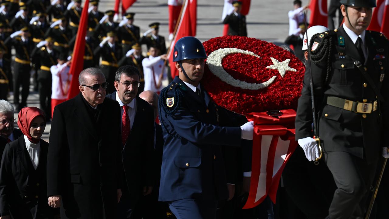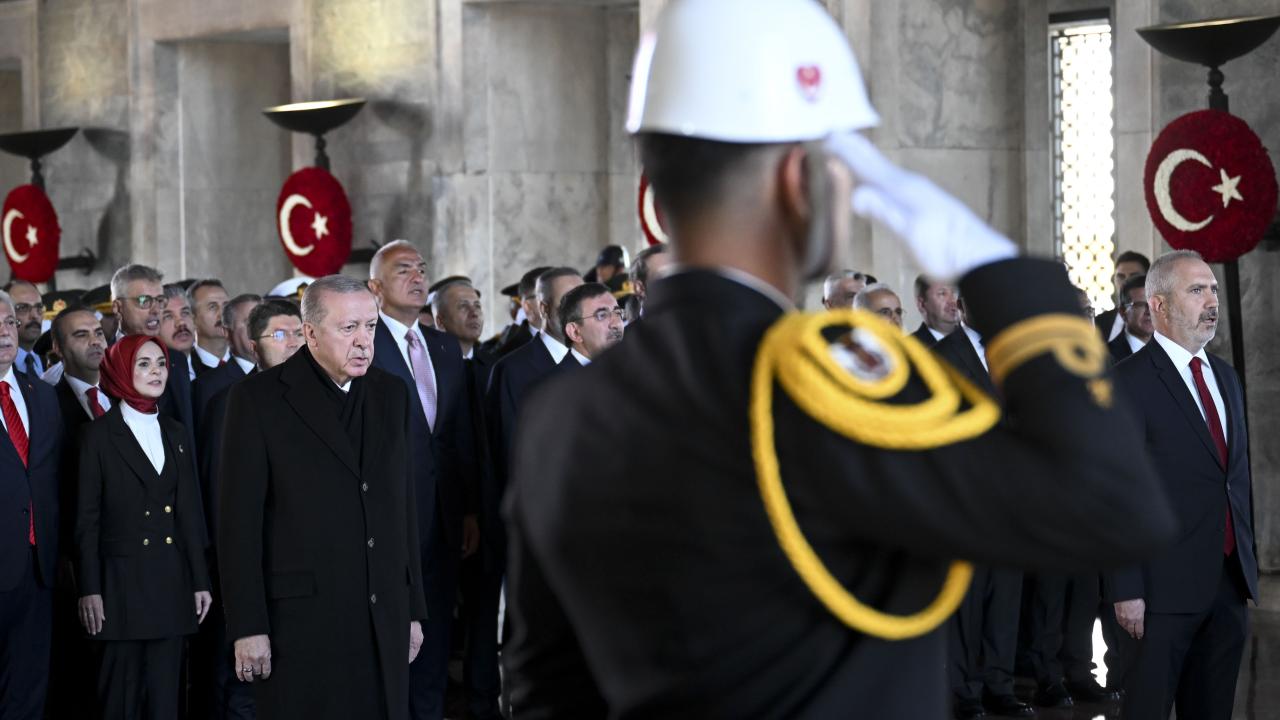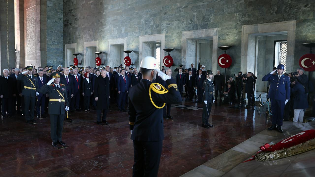 Cumhurbaşkanı Erdoğan`ın, üzerinde ay yıldız bulunan çelengi Atatürk`ün mozolesine bırakmasının ardından saygı duruşunda bulunuldu ve İstiklal Marşı okundu.
