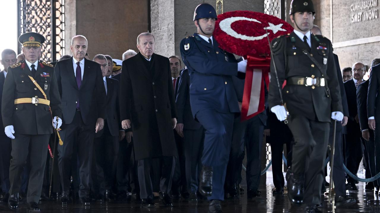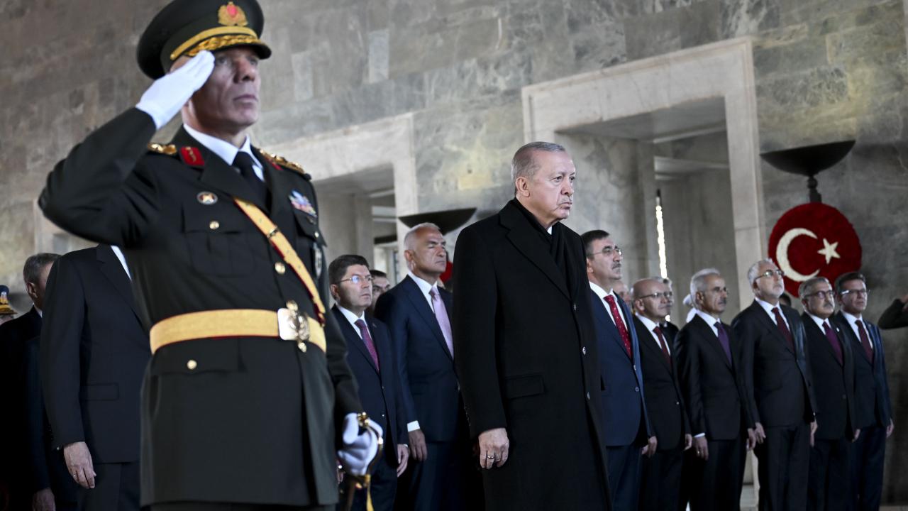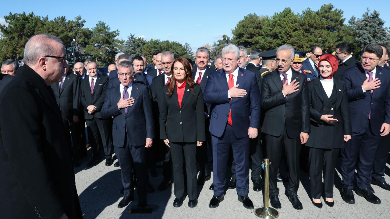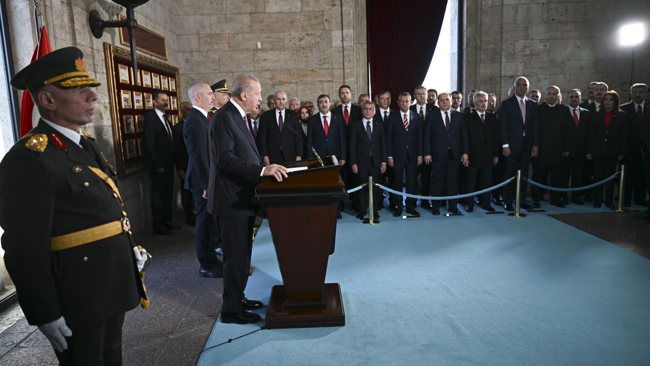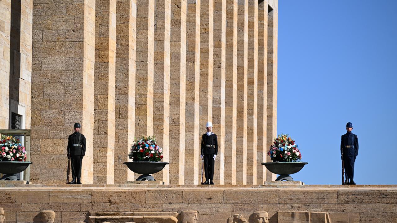 Cumhurbaşkanı Erdoğan`ın, üzerinde ay yıldız bulunan çelengi Atatürk`ün mozolesine bırakmasının ardından saygı duruşunda bulunuldu ve İstiklal Marşı okundu.