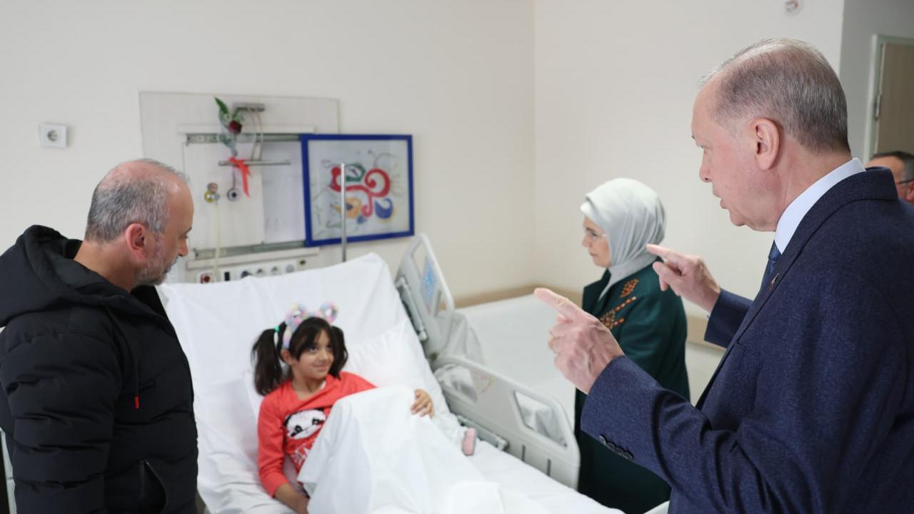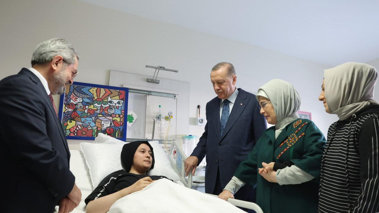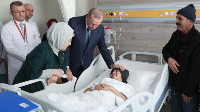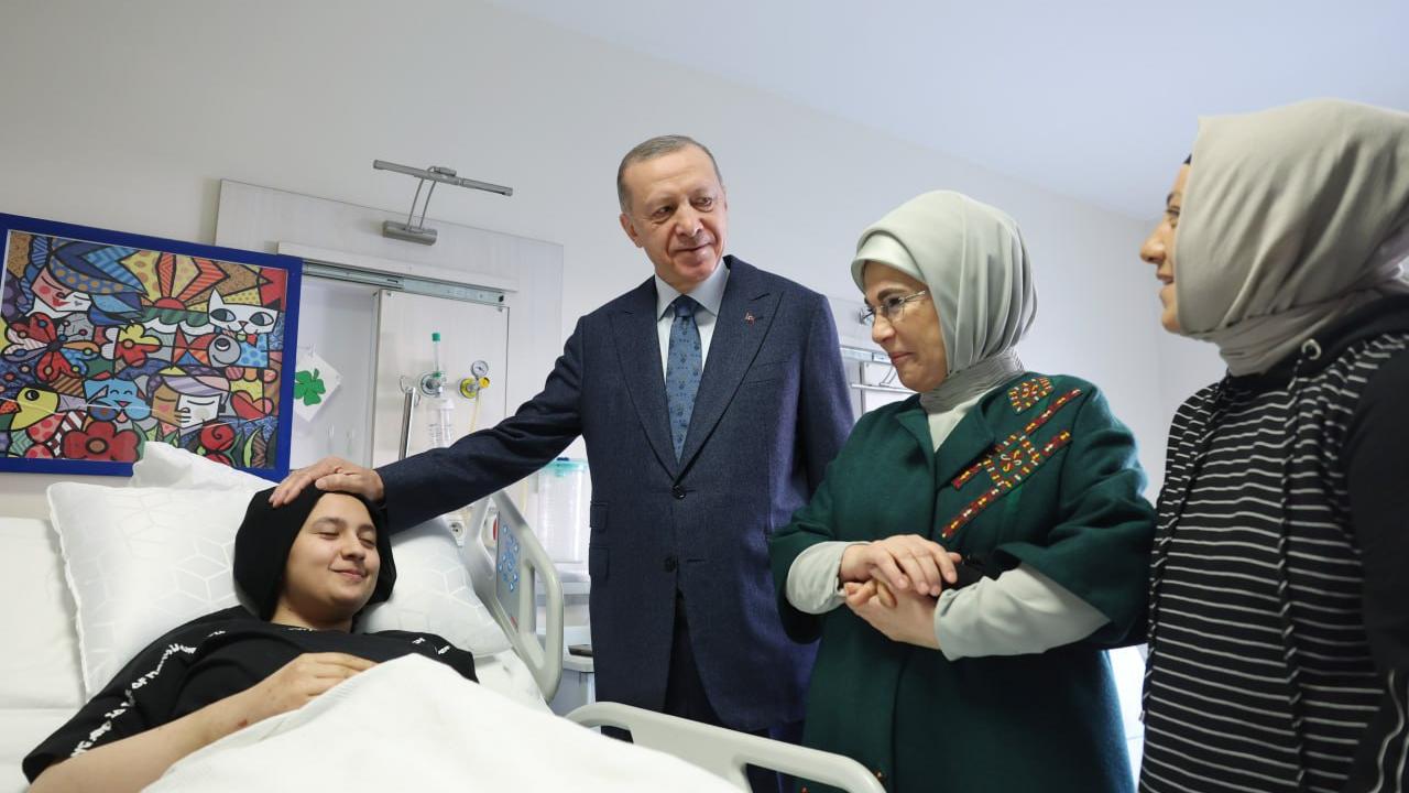 Depremin 248`inci saatinde Kahramanmaraş`ta mahsur kaldığı enkazdan kurtarılan 17 yaşındaki Aleyna Ölmez ile Hatay`dan getirilen 16 yaşındaki Hülyasu Kısa ve 8 yaşındaki Feyza Nur Yakar, Kahramanmaraş`tan getirilen 7 yaşındaki Miraç Eren Döner ve 10 yaşındaki Ayça Çepni, Şanlıurfa`dan getirilen 9 yaşındaki Zeynep Küçükler`i ziyaret eden Erdoğan, tedavileri süren hastaların sağlık durumu hakkında doktorlardan ve Ankara Üniversitesi Rektörü Prof. Dr. Necdet Ünüvar`dan bilgi aldı.