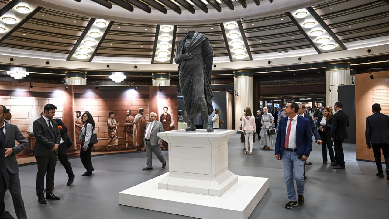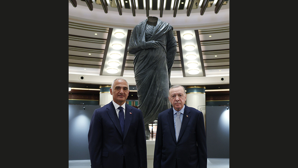 Cumhurbaşkanı Erdoğan, sergide yurt dışından getirilen Marcus Aurelius heykeli önünde Kültür ve Turizm Bakanı Mehmet Nuri Ersoy ile fotoğraf çektirdi.