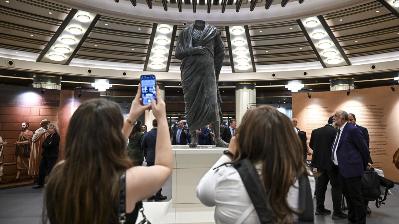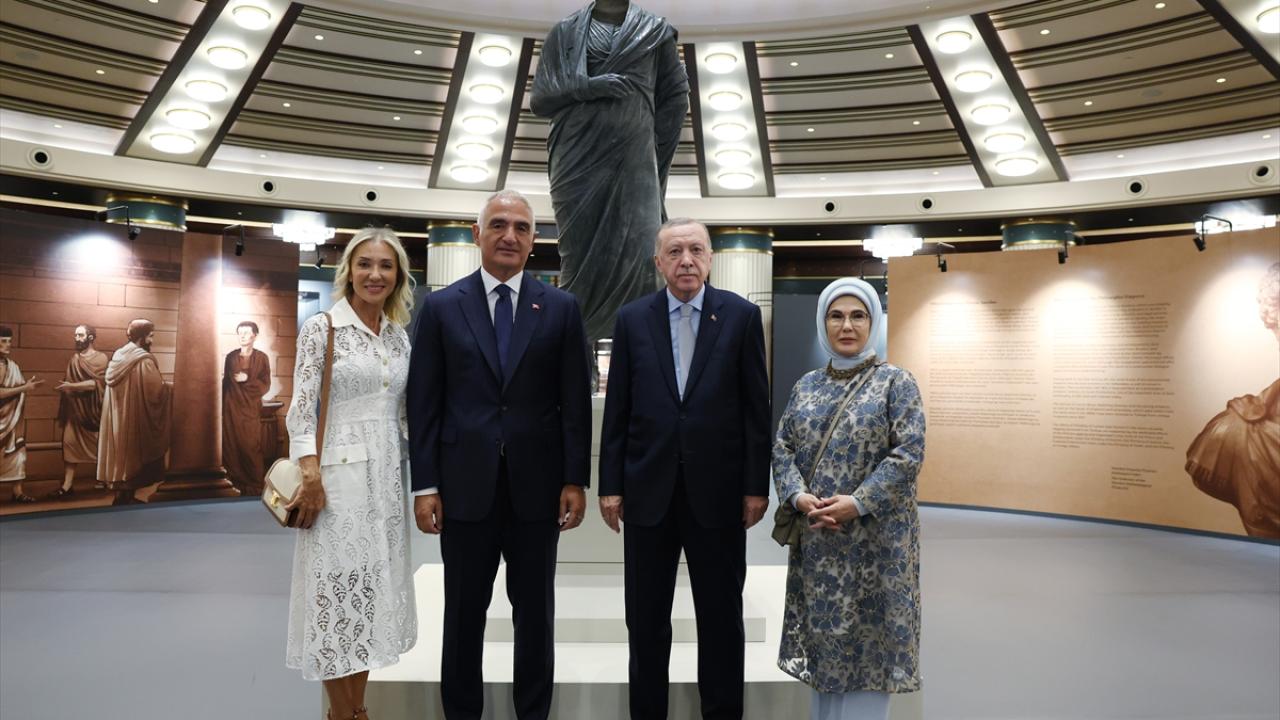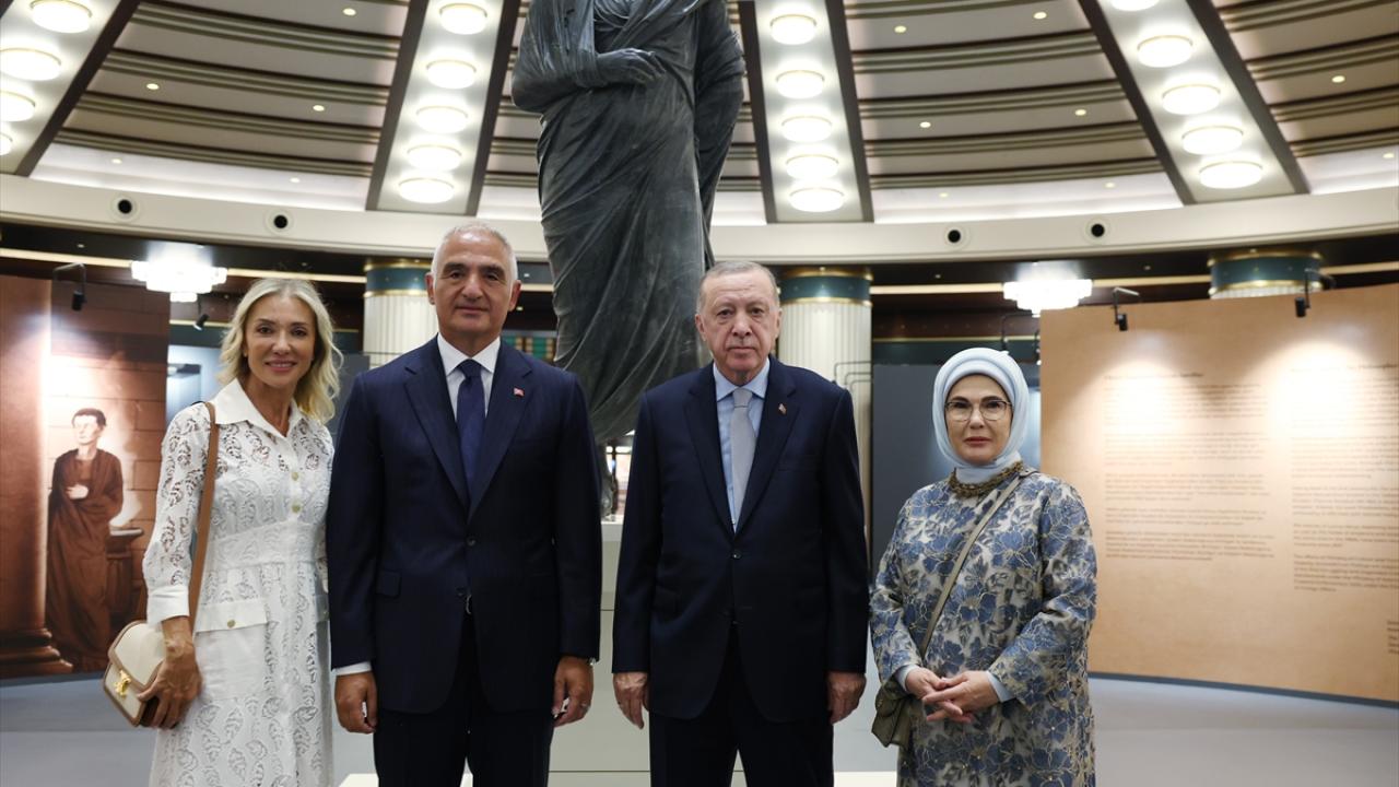 Erdoğan, sergide yurt dışından getirilen Marcus Aurelius heykeli önünde eşi Emine Erdoğan, Kültür ve Turizm Bakanı Mehmet Nuri Ersoy ve eşi Pervin Ersoy ile fotoğraf çektirdi.