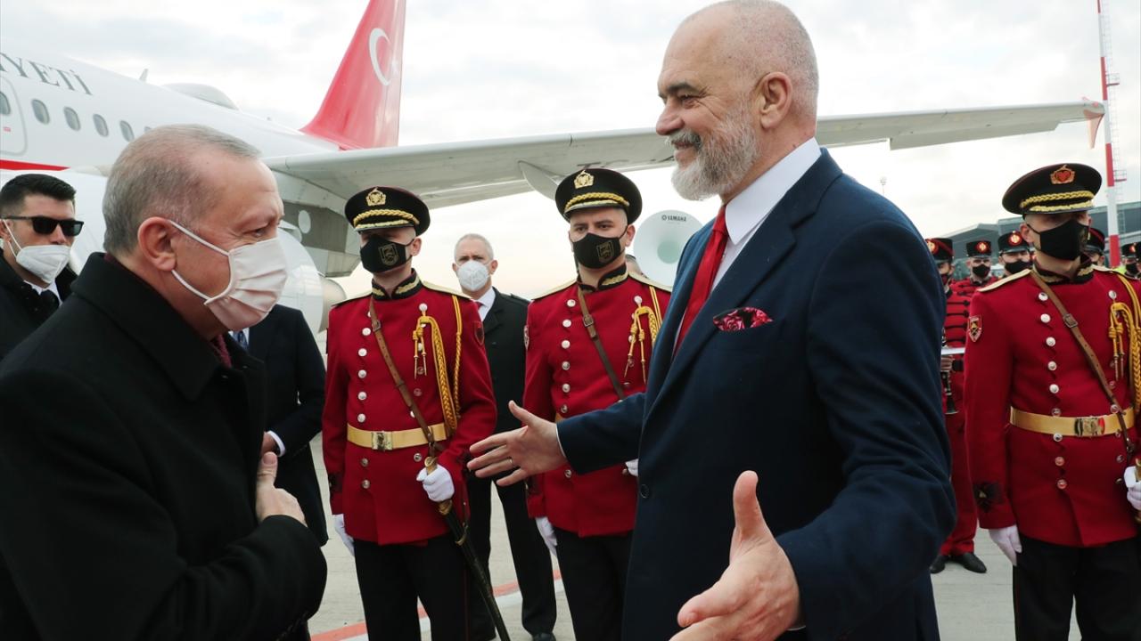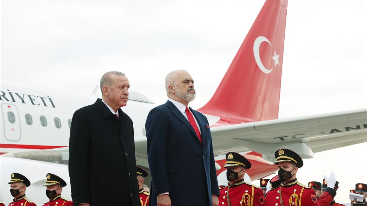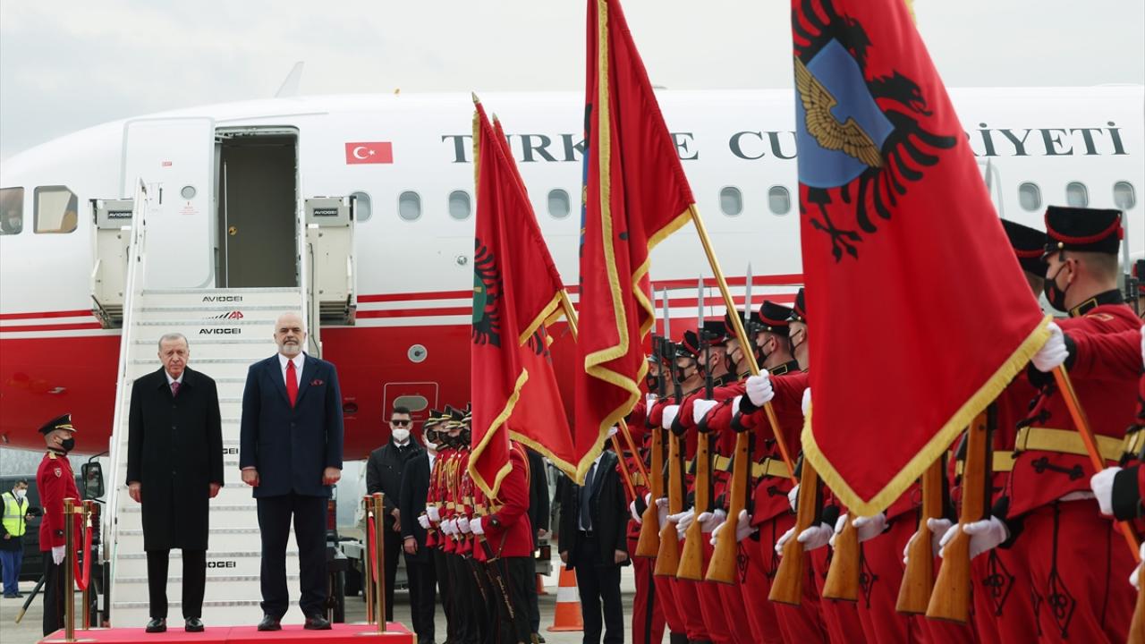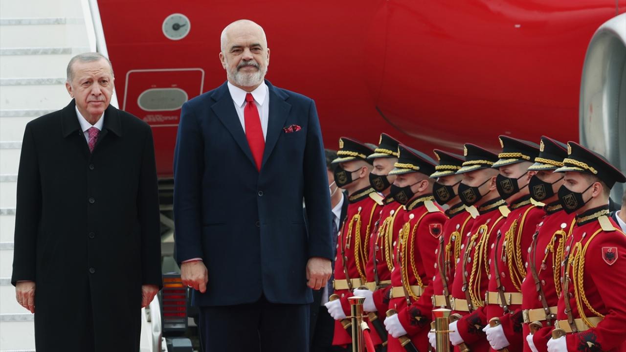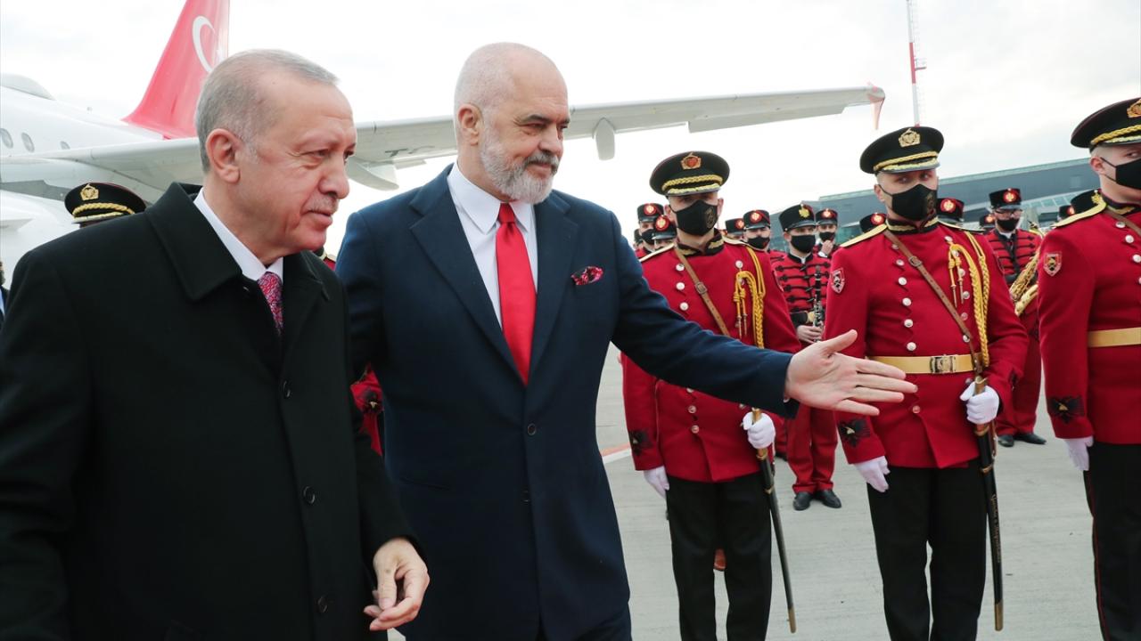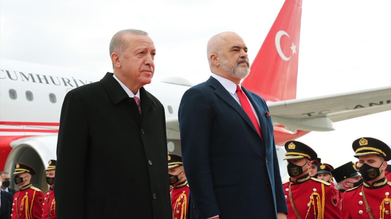 Cumhurbaşkanı Erdoğan, Rahibe Teresa Uluslararası Havalimanı`nda Arnavutluk Başkanı Rama tarafından törenle karşılandı.
