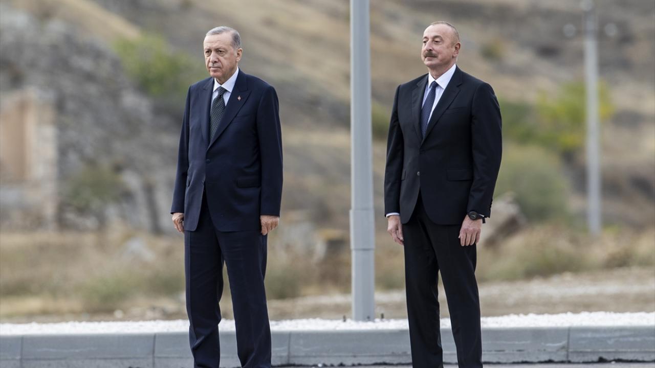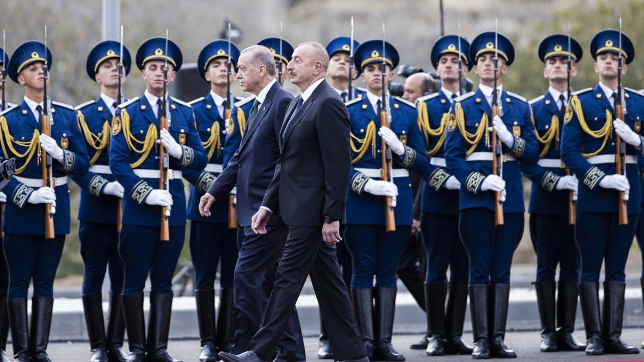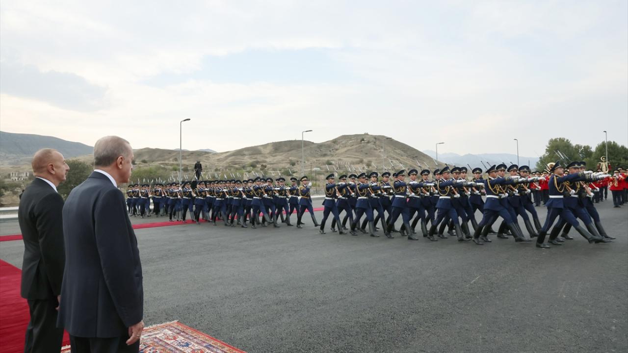 Aliyev ile tören kıtasını denetleyen Cumhurbaşkanı Erdoğan, askerleri selamladı.