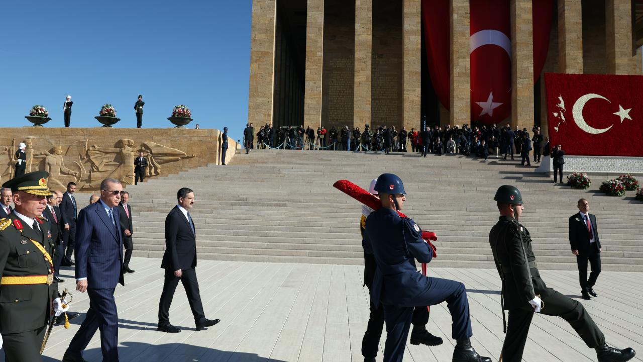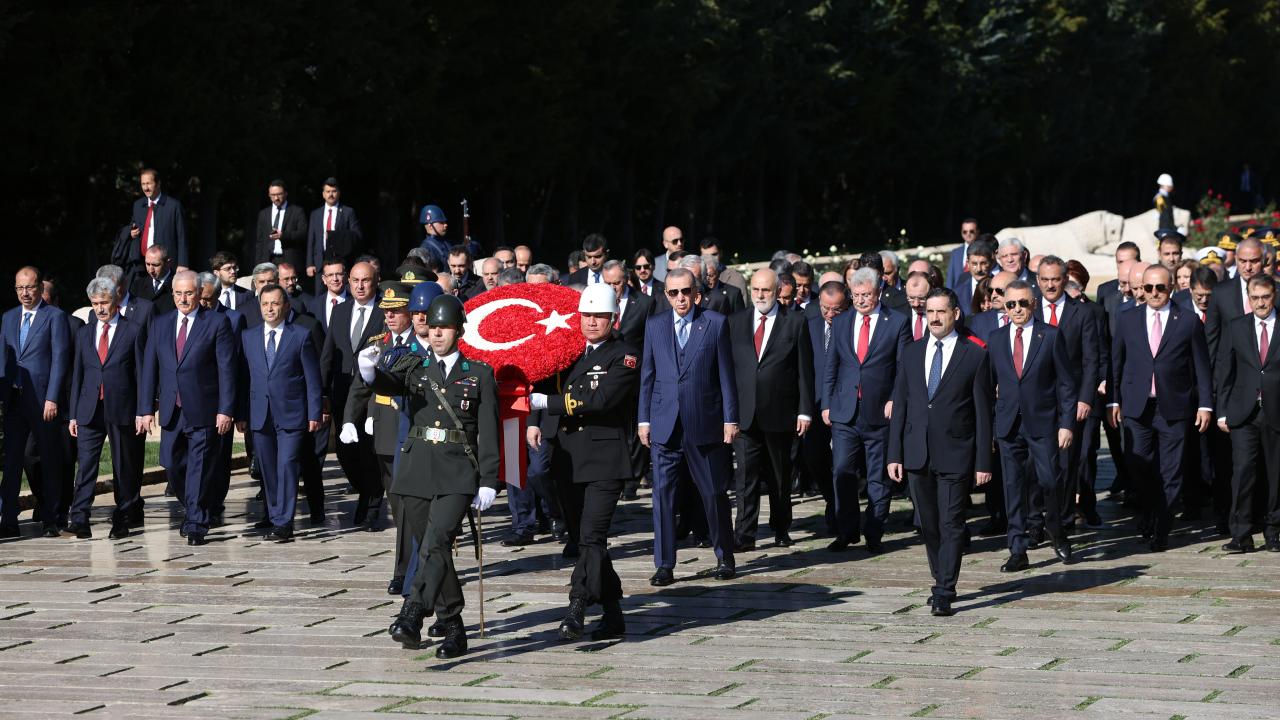 Cumhurbaşkanı Erdoğan ve beraberindeki devlet erkanı, Aslanlı Yol`da yürüyerek Atatürk`ün mozolesine geldi.