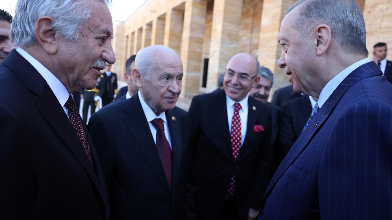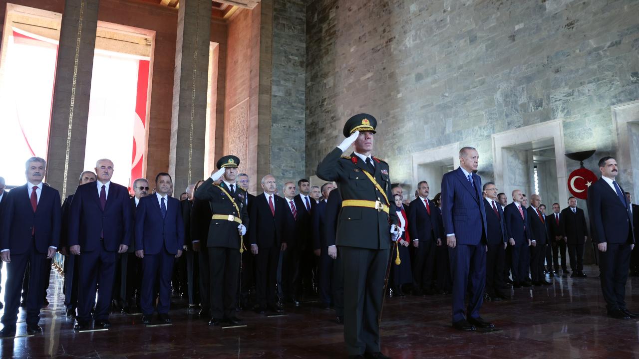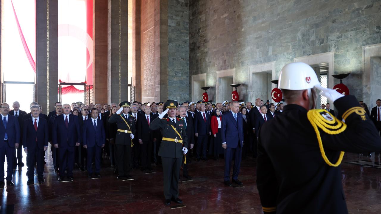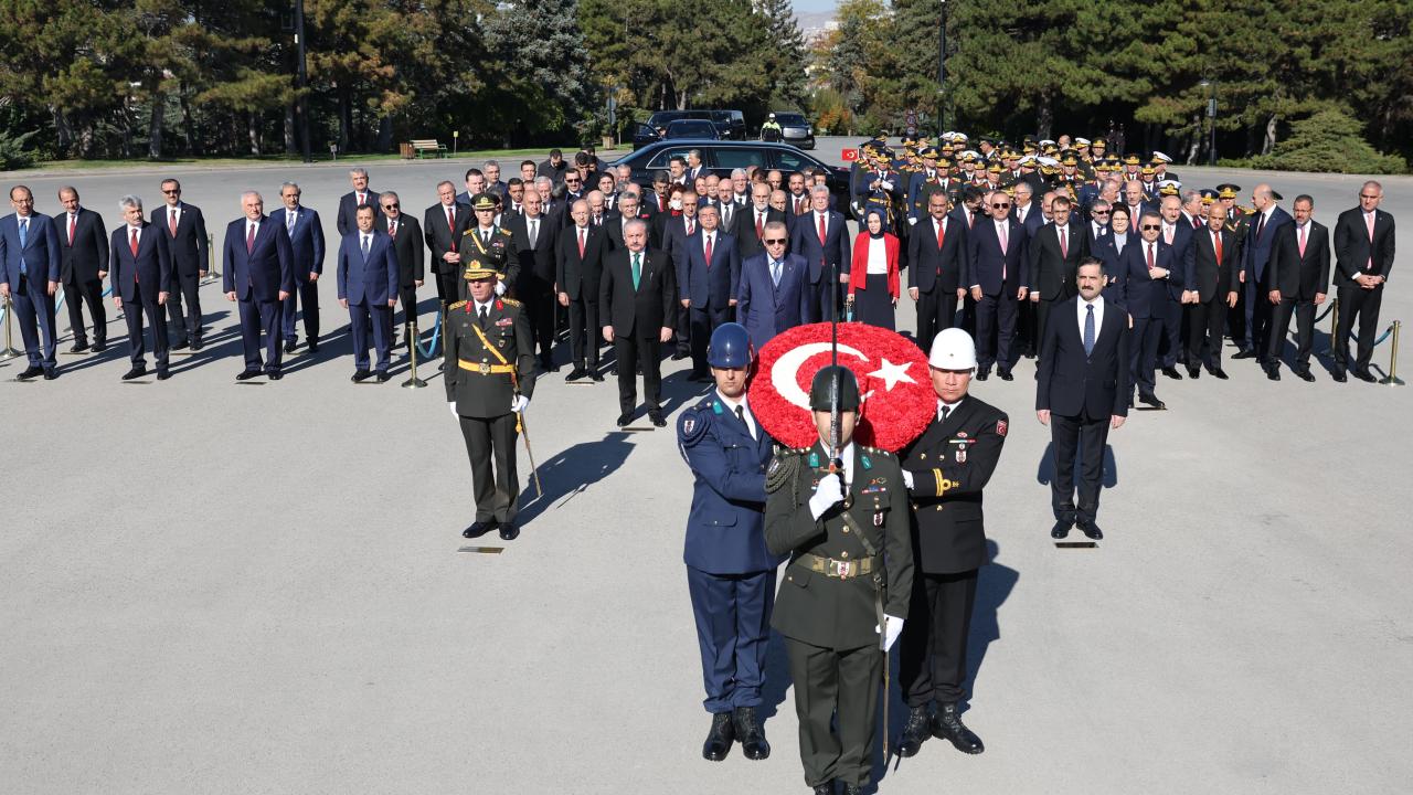 Cumhurbaşkanı Erdoğan`ın Aslanlı Yol`un başındaki yerini almasının ardından başlayan törende, Türkiye Büyük Millet Meclisi Başkanı Mustafa Şentop, Cumhurbaşkanı Yardımcısı Fuat Oktay, CHP Genel Başkanı Kemal Kılıçdaroğlu, MHP Genel Başkanı Devlet Bahçeli, İYİ Parti Genel Başkanı Meral Akşener, Cumhurbaşkanlığı Kabinesi üyeleri, yüksek yargı organlarının başkanları, Genelkurmay Başkanı Orgeneral Yaşar Güler ve kuvvet komutanları da Aslanlı Yol`dan geçerek mozoleye çıktı.