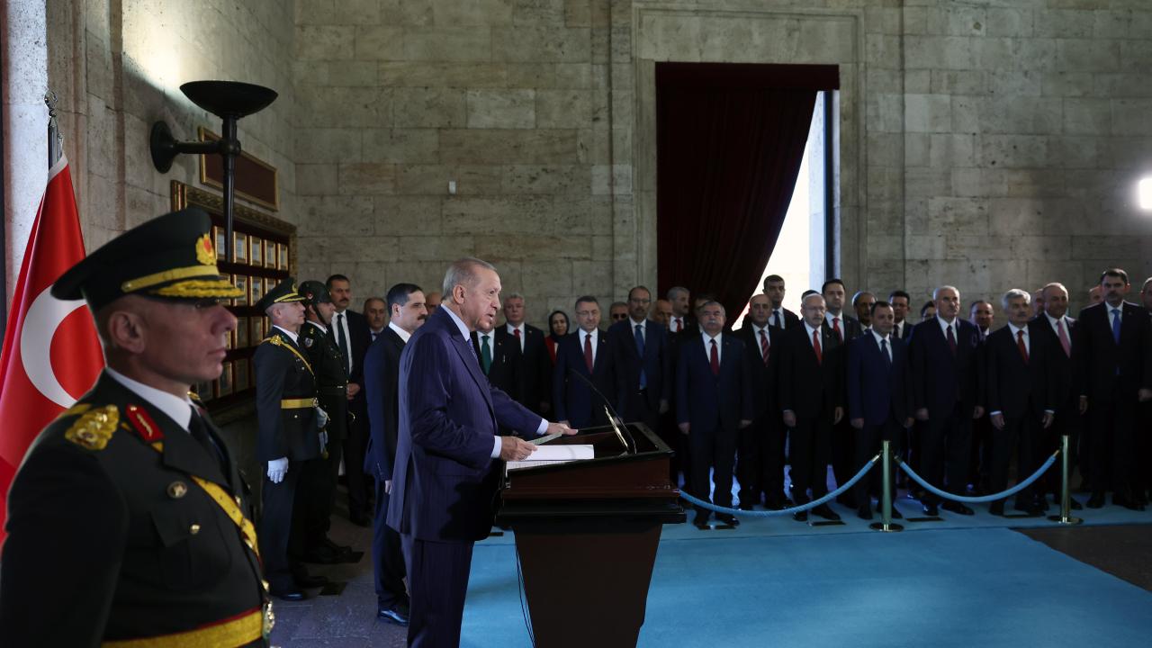 Cumhurbaşkanı Erdoğan`ın üzerinde ay yıldız bulunan çelengi Atatürk`ün mozolesine bırakmasının ardından saygı duruşunda bulunuldu ve İstiklal Marşı okundu. Daha sonra Erdoğan ve beraberindekiler, Misak-ı Milli Kulesi`ne geçti. Cumhurbaşkanı Erdoğan, burada Anıtkabir Özel Defteri`ne şunları yazdı: