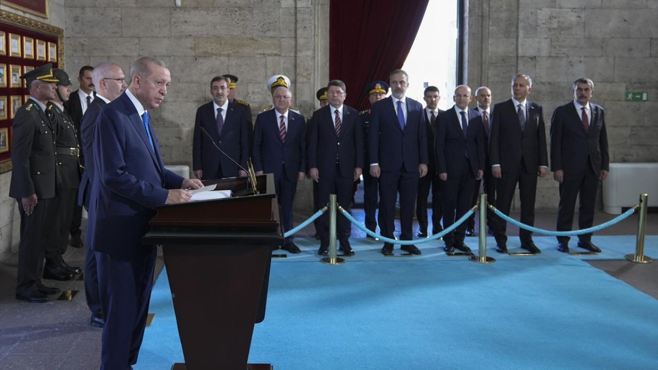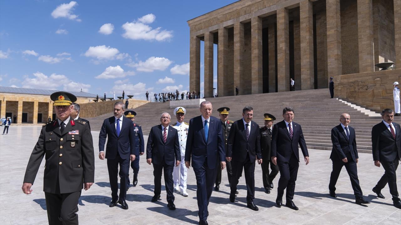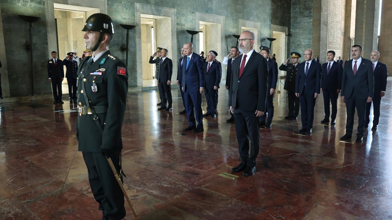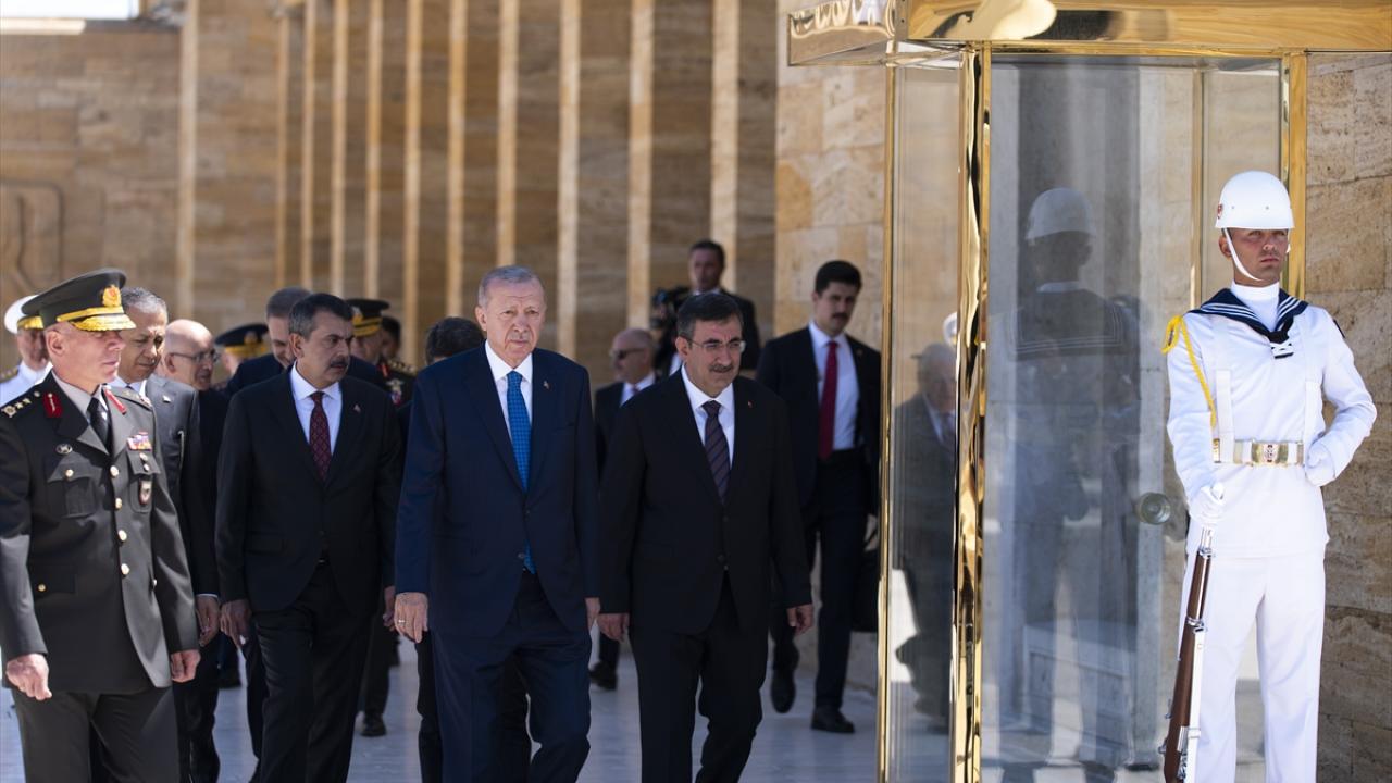 Erdoğan`ın Aslanlı Yol`un başındaki yerini almasının ardından başlayan törene, Cumhurbaşkanı Yardımcısı Cevdet Yılmaz, Adalet Bakanı Yılmaz Tunç, Dışişleri Bakanı Hakan Fidan, Hazine ve Maliye Bakanı Mehmet Şimşek, İçişleri Bakanı Ali Yerlikaya, Milli Eğitim Bakanı Yusuf Tekin, Milli Savunma Bakanı Yaşar Güler, Genelkurmay Başkanı Orgeneral Metin Gürak, Kara Kuvvetleri Komutanı Orgeneral Selçuk Bayraktaroğlu, Deniz Kuvvetleri Komutanı Oramiral Ercüment Tatlıoğlu ve Hava Kuvvetleri Komutanı Hava Orgeneral Ziya Cemal Kadıoğlu katıldı.