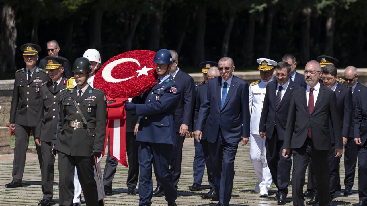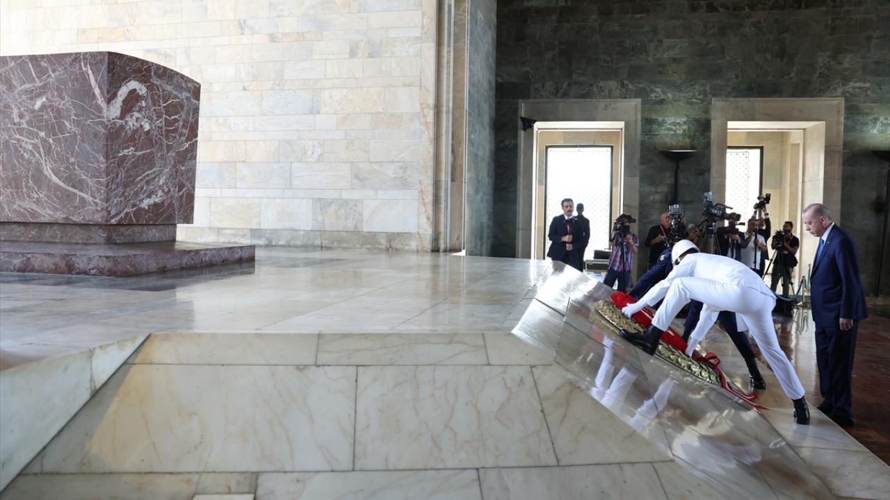 Cumhurbaşkanı Erdoğan`ın ay yıldız motifli çelengi Atatürk`ün mozolesine bırakmasının ardından saygı duruşunda bulunuldu, İstiklal Marşı okundu.