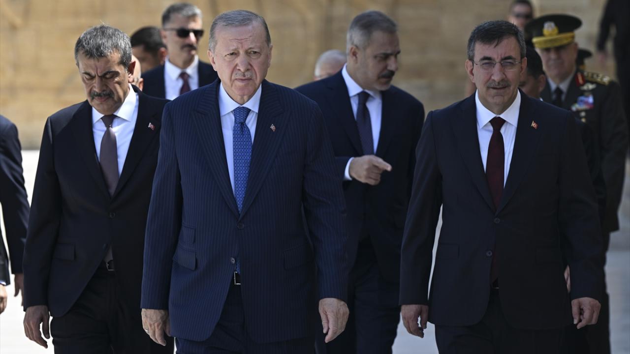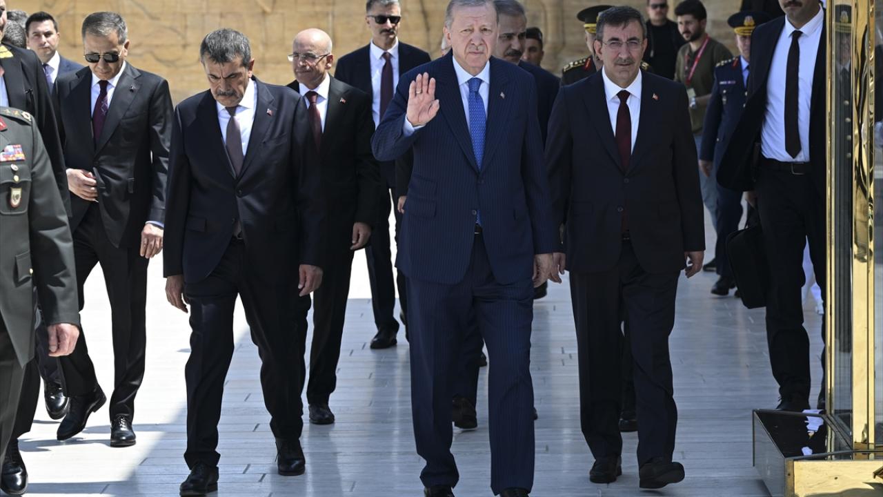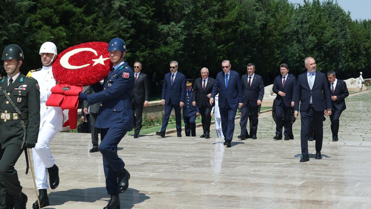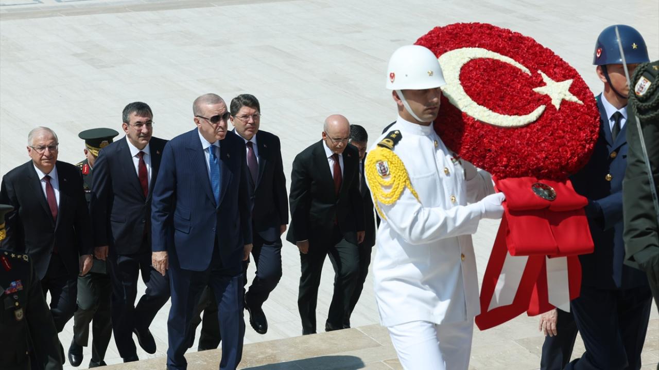 Erdoğan`ın Aslanlı Yol`un başındaki yerini almasının ardından başlayan törene, Cumhurbaşkanı Yardımcısı Cevdet Yılmaz, Adalet Bakanı Yılmaz Tunç, Dışişleri Bakanı Hakan Fidan, Hazine ve Maliye Bakanı Mehmet Şimşek, İçişleri Bakanı Ali Yerlikaya, Milli Eğitim Bakanı Yusuf Tekin, Milli Savunma Bakanı Yaşar Güler, Genelkurmay Başkanı Orgeneral Metin Gürak, Kara Kuvvetleri Komutanı Orgeneral Selçuk Bayraktaroğlu, Deniz Kuvvetleri Komutanı Oramiral Ercüment Tatlıoğlu ve Hava Kuvvetleri Komutanı Orgeneral Ziya Cemal Kadıoğlu katıldı.