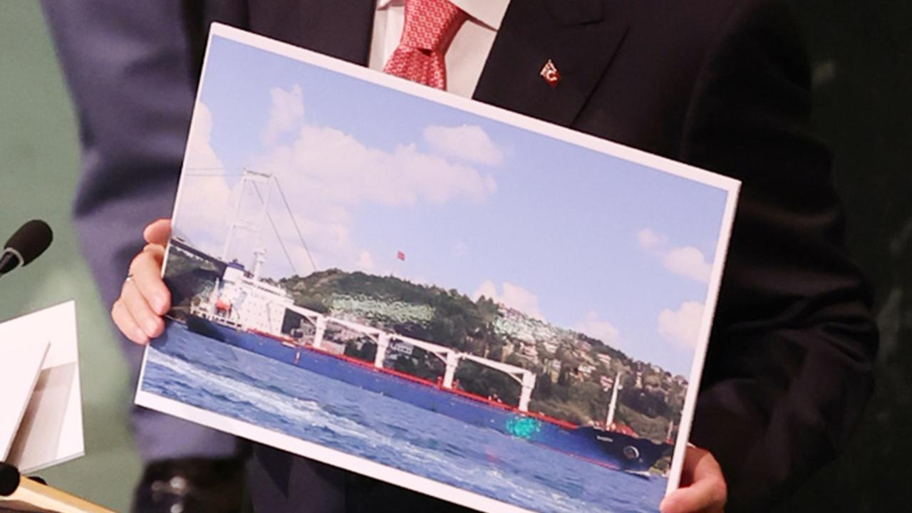 Erdoğan, Ukrayna`dan hareket eden tahıl yüklü gemilerin İstanbul Boğazı`ndan geçişine ilişkin bir fotoğrafı göstererek, şunları söyledi: