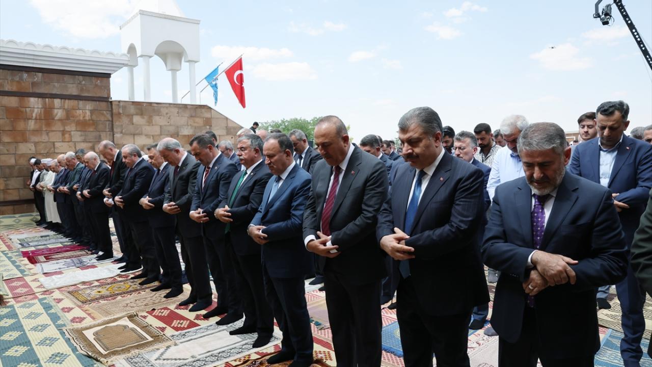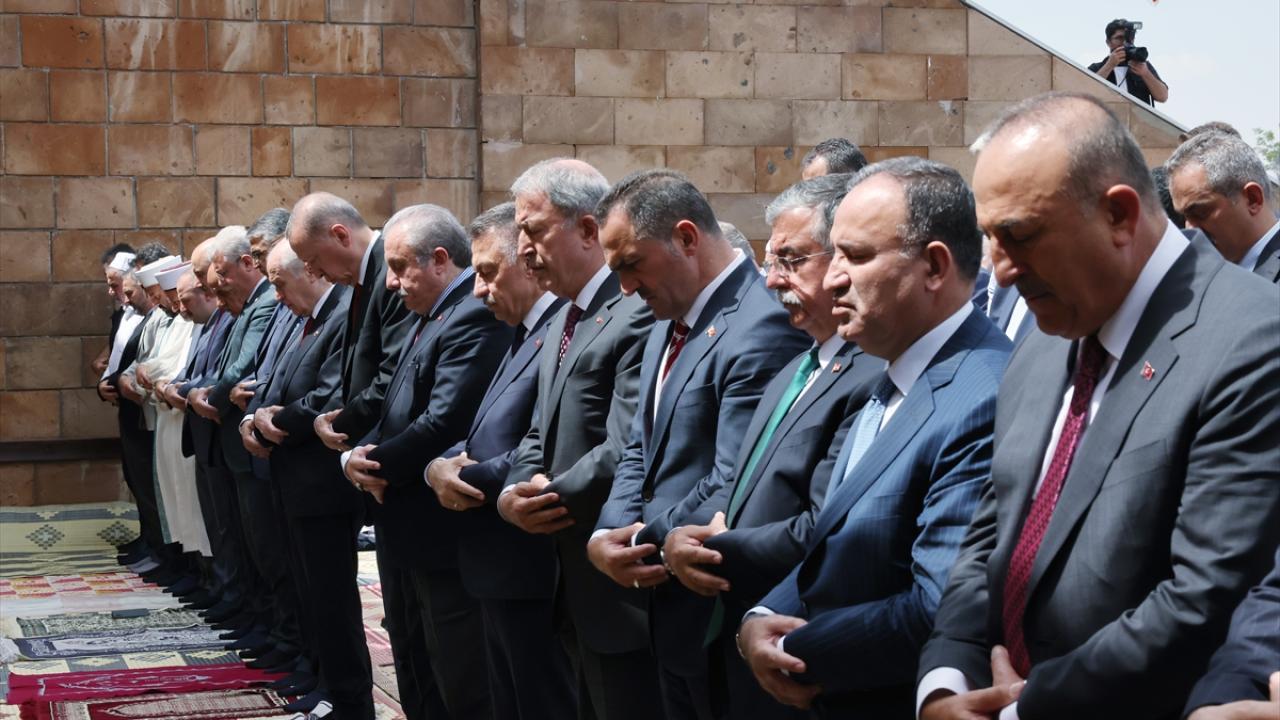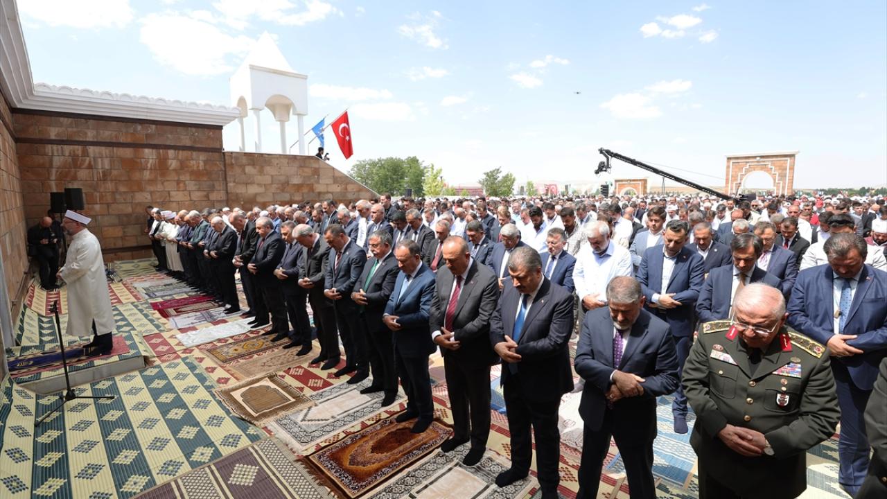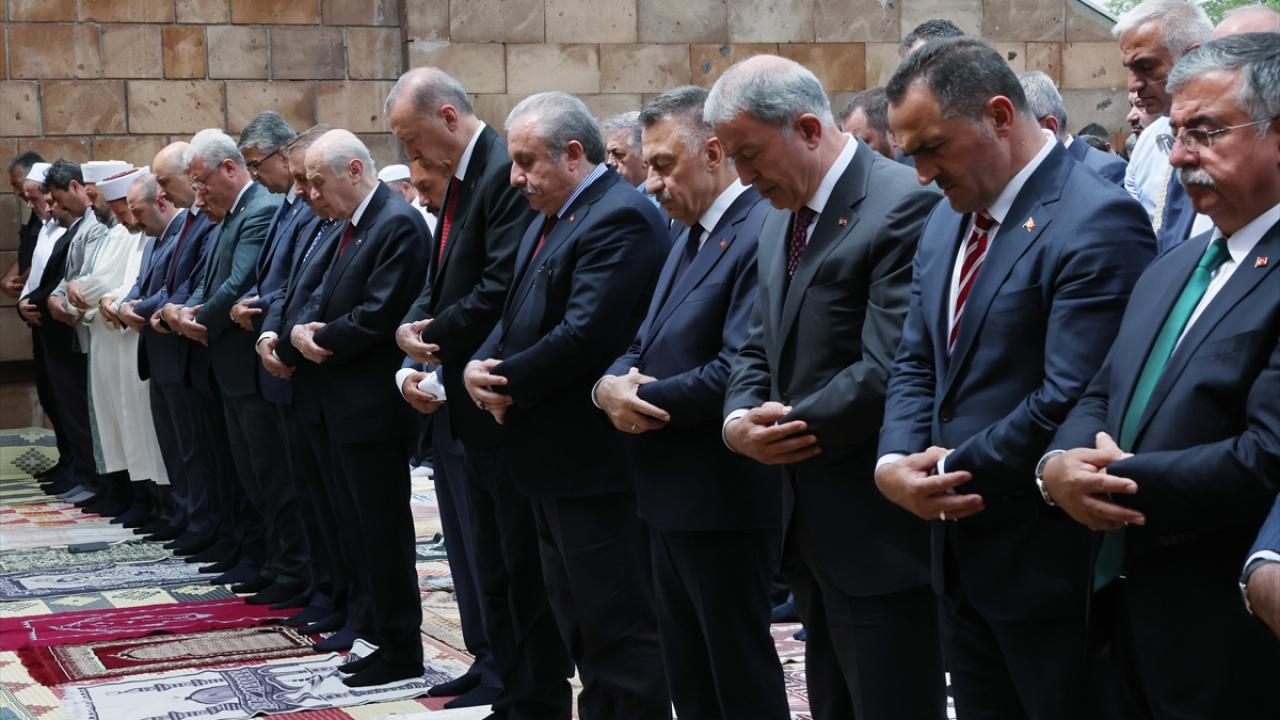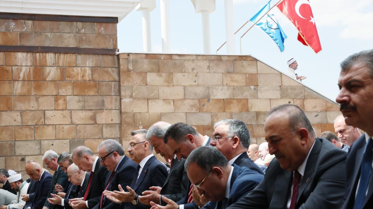 Diyanet İşleri Başkanı Ali Erbaş`ın kıldırdığı cuma namazında Cumhurbaşkanı Erdoğan`a, TBMM Başkanı Mustafa Şentop, Cumhurbaşkanı Yardımcısı Fuat Oktay, Adalet Bakanı Bekir Bozdağ, Dışişleri Bakanı Mevlüt Çavuşoğlu, İçişleri Bakanı Süleyman Soylu, Hazine ve Maliye Bakanı Nureddin Nebati, Kültür ve Turizm Bakanı Mehmet Nuri Ersoy, Milli Savunma Bakanı Hulusi Akar, Milli Eğitim Bakanı Mahmut Özer, Sağlık Bakanı Fahrettin Koca, Sanayi ve Teknoloji Bakanı Mustafa Varank, Ulaştırma ve Altyapı Bakanı Adil Karaismailoğlu, Tarım ve Orman Bakanı Vahit Kirişci, Ticaret Bakanı Mehmet Muş, Genelkurmay Başkanı Orgeneral Yaşar Güler ve kuvvet komutanları ile AK Parti Genel Başkanvekili Binali Yıldırım da eşlik etti.
