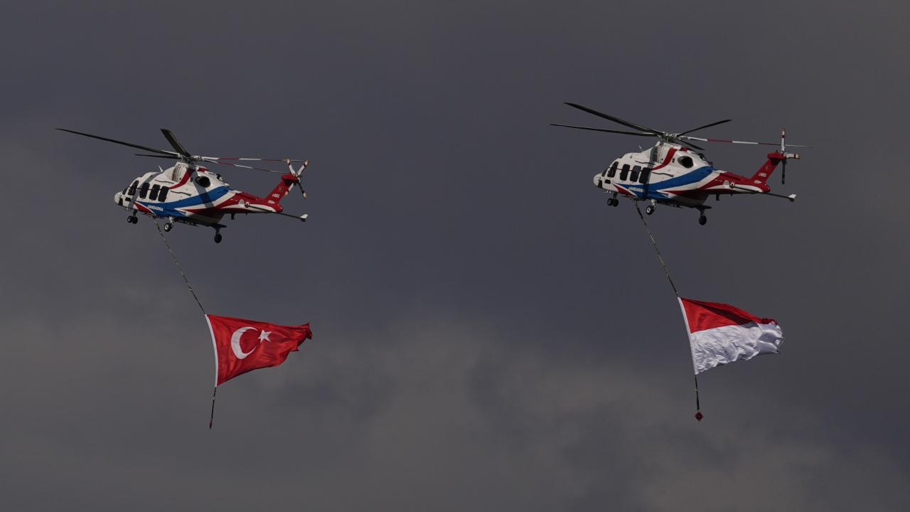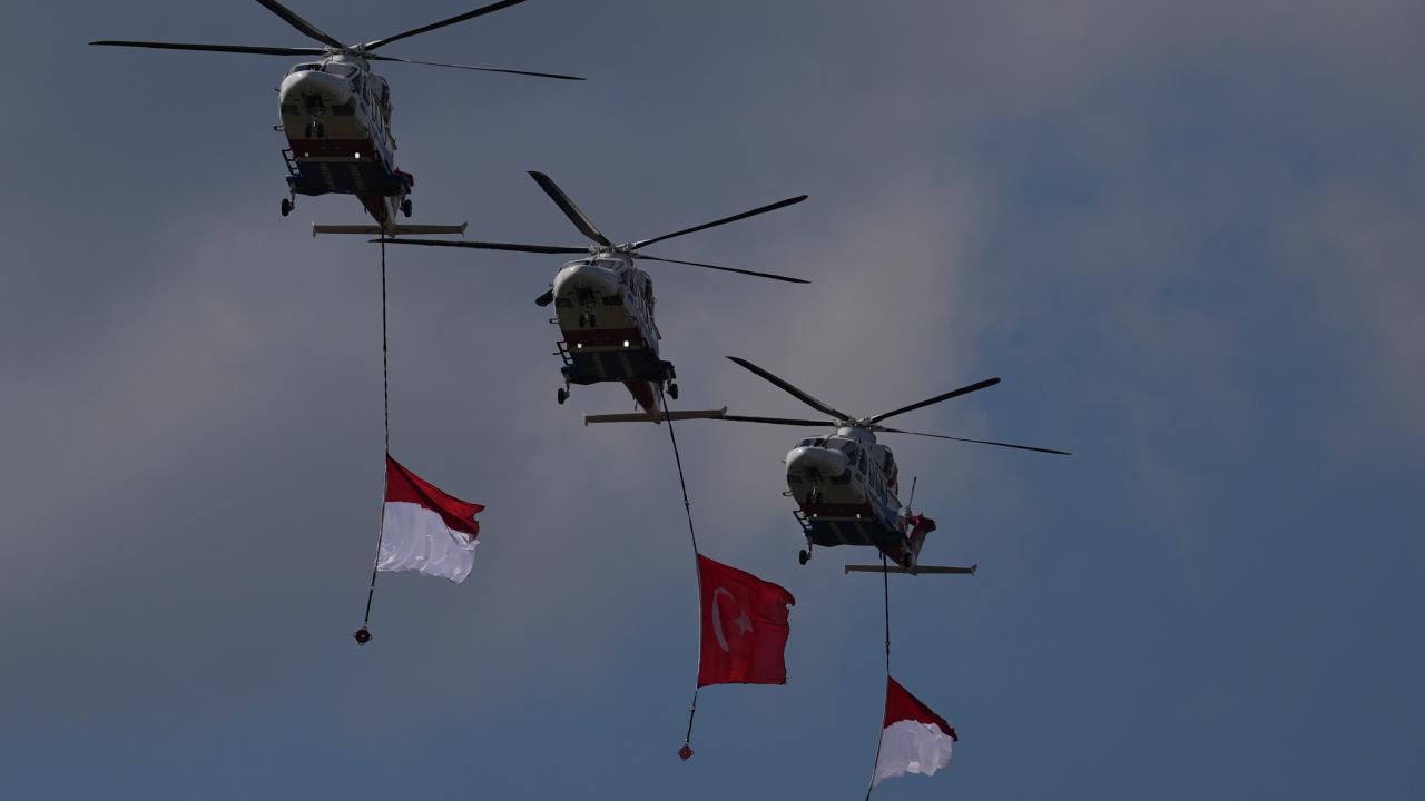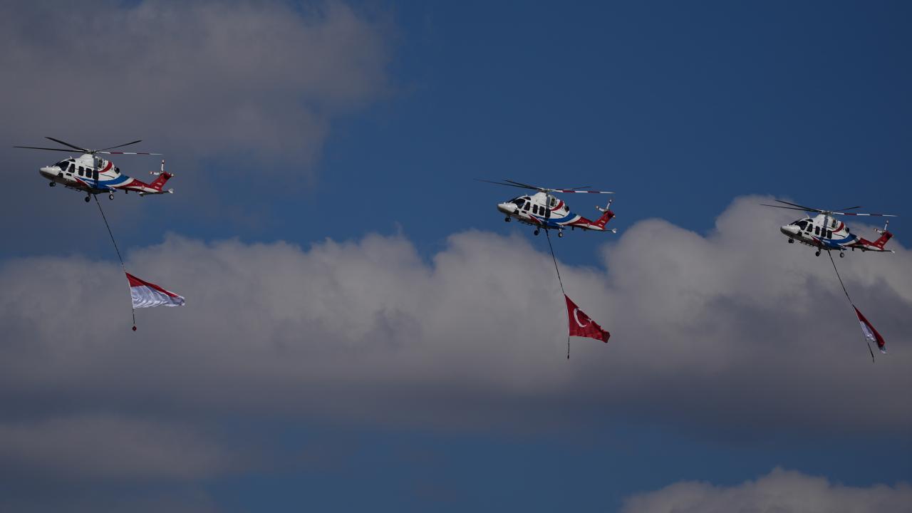 Türk ve Endonezya bayrakları taşıyan 3 Gökbey helikopteri Cumhurbaşkanlığı Külliyesi çevresinde gösteri uçuşu yaptı.