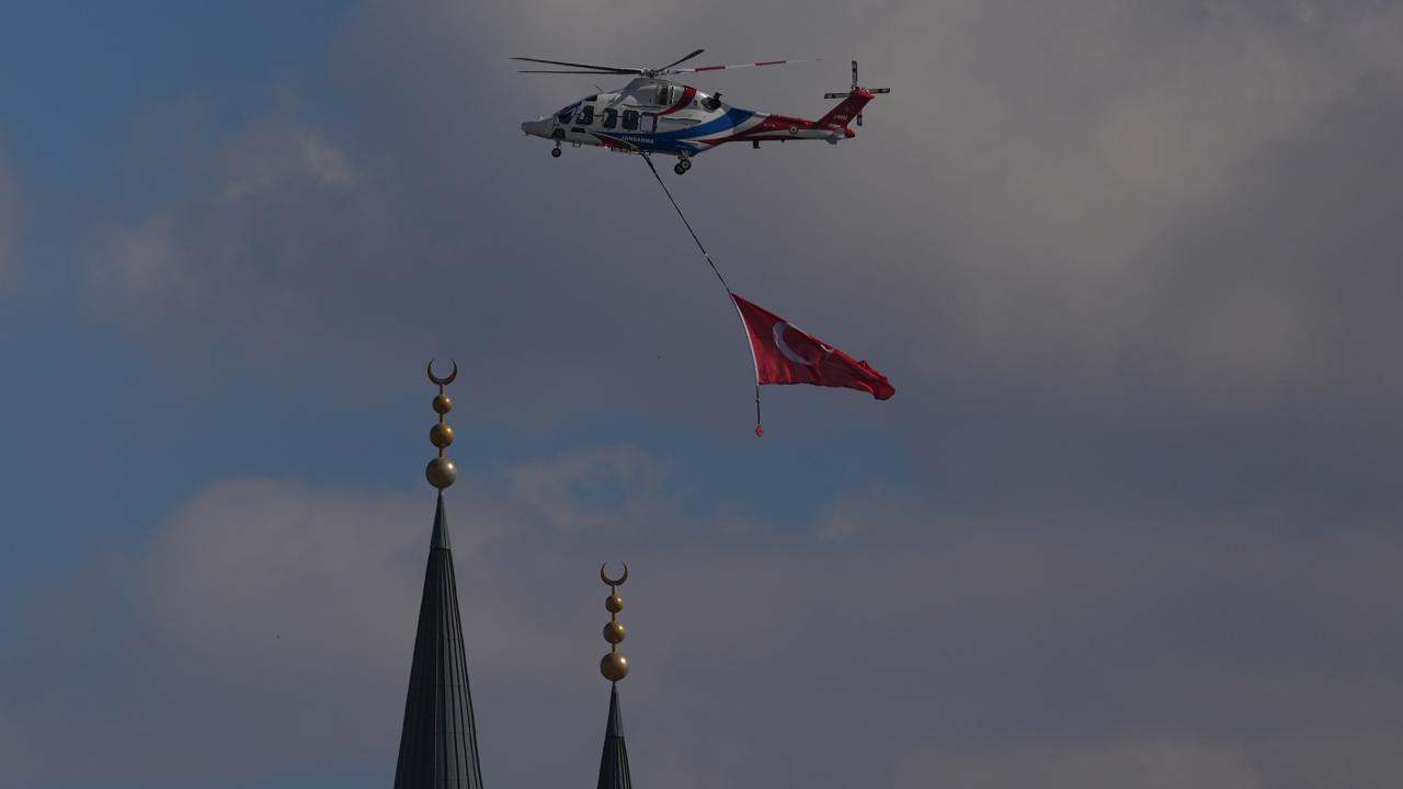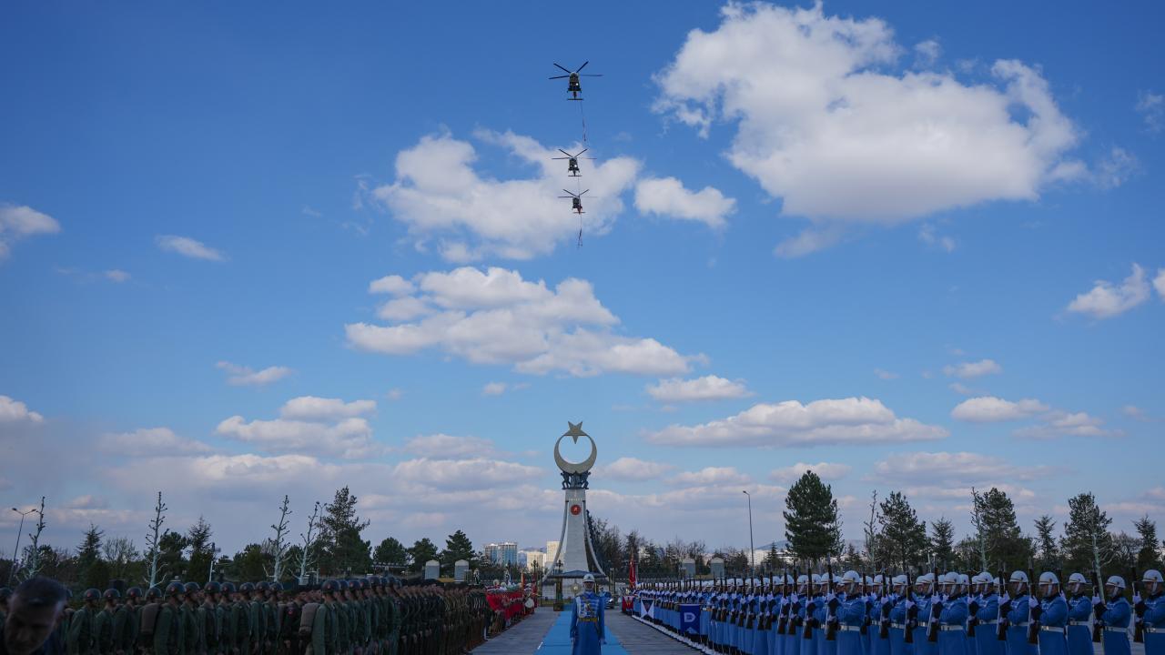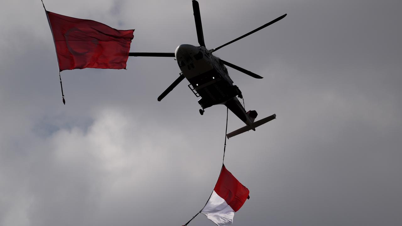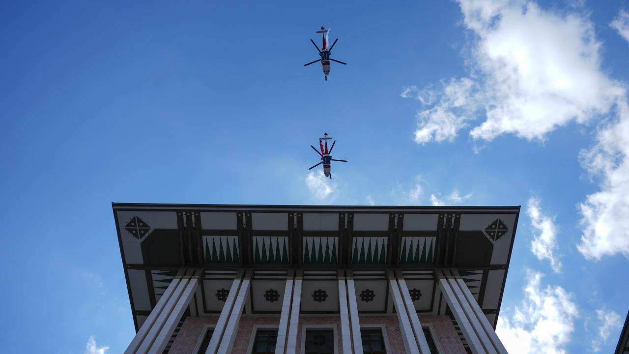 Türk ve Endonezya bayrakları taşıyan 3 Gökbey helikopteri Cumhurbaşkanlığı Külliyesi çevresinde gösteri uçuşu yaptı.