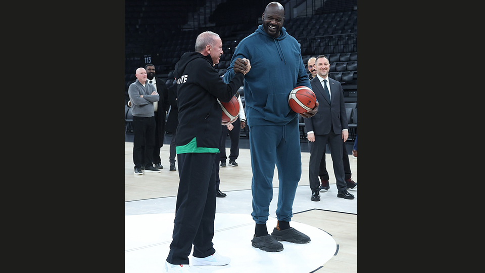 İstanbul`da Turkcell Basketbol Gelişim Merkezi`nde basketbol oynayan Erdoğan ve O`Neal, basketbol toplarını imzaladı.