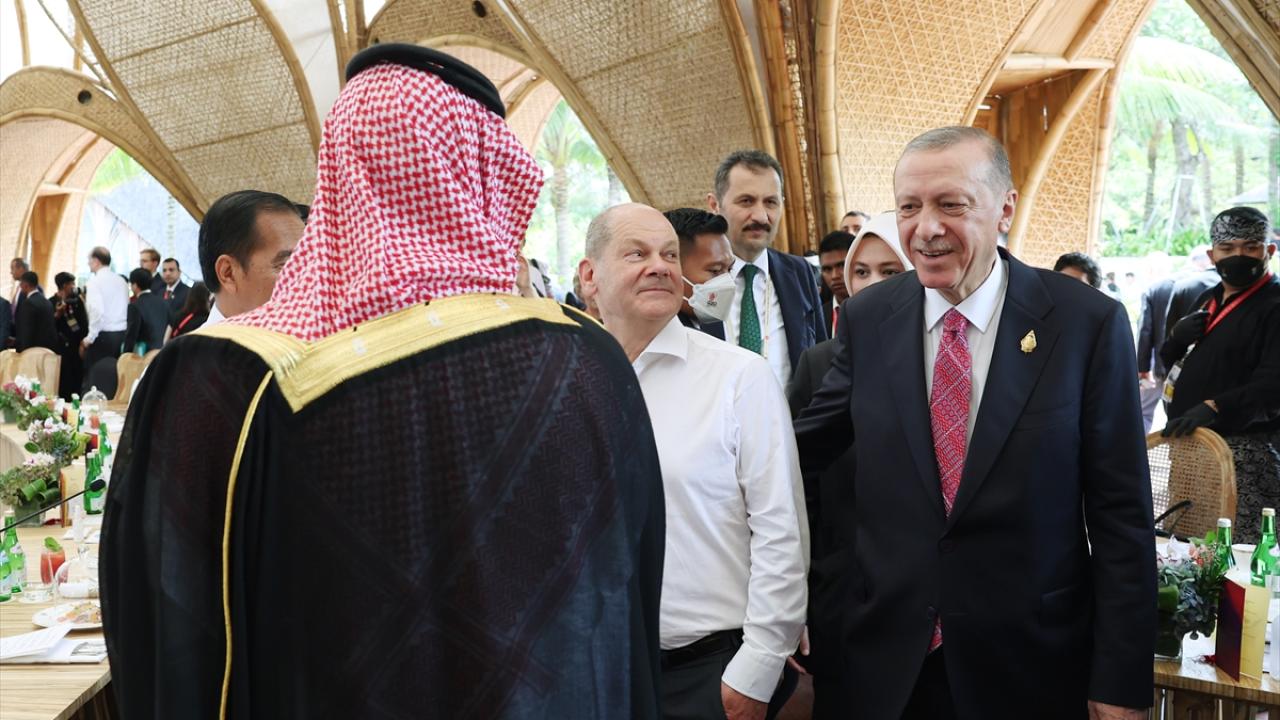 Erdoğan, basına kapalı yemek öncesi Almanya Başbakanı Olaf Scholz ve Suudi Arabistan Veliaht Prensi Muhammed Bin Selman ile sohbet etti.