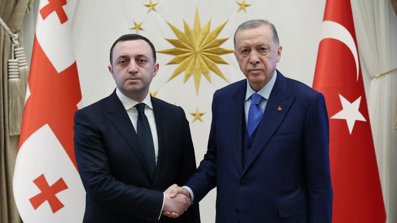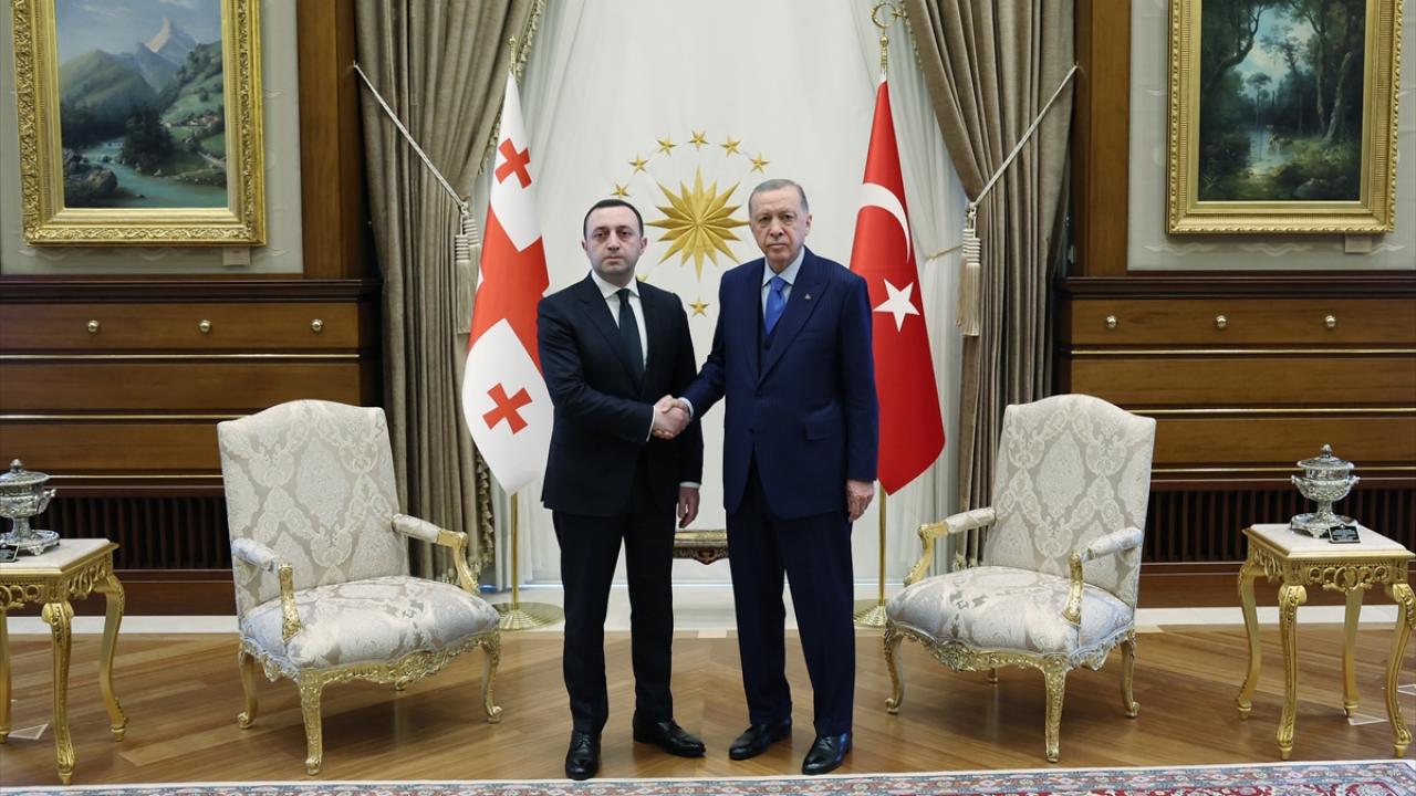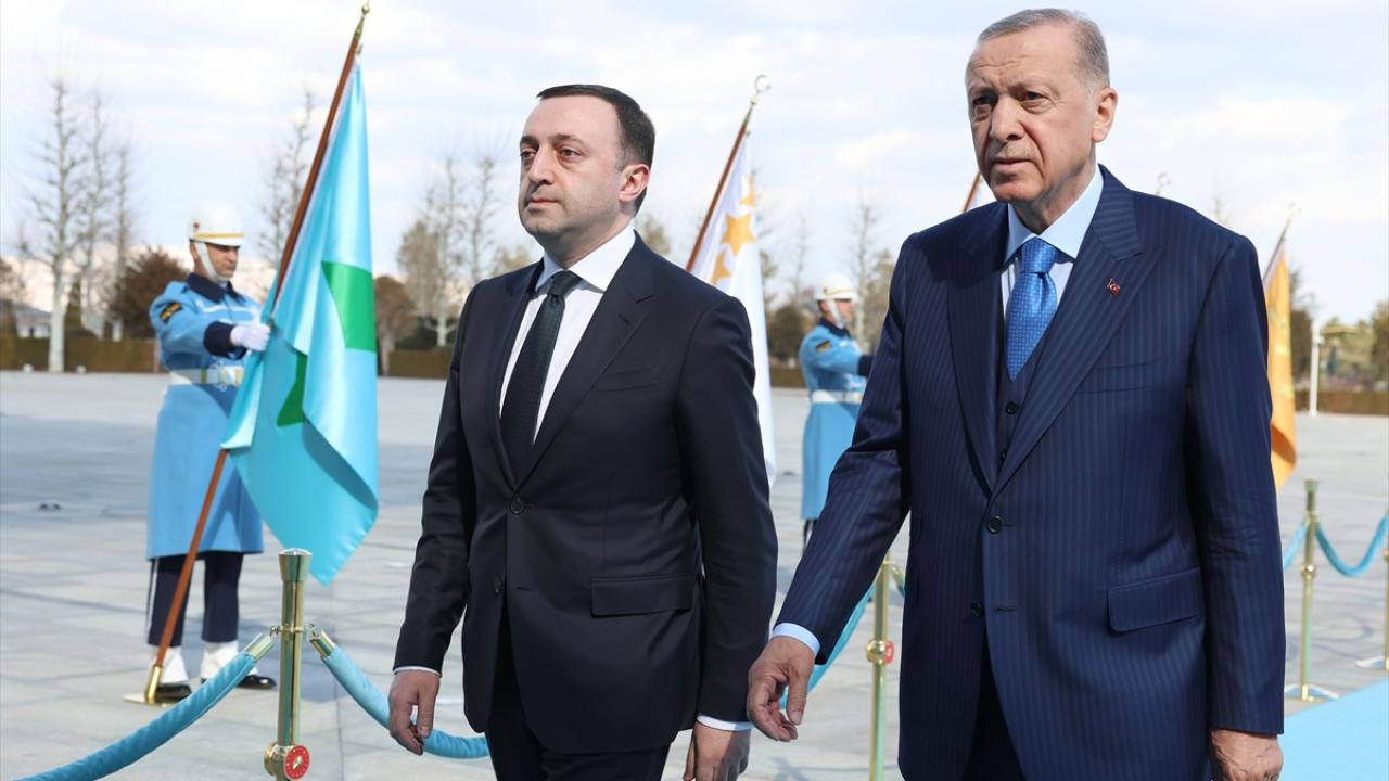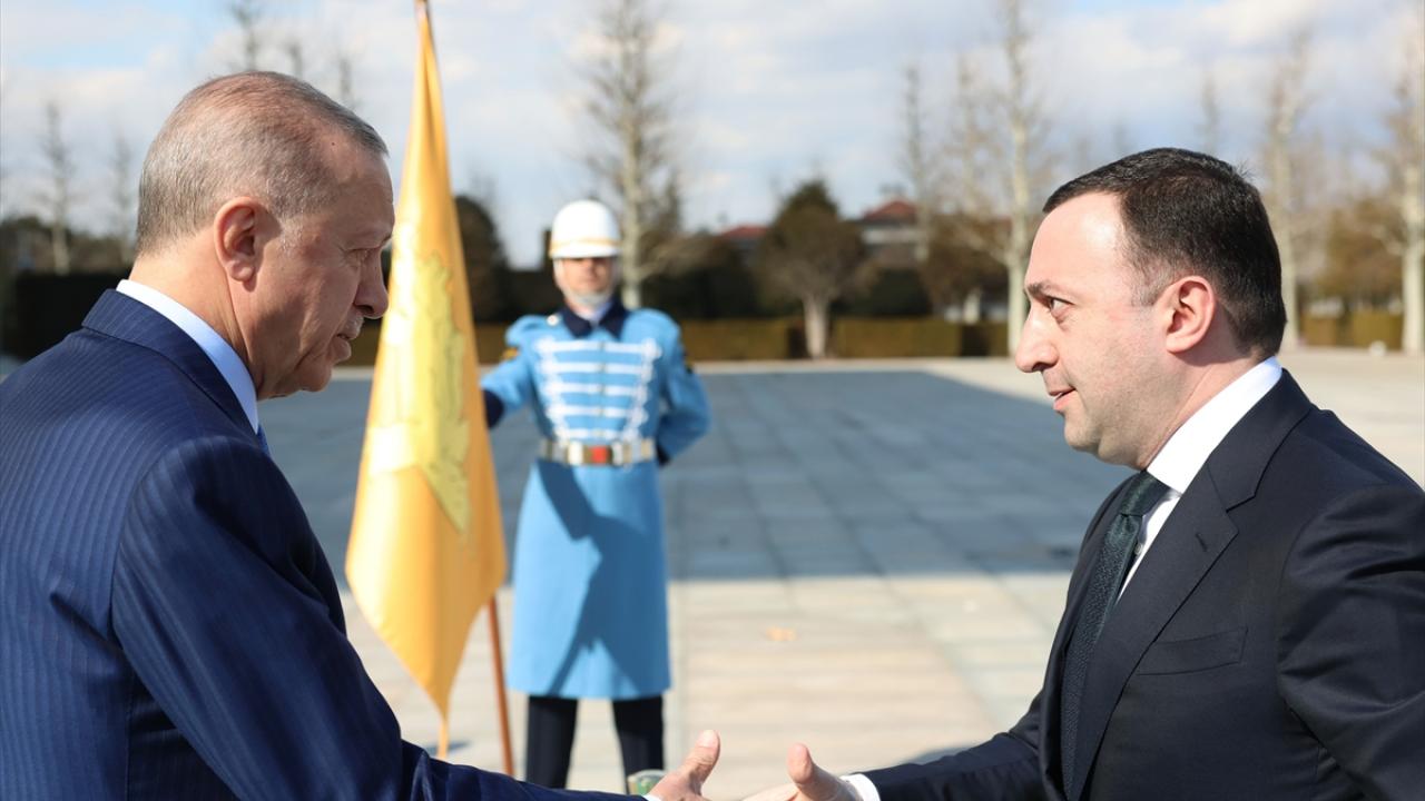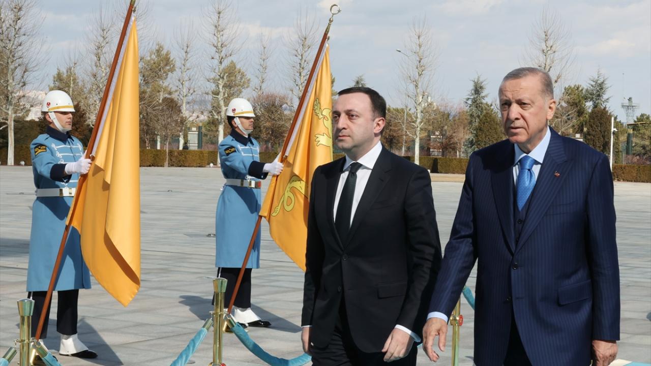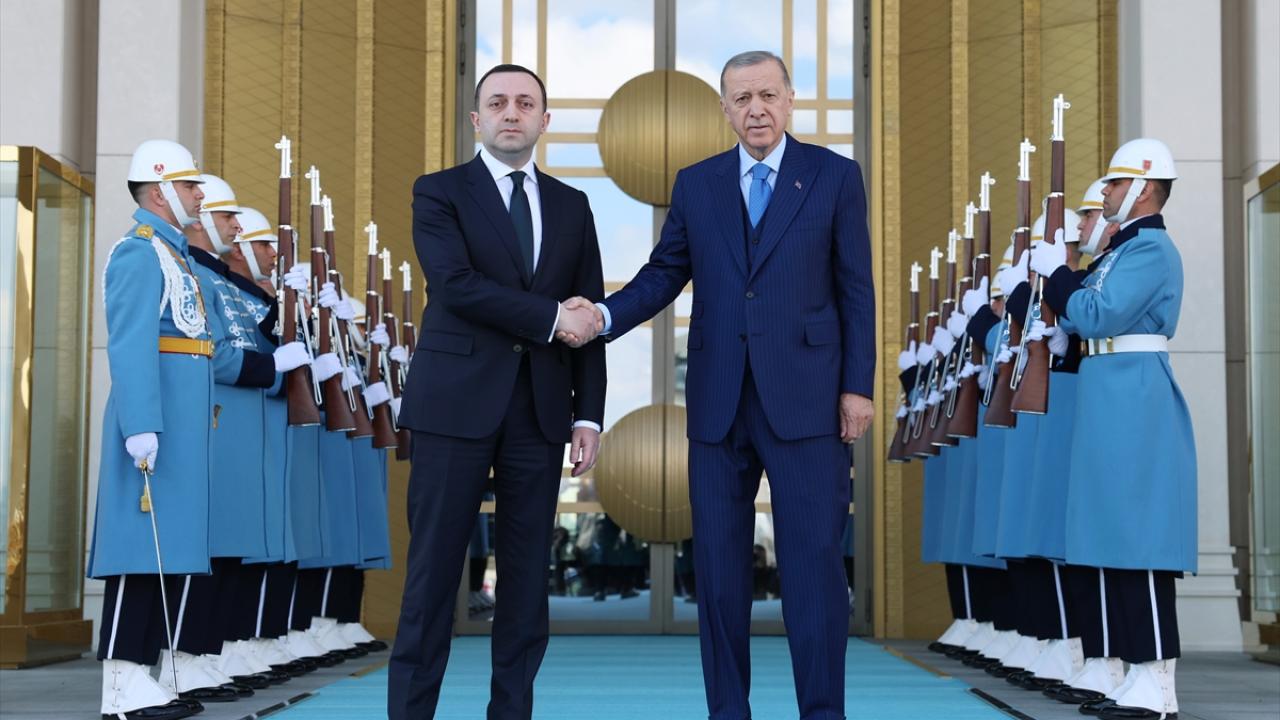 Tarihte kurulan 16 Türk devletini temsil eden bayraklar ve askerlerin de yer aldığı karşılamada, Cumhurbaşkanı Erdoğan ve Garibaşvili, merdivenlerde Türkiye ve Gürcistan bayrakları önünde gazetecilere poz verdi.
