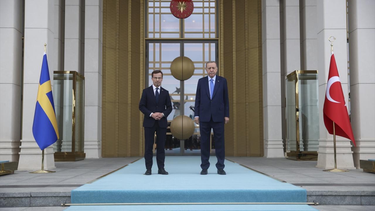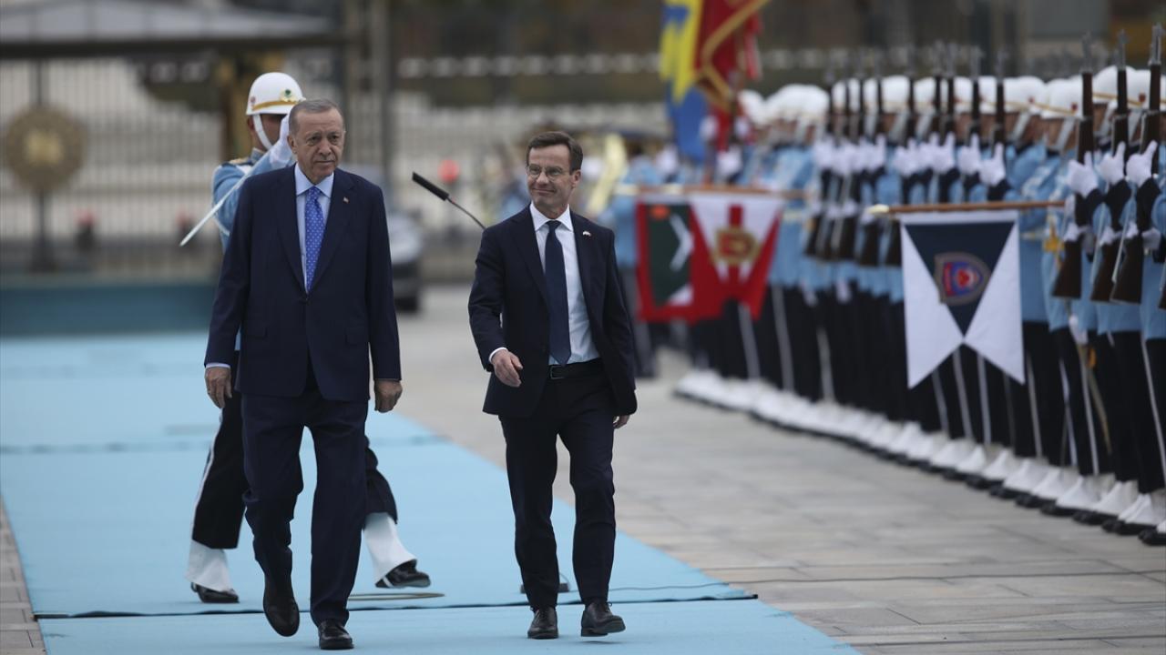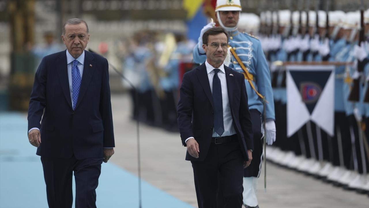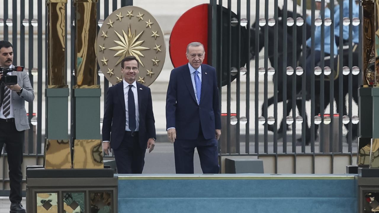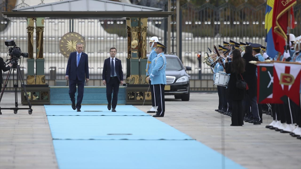 Erdoğan ve Kristersson`un tören alanındaki yerlerini almalarının ardından, 21 pare top atışı eşliğinde iki ülke milli marşları çalındı. Kristersson, Muhafız Alayı Tören Kıtası`nı "Merhaba asker" diyerek selamladı.