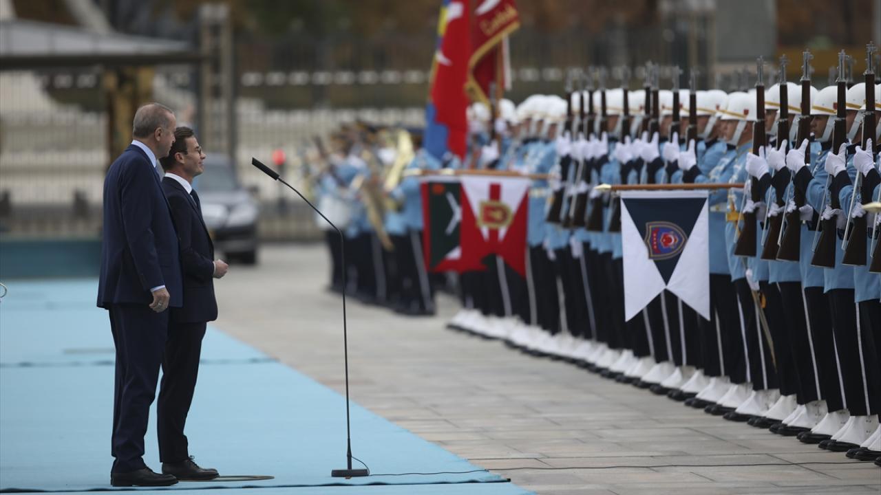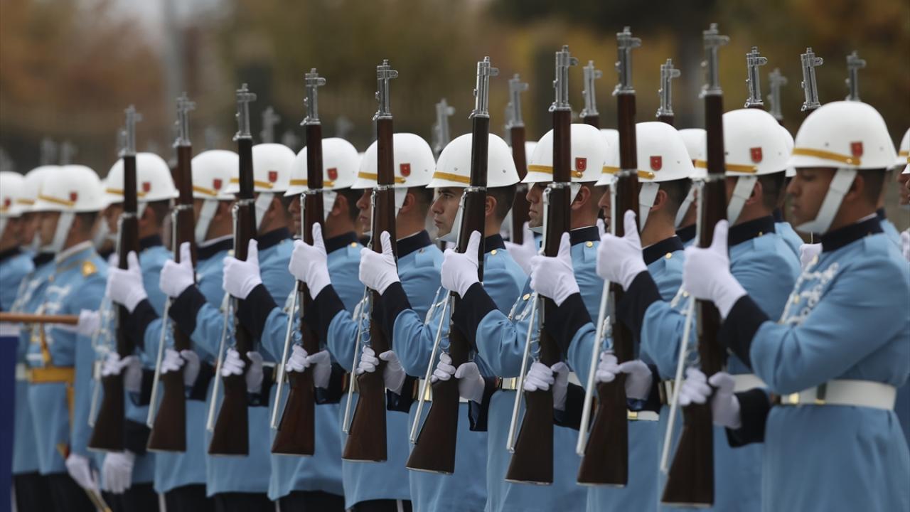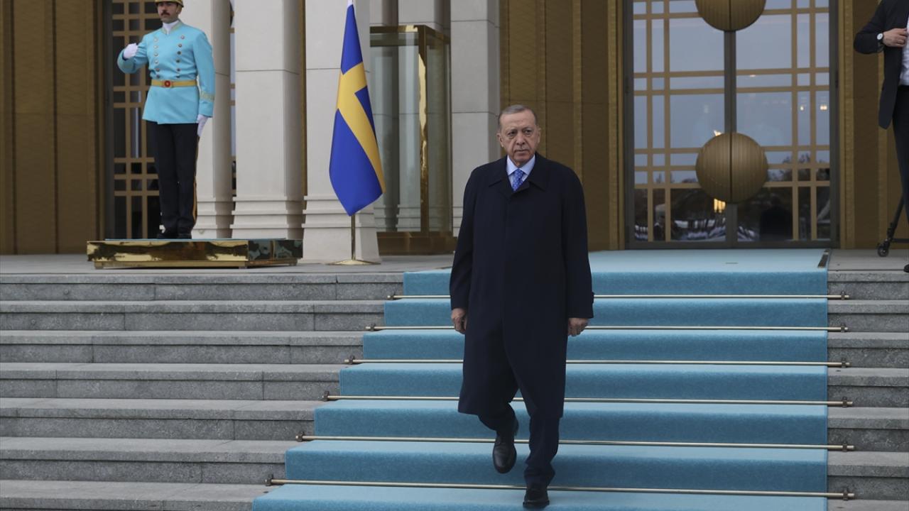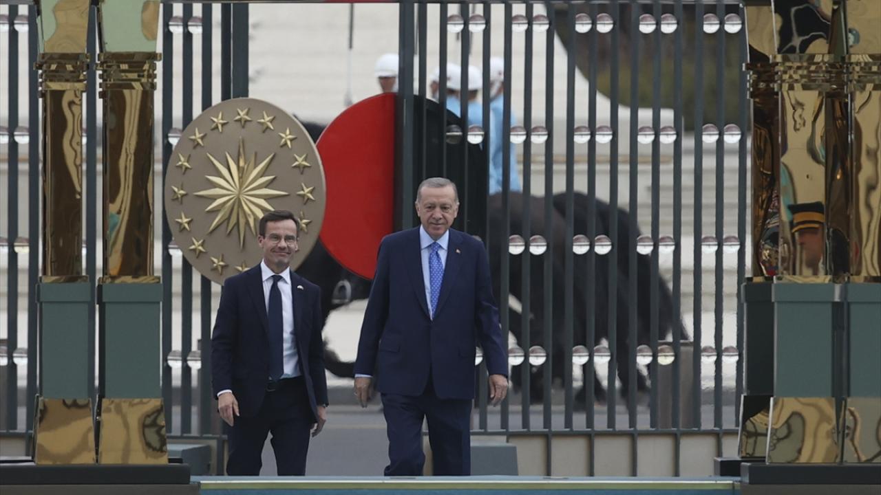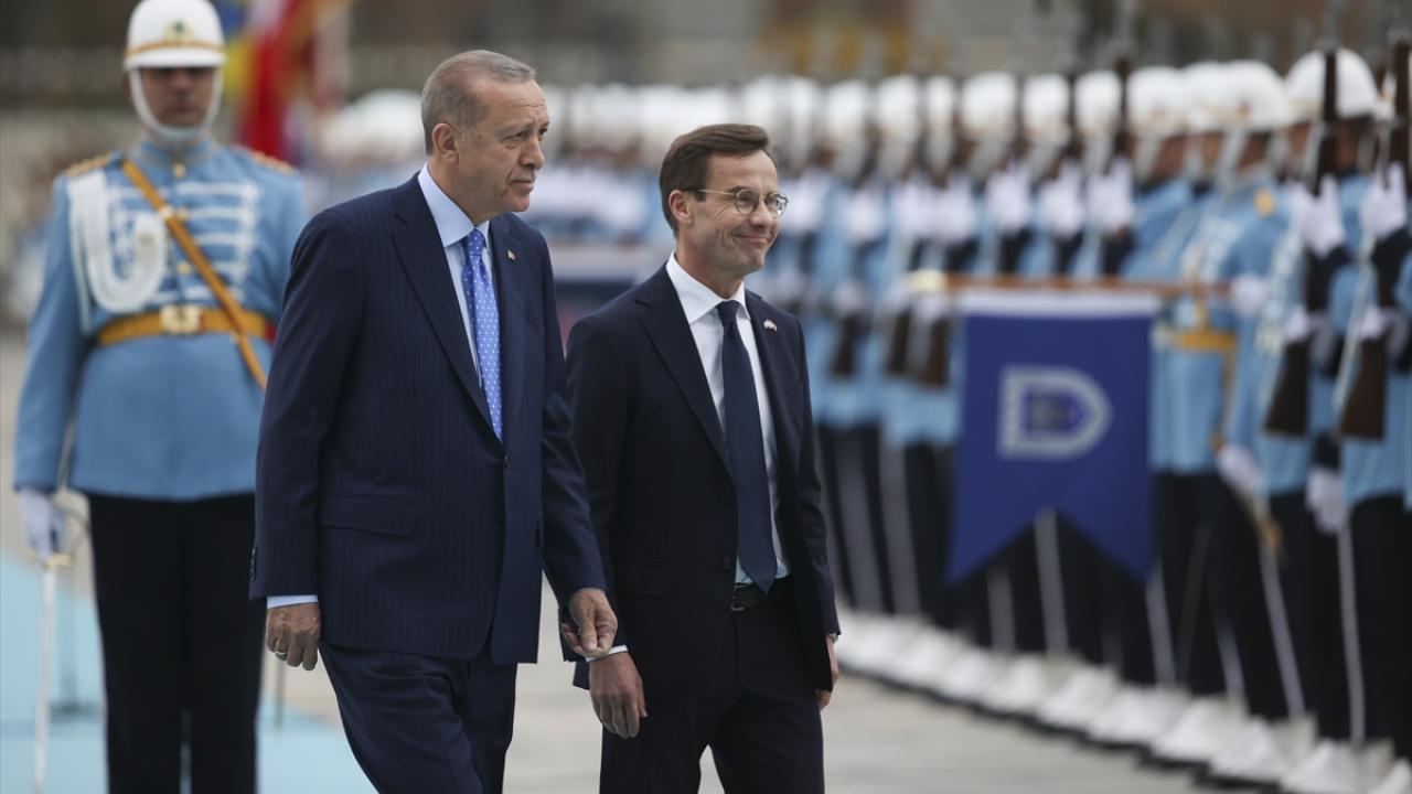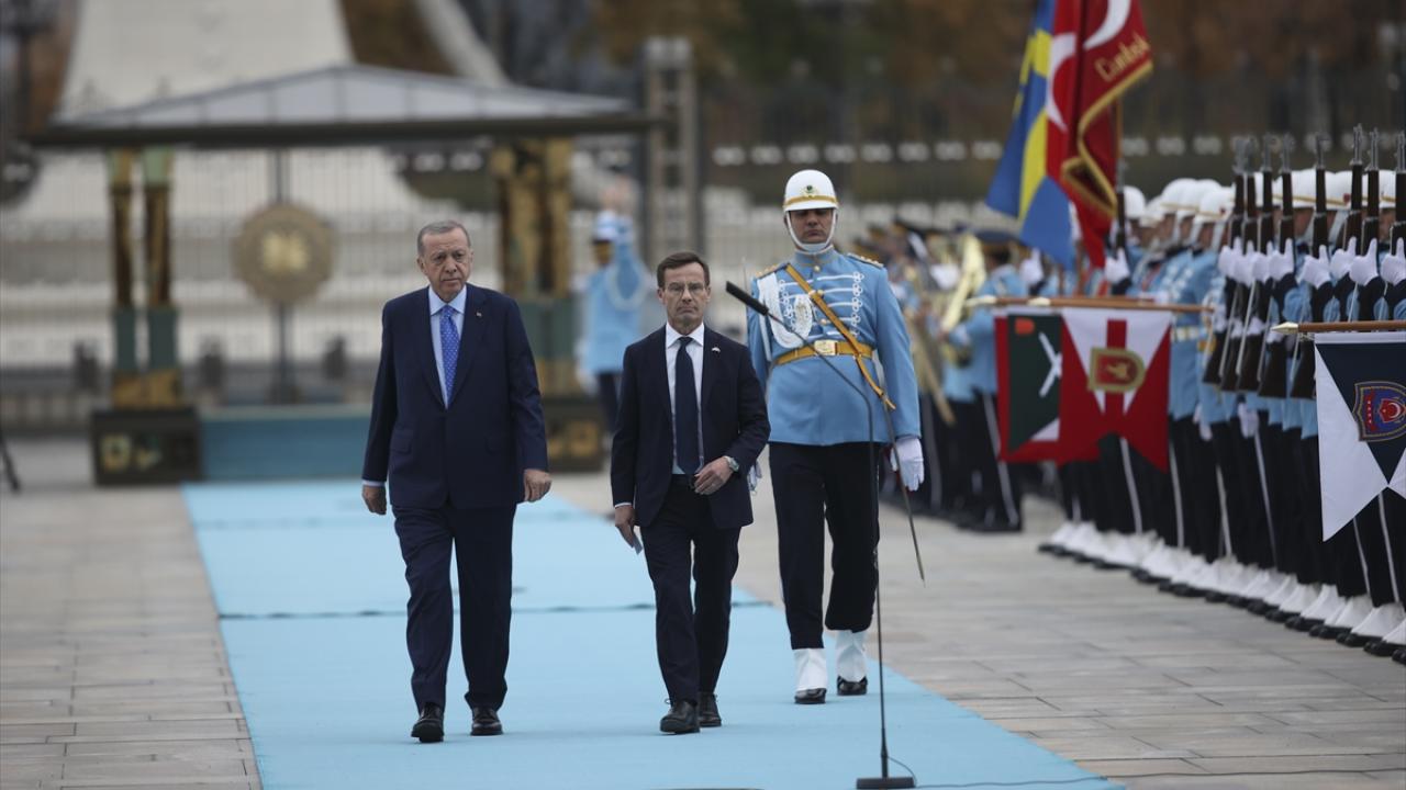 Erdoğan ve Kristersson`un tören alanındaki yerlerini almalarının ardından, 21 pare top atışı eşliğinde iki ülke milli marşları çalındı. Kristersson, Muhafız Alayı Tören Kıtası`nı "Merhaba asker" diyerek selamladı.