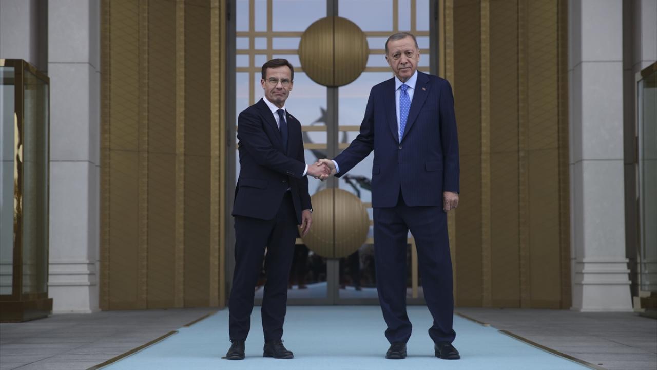 Cumhurbaşkanı Erdoğan, Kristersson`u Cumhurbaşkanlığı Külliyesi`nin ana giriş kapısında karşıladı.