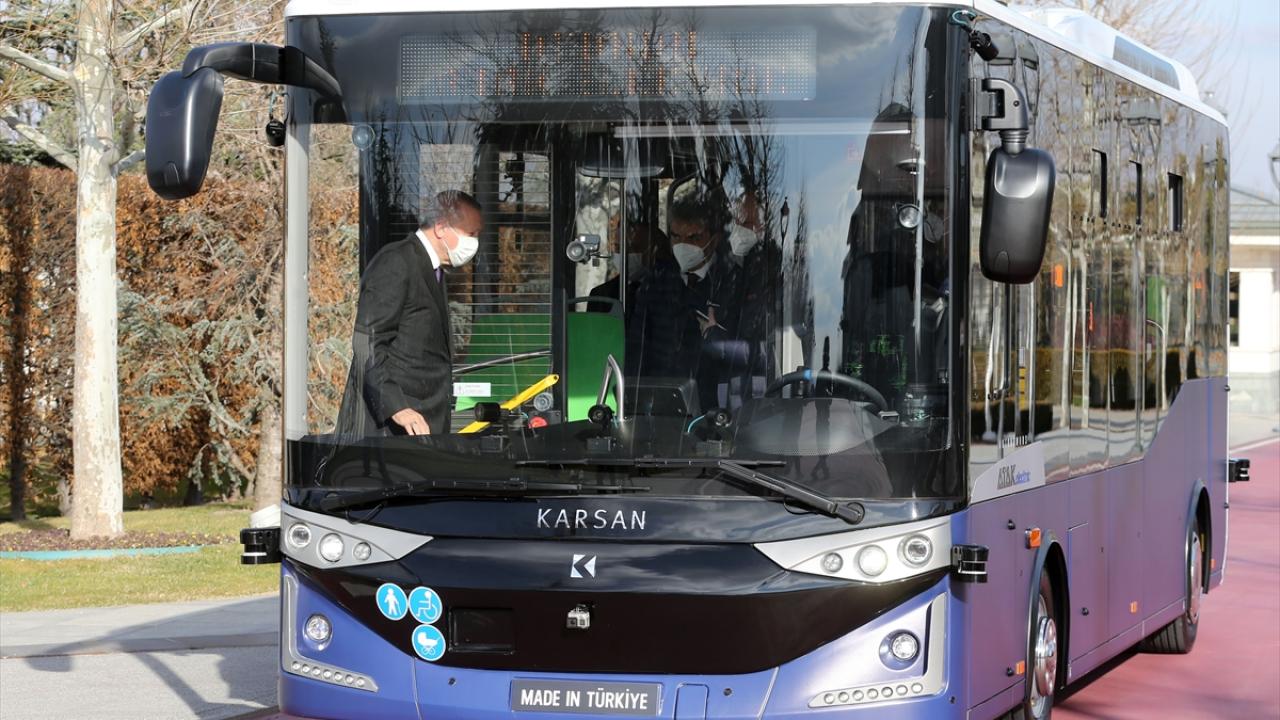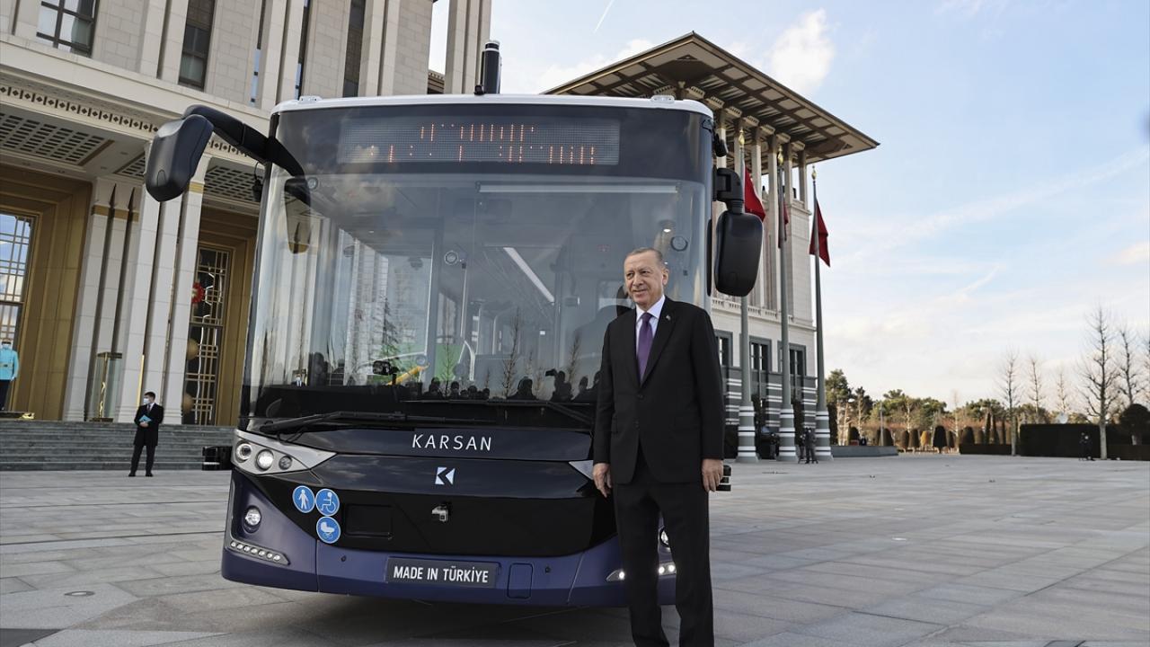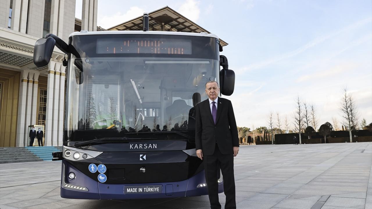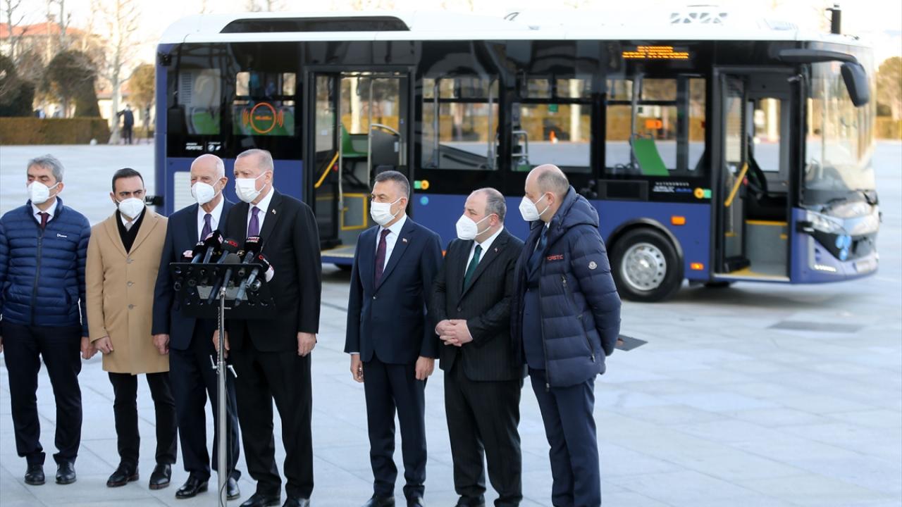 Cumhurbaşkanı Recep Tayyip Erdoğan, Kabine toplantısına, Türk mühendisleri tarafından geliştirilen dünyanın ilk seri üretim 4. seviye sürücüsüz elektrikli otobüsü Atak Electric ile gitti.