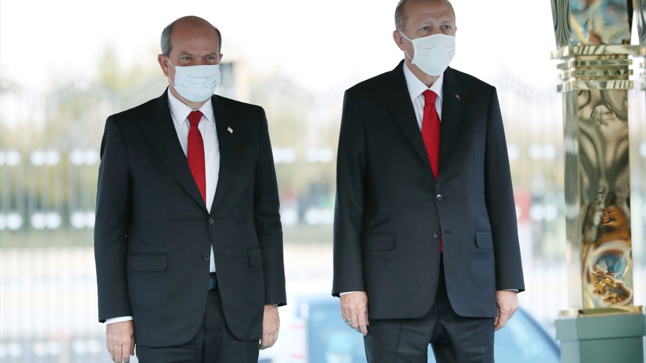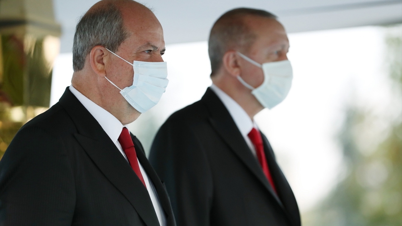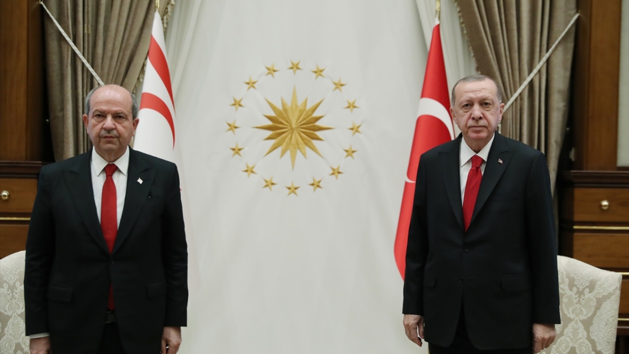 Türkiye ve KKTC bayrakları önünde gazetecilere poz veren Erdoğan ve Tatar daha sonra baş başa görüşmeye geçti.